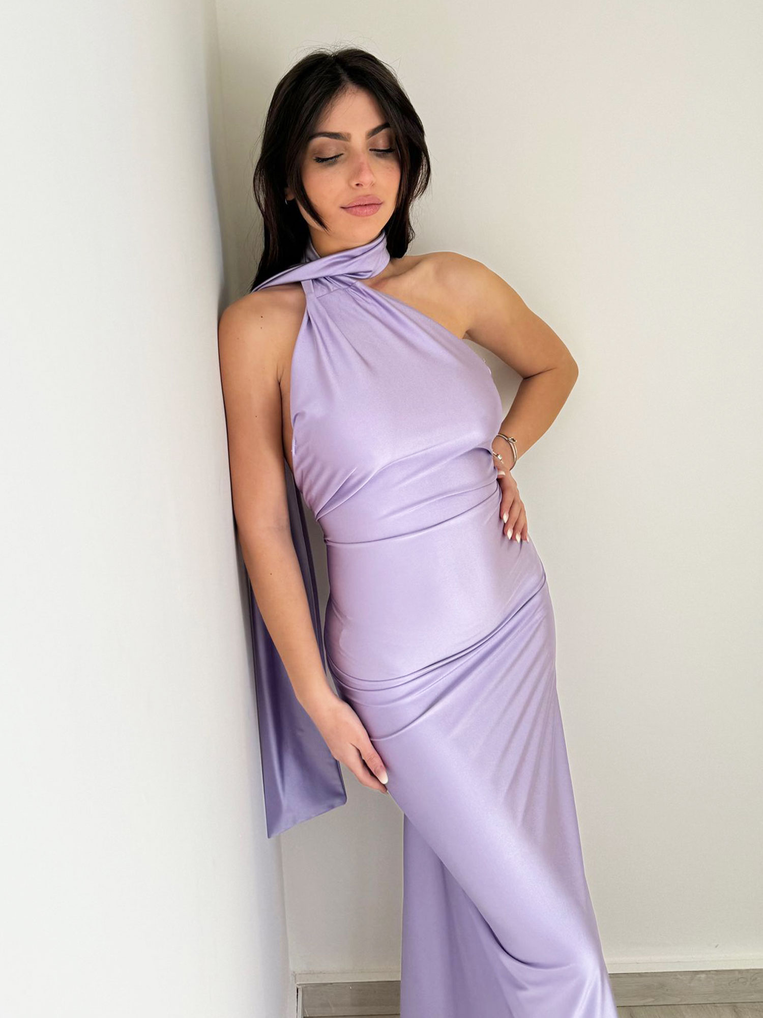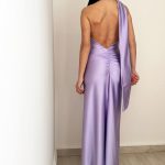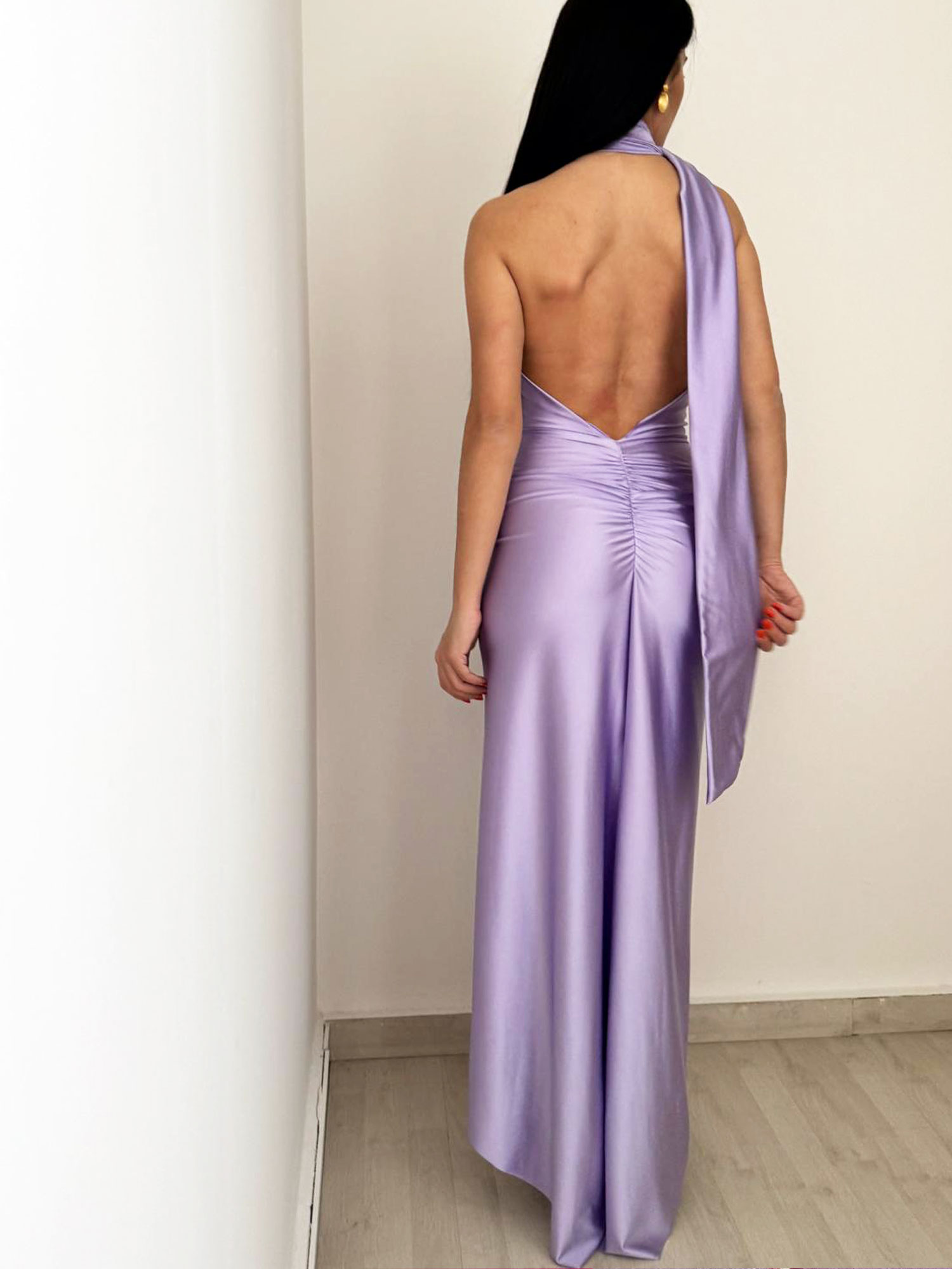 Questo abito lungo glicine, con scollatura americana e schiena scoperta, esalta la silhouette con il suo tessuto elastico e drappeggiato. Il colore vibrante e il fiocco chic sulla spalla lo rendono perfetto per eventi speciali, offrendo un look elegante e sofisticato.