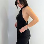Il design è caratterizzato da una raffinata scollatura con fusciacca, che aggiunge un tocco di modernità e originalità. La parte posteriore presenta una seducente apertura che lascia la schiena scoperta, mentre il drappeggio centrale crea un gioco di pieghe che valorizza ulteriormente la figura.