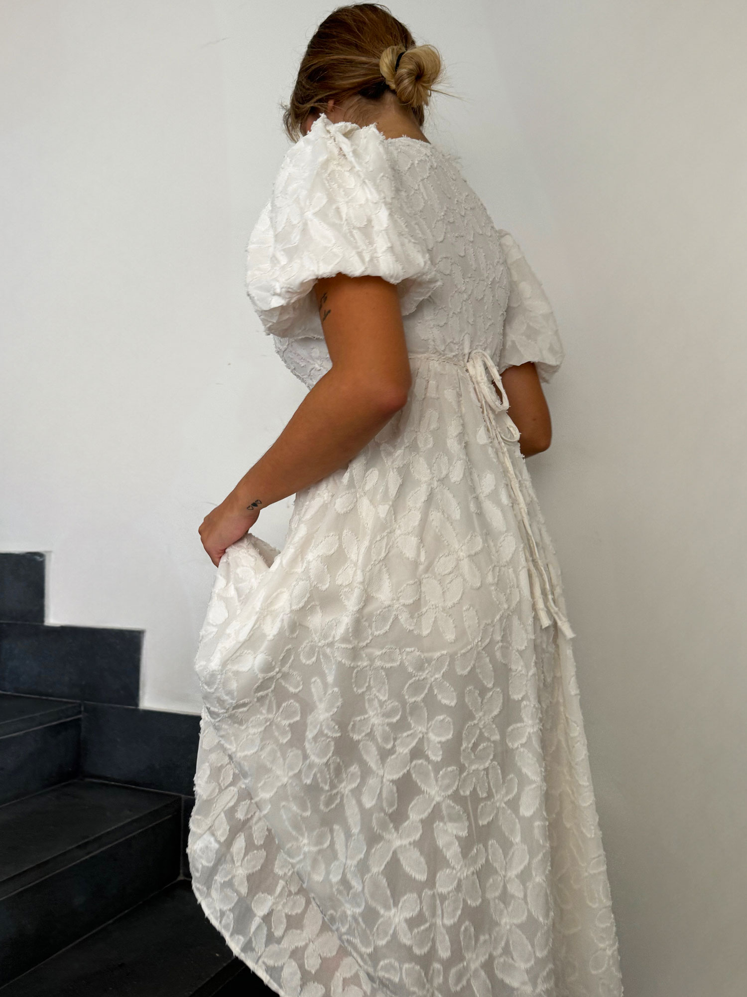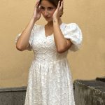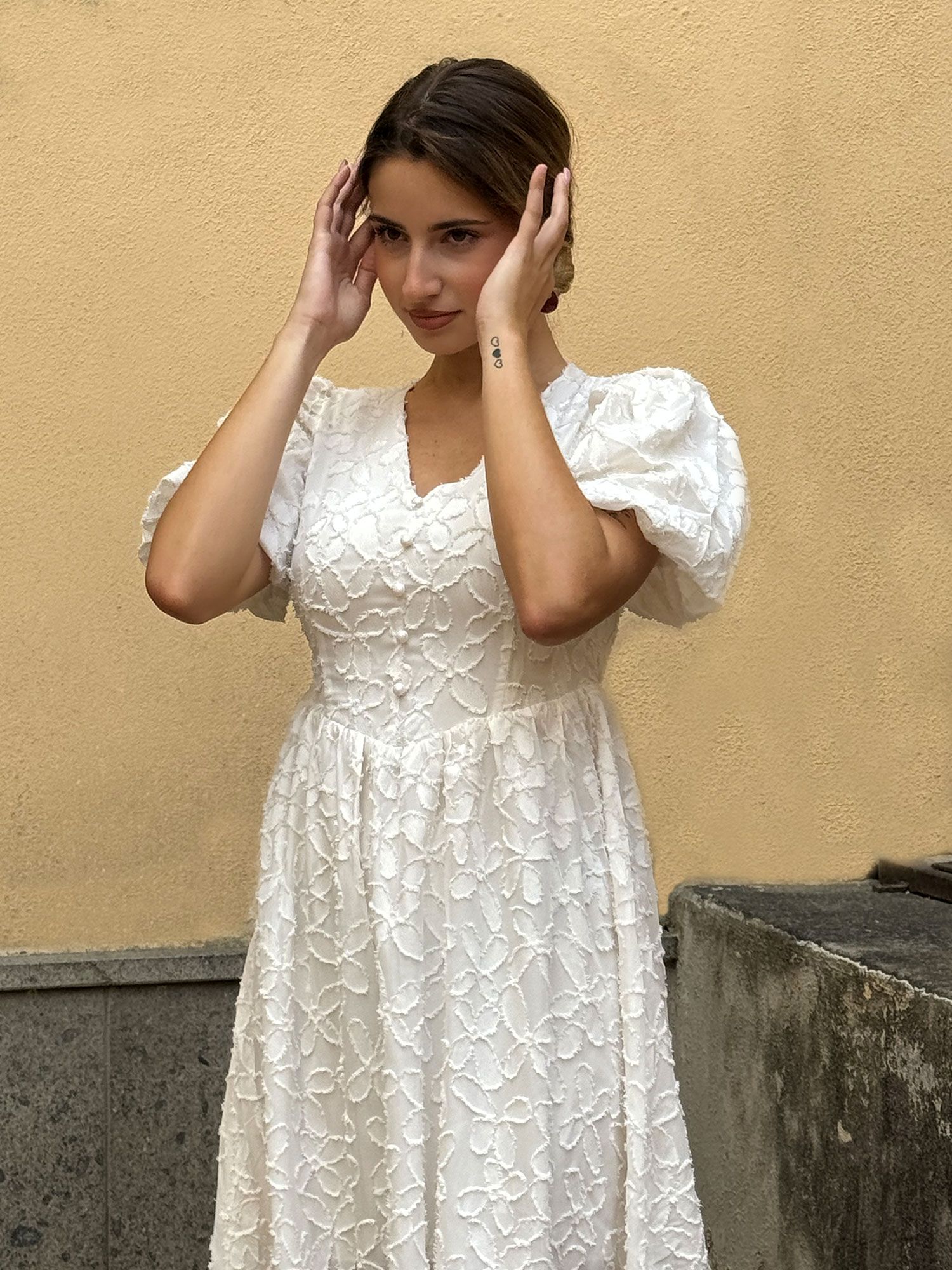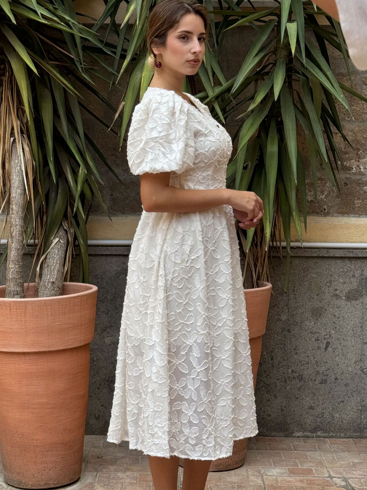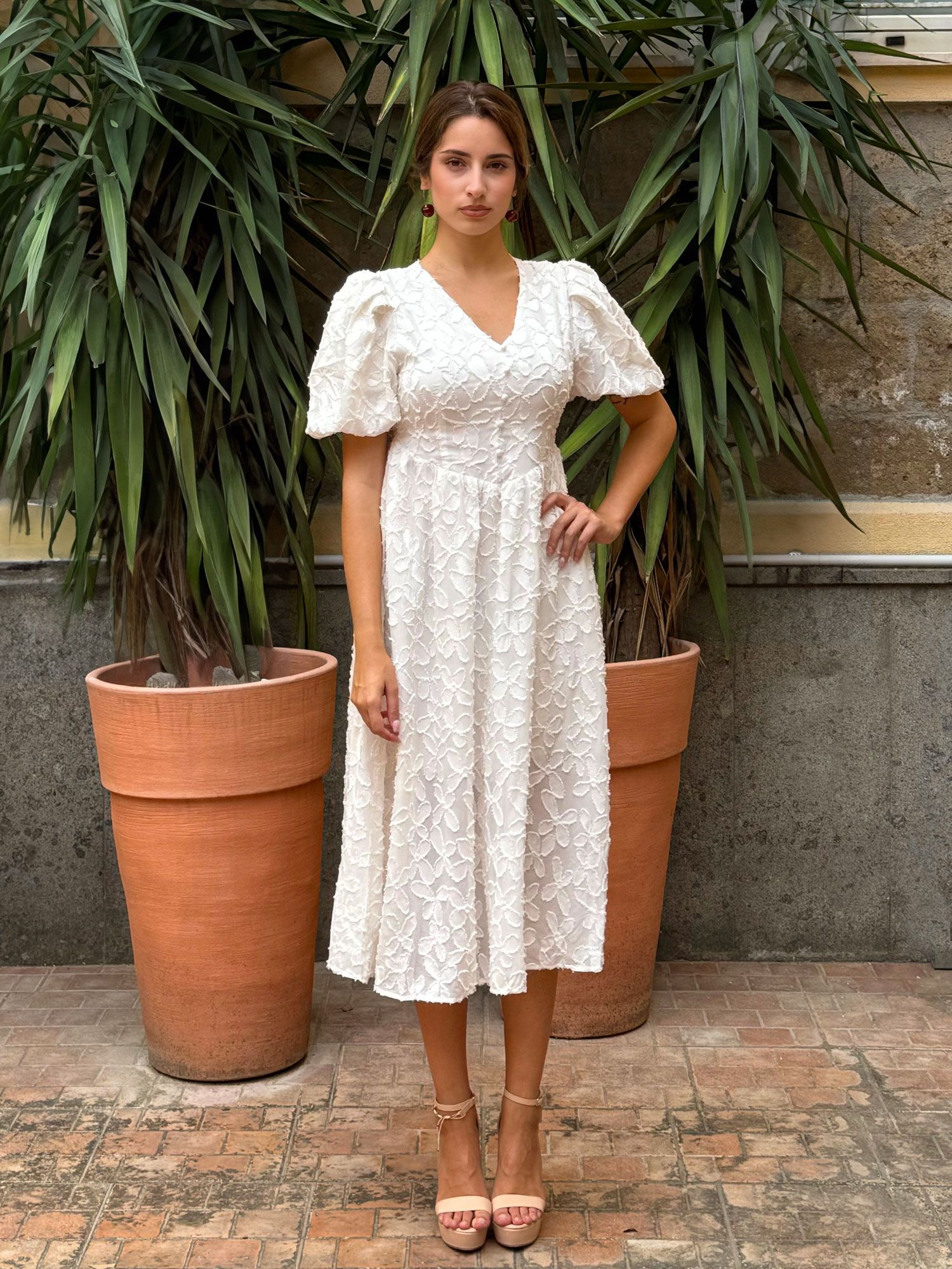 Romantico abito bianco midi, con ricami floreali in rilievo e maniche a sbuffo per un tocco raffinato. La scollatura a V esalta il décolleté, mentre la vita regolabile con laccetti garantisce una perfetta vestibilità per taglie dalla 38 alla 42. Realizzato in tessuto leggero e traspirante, è ideale per eventi come matrimoni, cerimonie e feste estive, offrendo un mix di eleganza e comfort. Un capo femminile e versatile, perfetto per occasioni speciali o per chi ama lo stile chic.