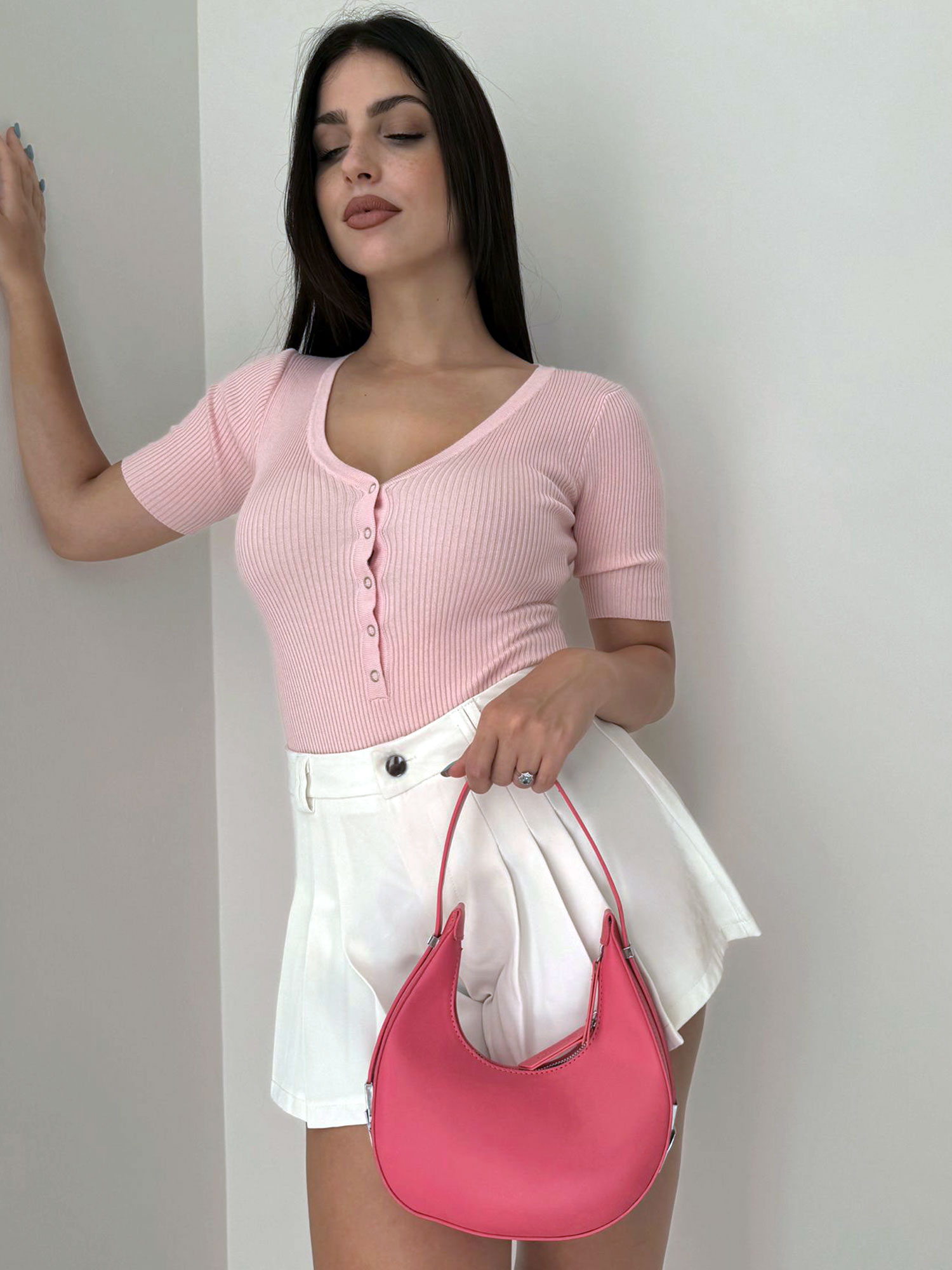 Body a maniche corte rosa pastello, con scollatura a V e bottoni decorativi sul davanti. Realizzato in tessuto morbido ed elasticizzato, offre una vestibilità perfetta e confortevole. Ideale per outfit eleganti e femminili, da abbinare facilmente con diverse opzioni di abbigliamento.