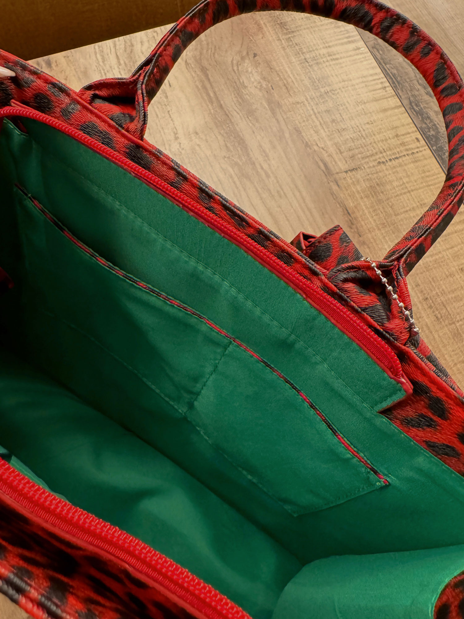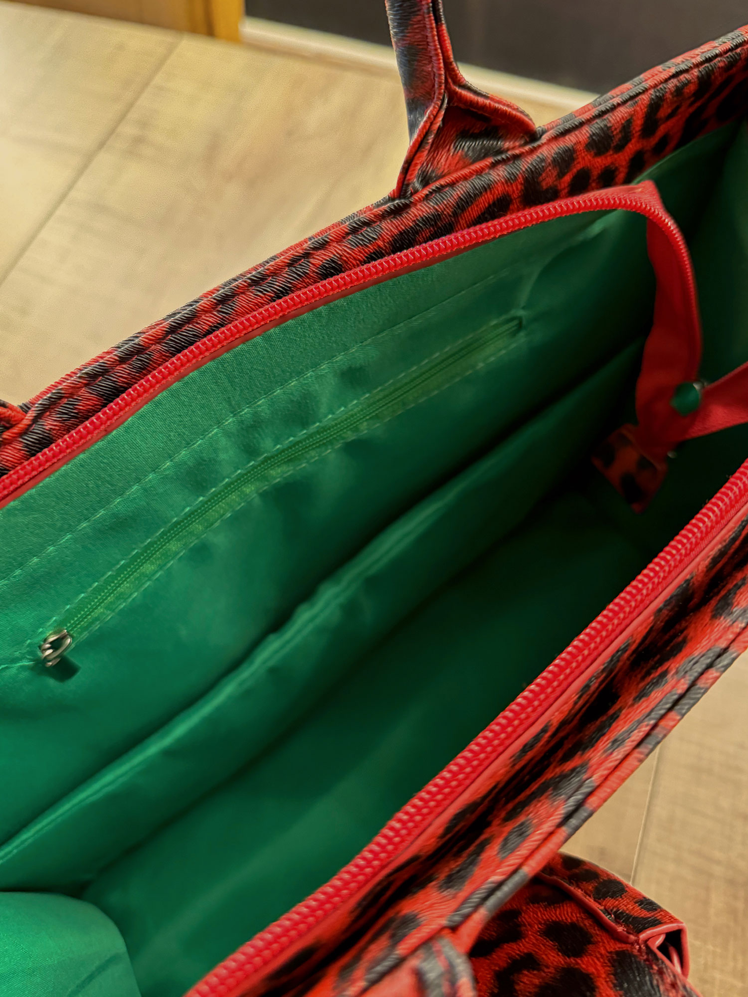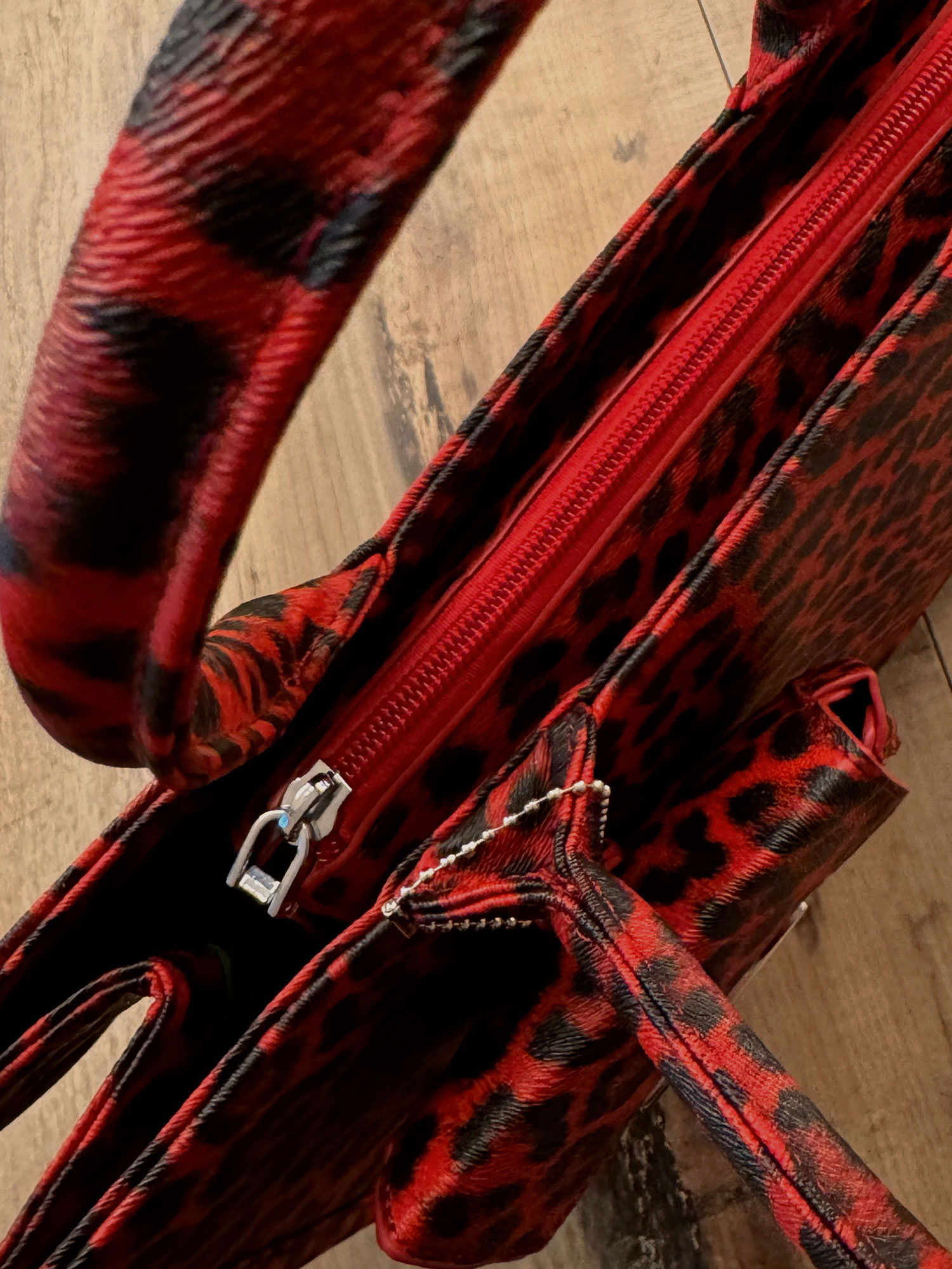 Questa borsa tote a fantasia leopardata rossa e nera è un vero statement di stile. Elegante e spaziosa, combina design audace e funzionalità, con un pratico doppio manico per una portabilità versatile. Completa di una pochette coordinata, ideale per organizzare i tuoi piccoli oggetti o da usare separatamente, è perfetta per affrontare con stile ogni impegno quotidiano, dal lavoro al tempo libero. Un accessorio irresistibile per chi vuole distinguersi con carattere.