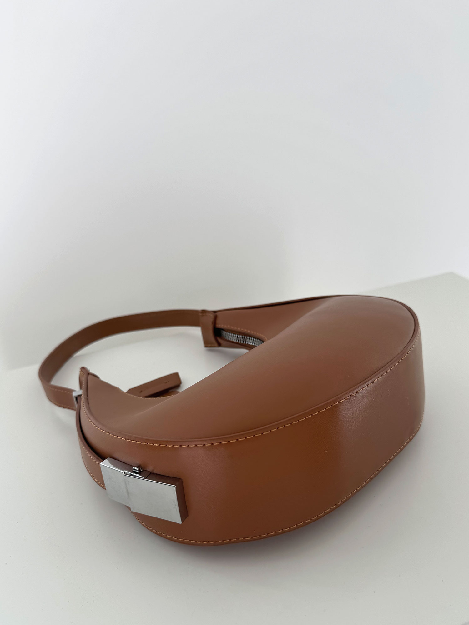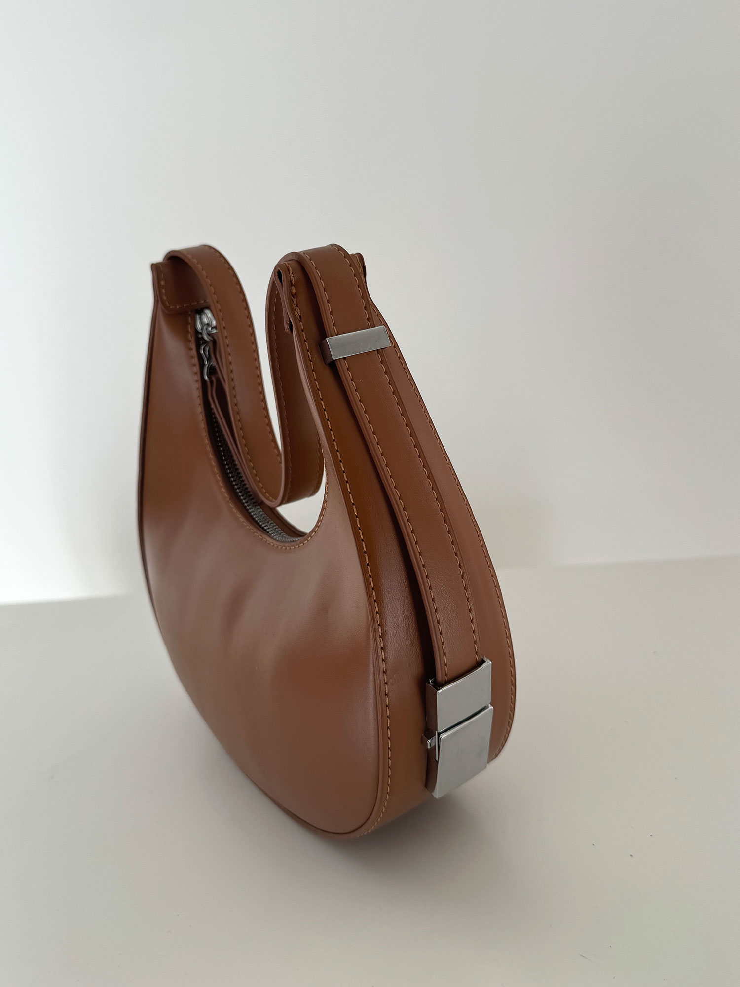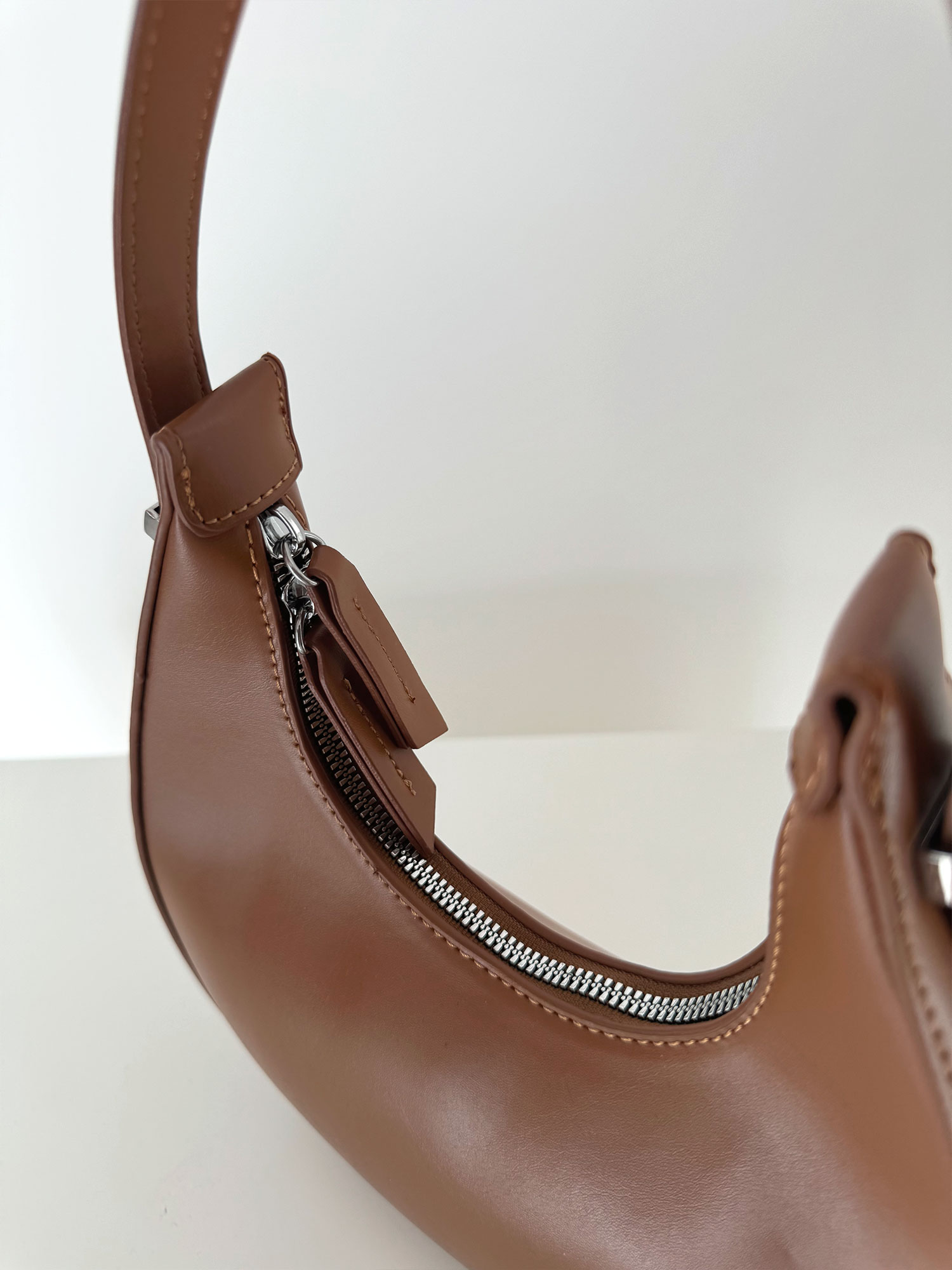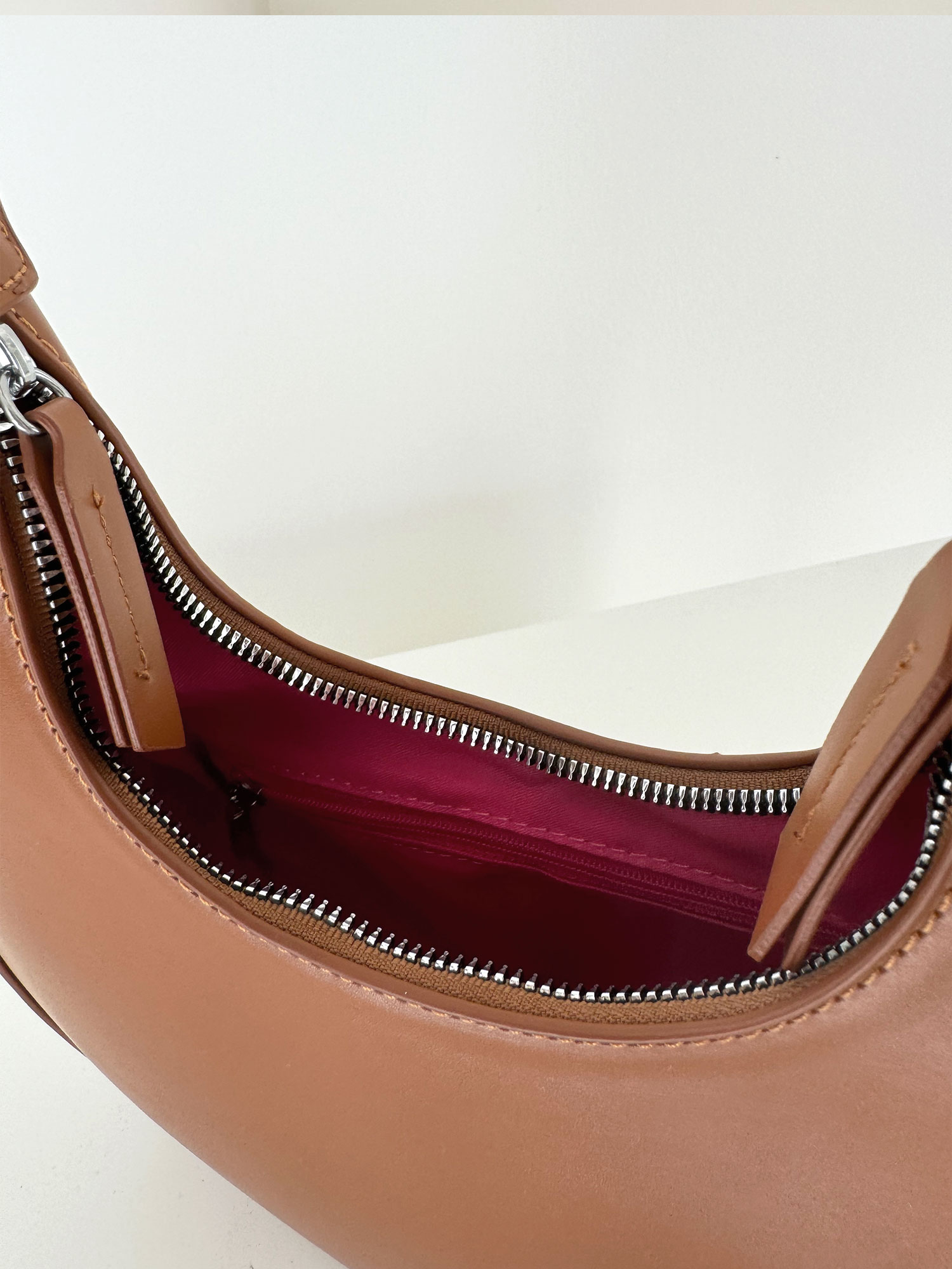 Borsa medio-piccola a borma di luna con zip in acchiaio e due cinghie chiusura, tracolla regolabile da passanti in acciaio in modo da poterla indossare sia a mano e sia in spalla, fodera interna con tasca. Made in italy in similpelle.