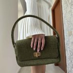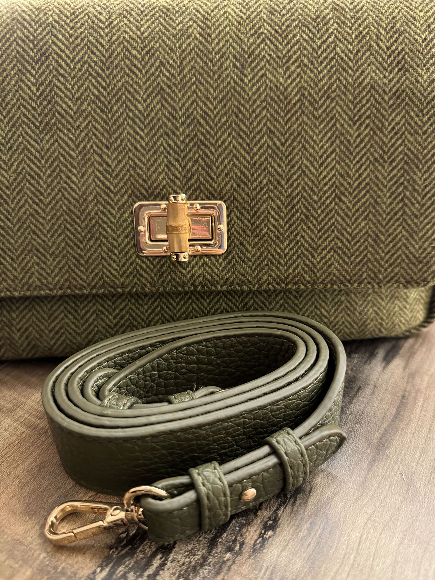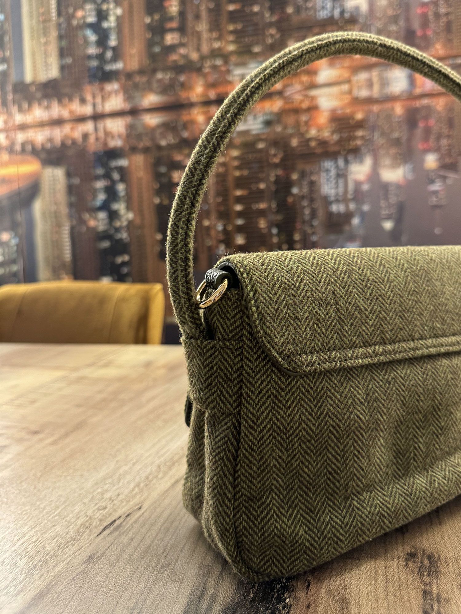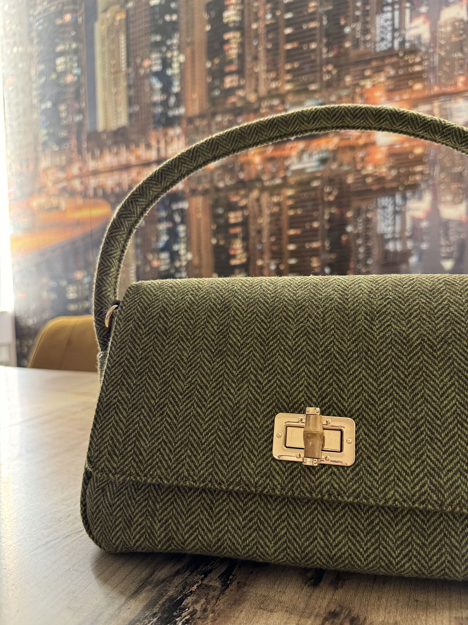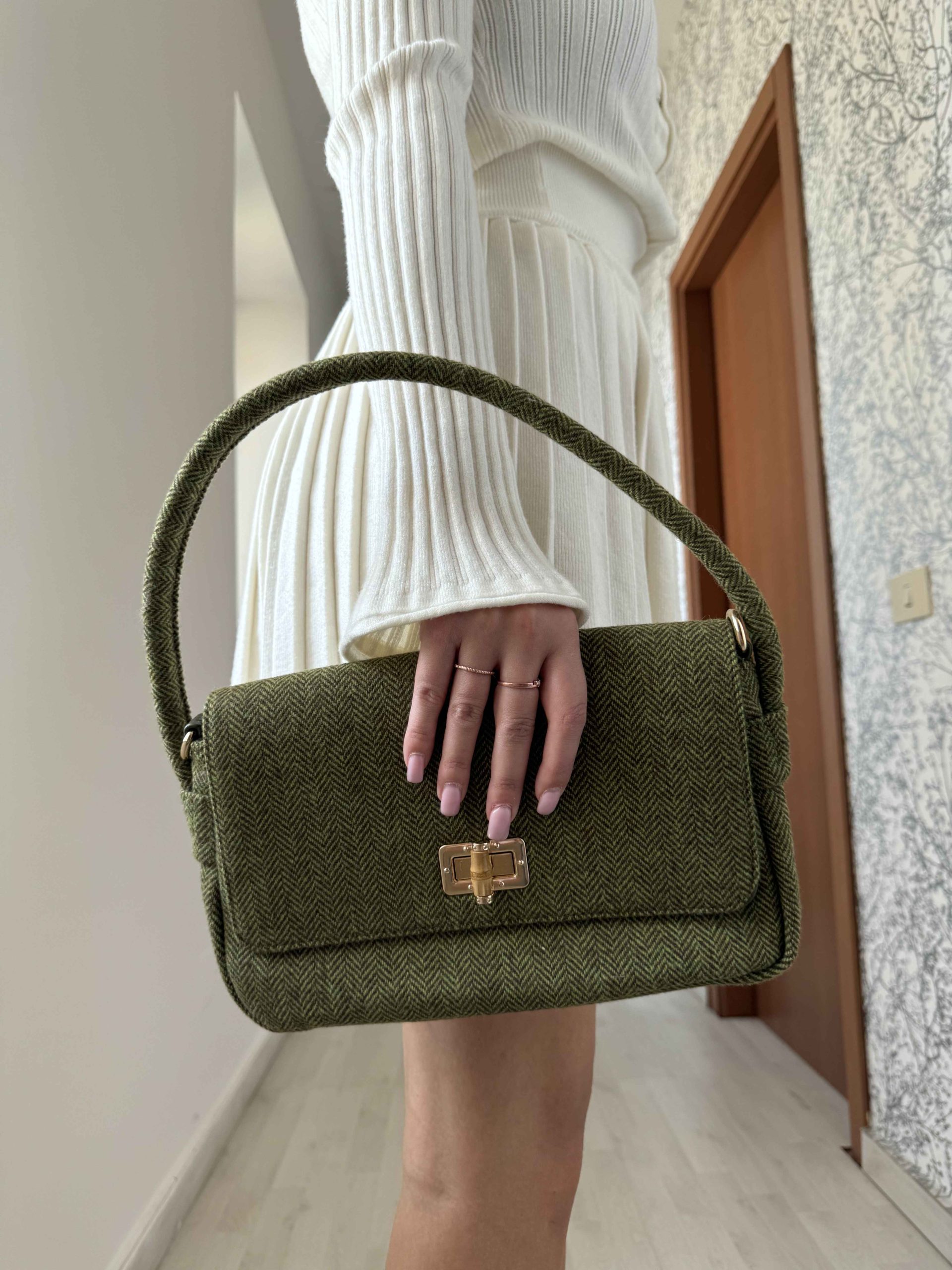 Borsa a spalla in tessuto verde con raffinata trama a spina di pesce e chiusura dorata a scatto. Elegante e funzionale, con manico imbottito per un comfort ottimale. Un accessorio versatile adatto a look casual e formali, perfetto per l'uso quotidiano.