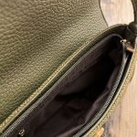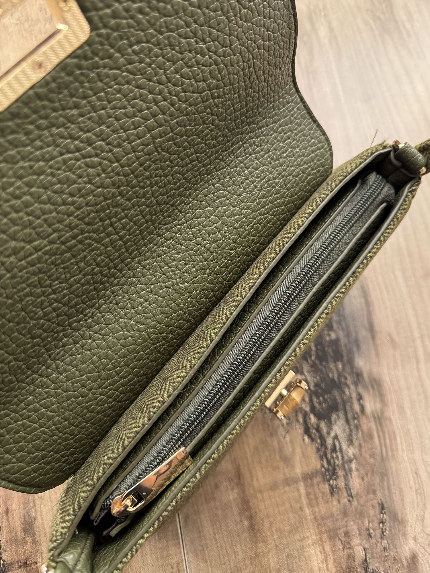 Questa borsa a spalla unisce eleganza e funzionalità, rendendola un accessorio perfetto per ogni occasione. Realizzata in tessuto verde con motivo a spina di pesce, dona un tocco classico e sofisticato al tuo look. Il suo design rettangolare, compatto ma capiente, è completato da una chiusura dorata a scatto che aggiunge un accento di lusso. La struttura della borsa è rigida, mantenendo una forma impeccabile anche durante l’uso quotidiano.