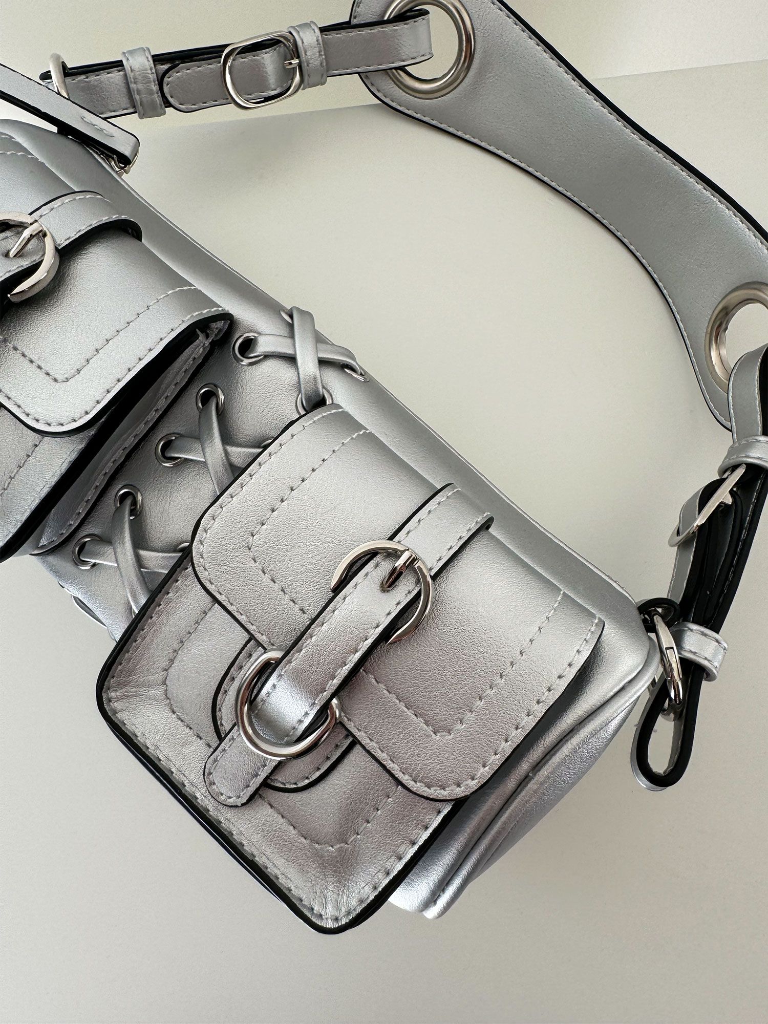 Borsa media tubolare con tasche in rilievo quadrate e particolarita nel mezzo di nasto intrecciato simil corsetto, con due tracolle: una per portarla a spalla o mano e un'altra lunga con cinturino regolabile. foderata, con tascha interna e made in italy. Tessuto in similpelle argentato.