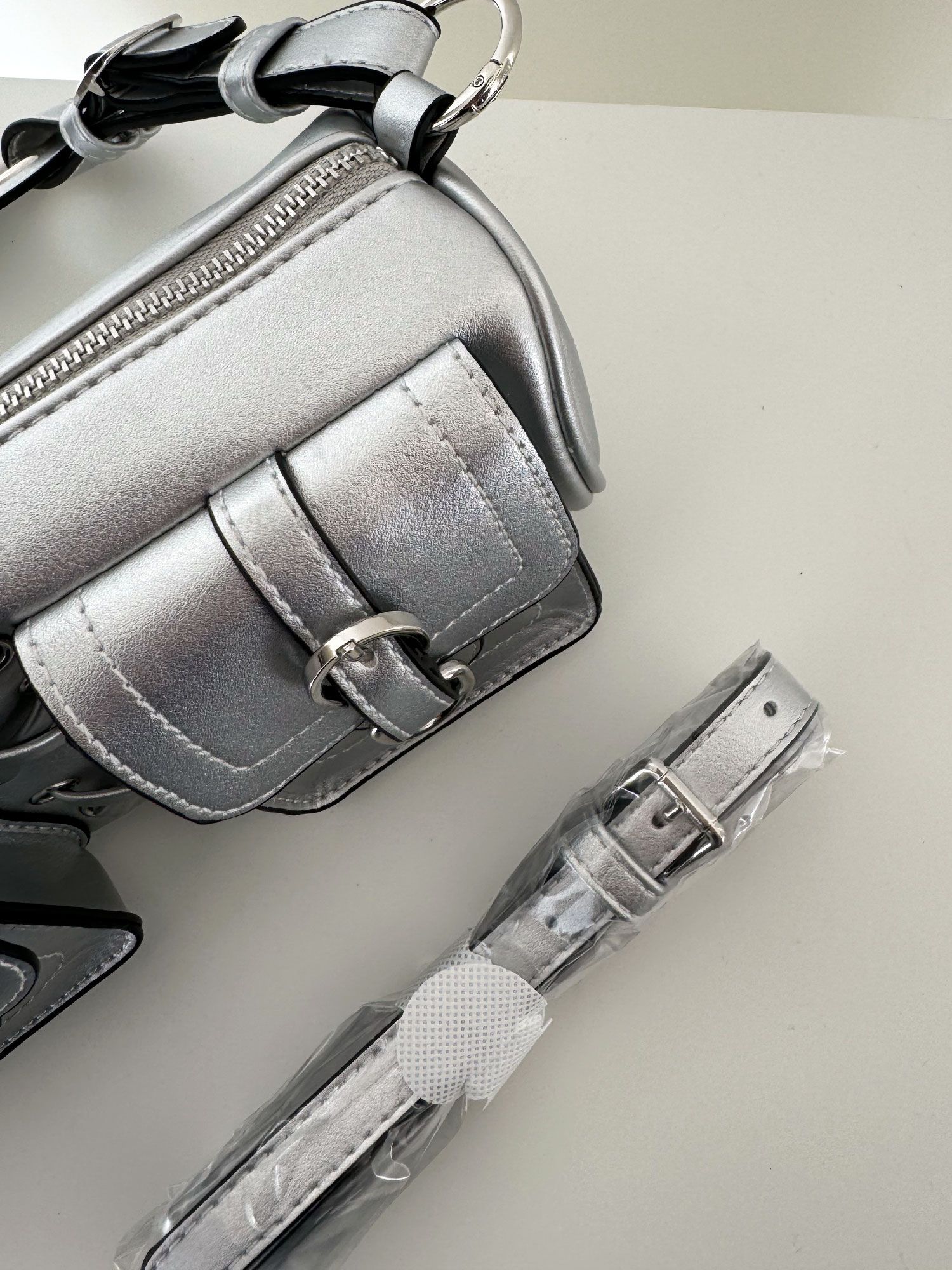 Borsa media tubolare tessuto similpelle argentato lavaggio chiaro, con tasche in rilievo quadrate e particolarita nel mezzo di nasto intrecciato simil corsetto, con due tracolle: una per portarla a spalla o mano e un'altra lunga con cinturino regolabile. foderata, con tascha interna.