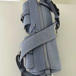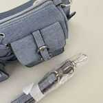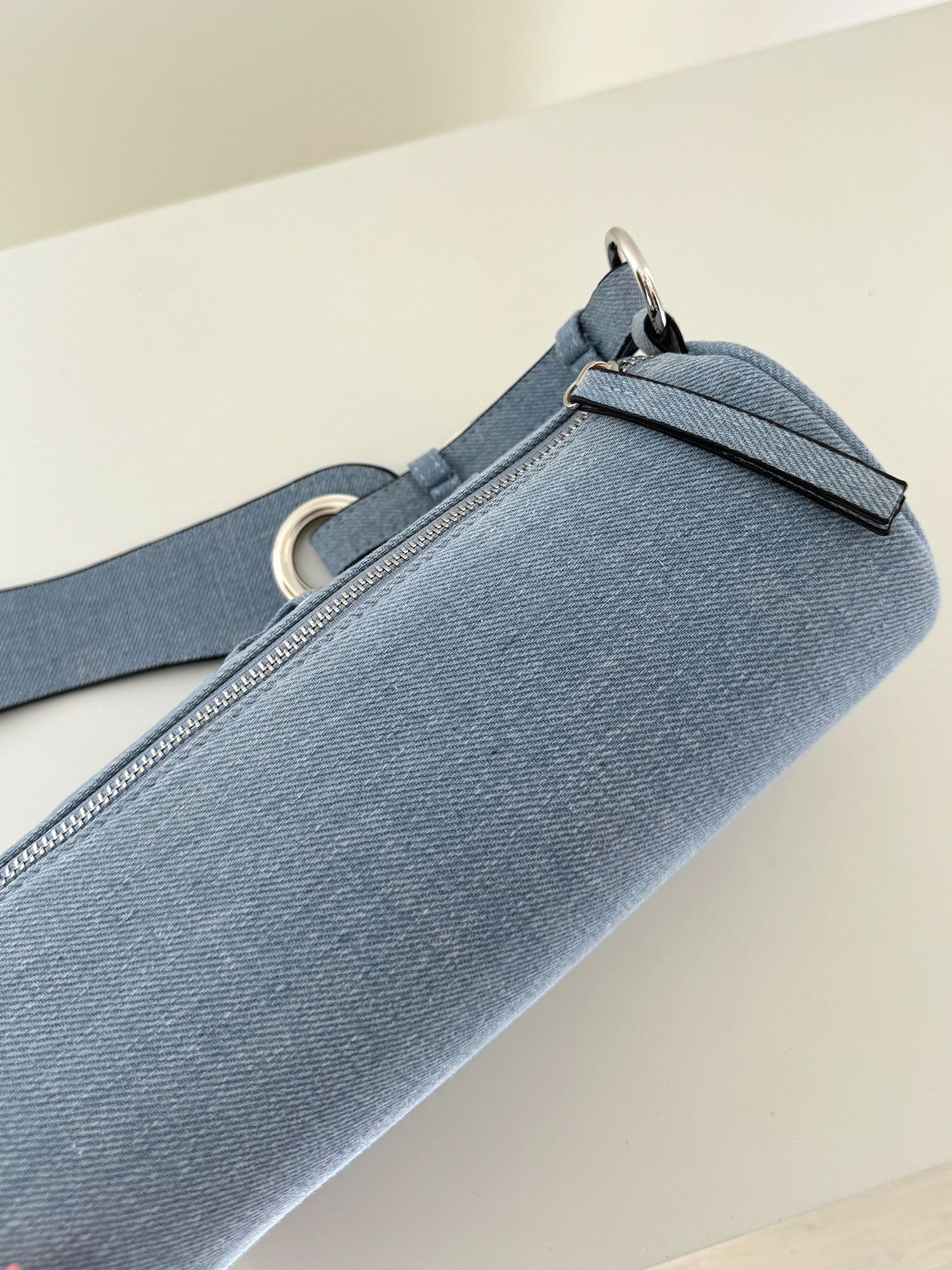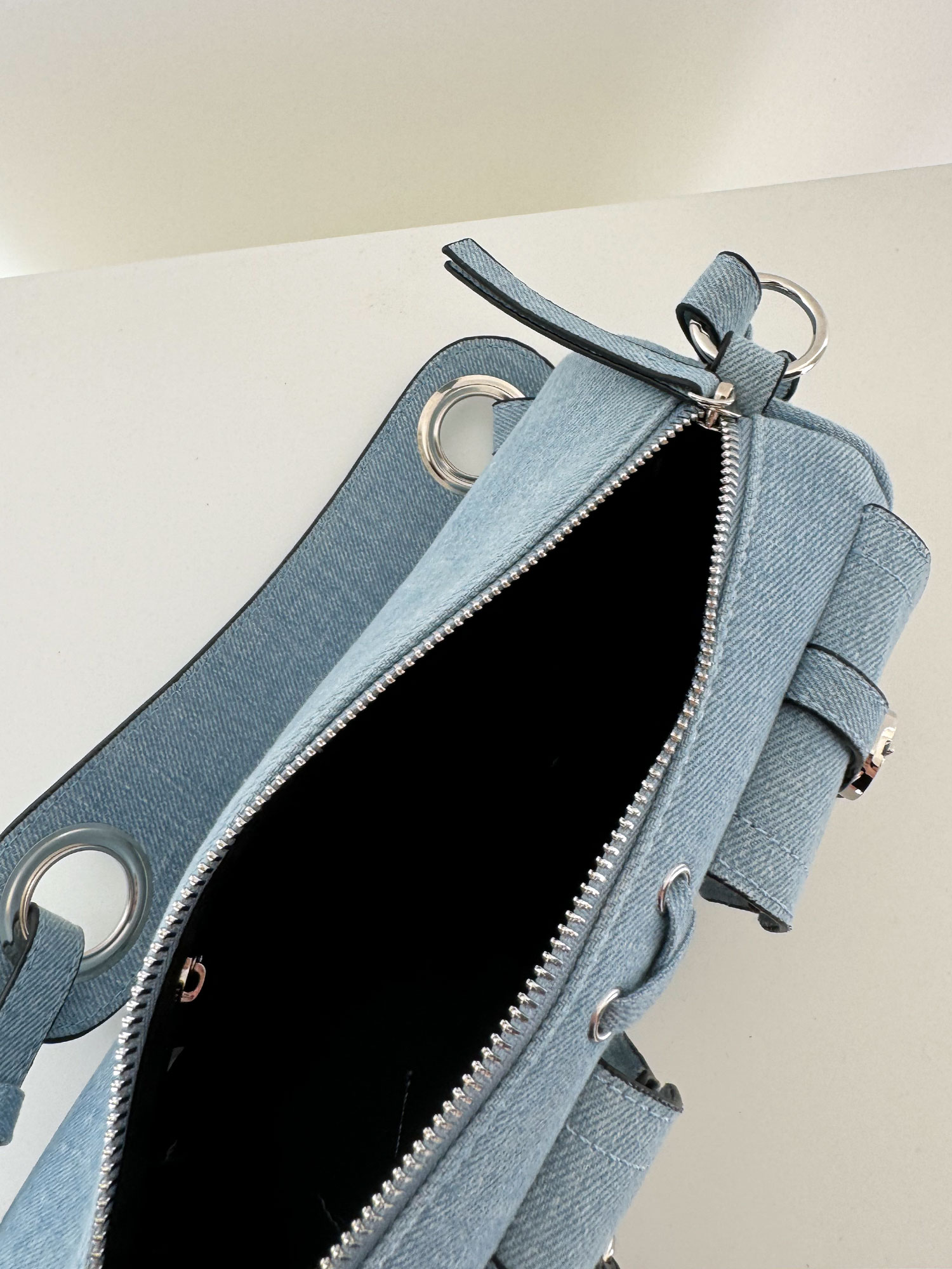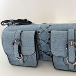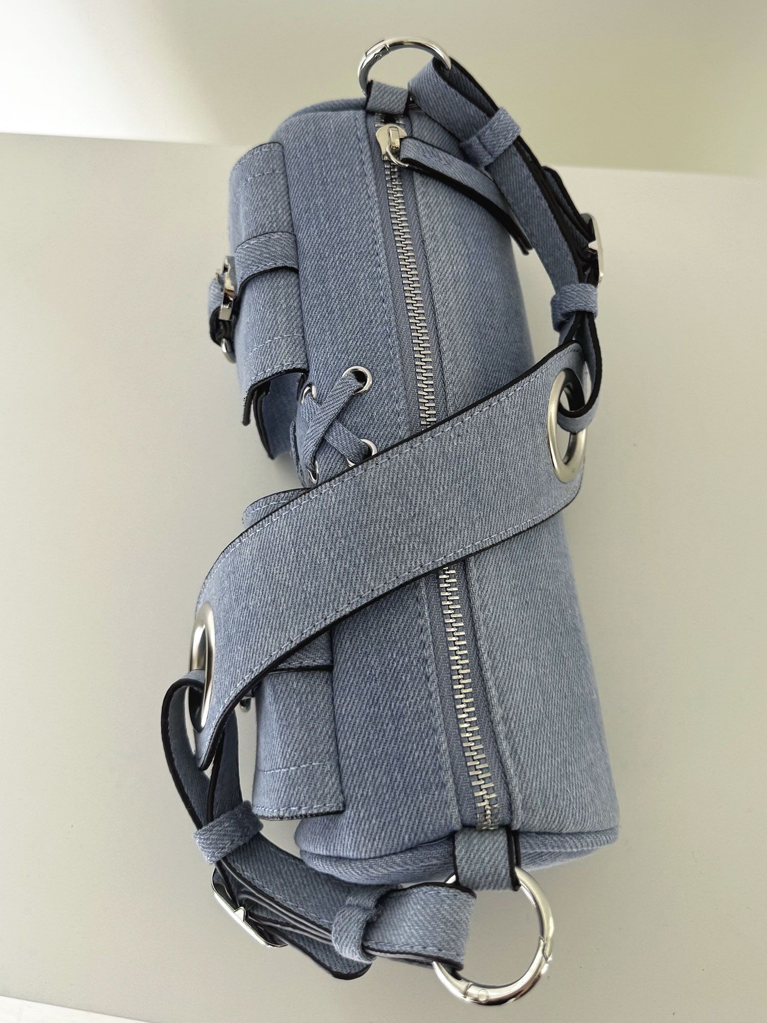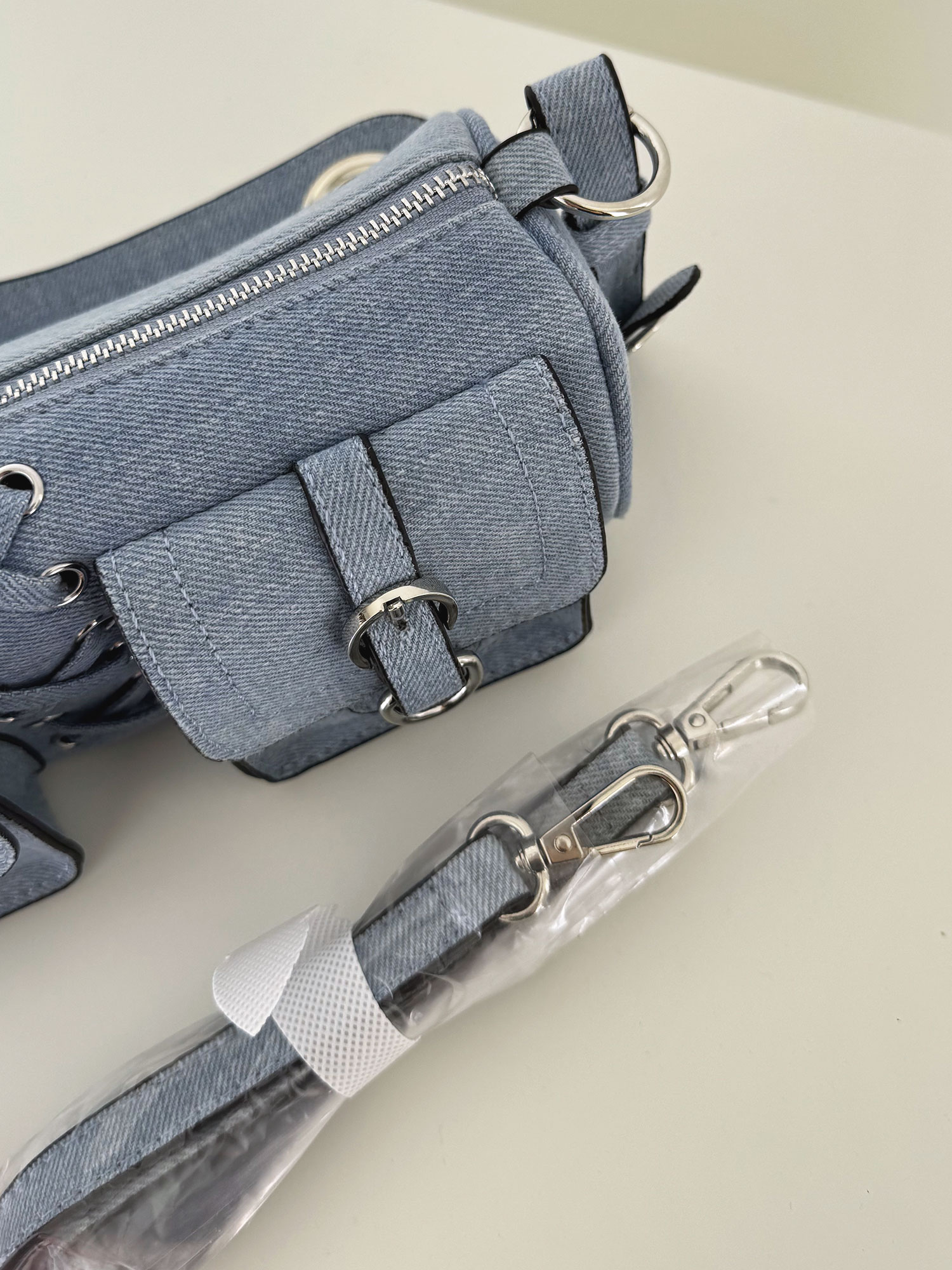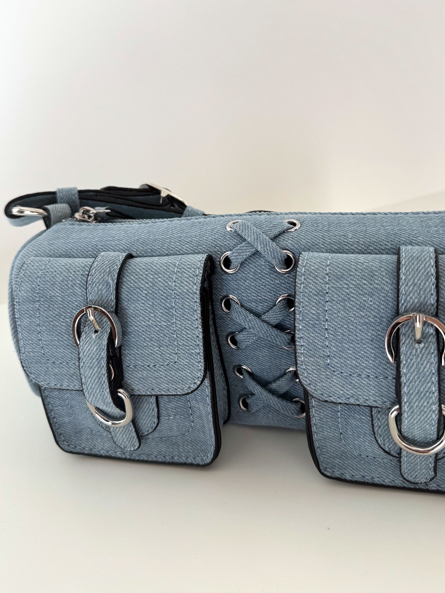 Borsa media tubolare tessuto in denim lavaggio chiaro, con tasche in rilievo quadrate e particolarita nel mezzo di nasto intrecciato simil corsetto, con due tracolle: una per portarla a spalla o mano e un'altra lunga con cinturino regolabile. foderata, con tascha interna.