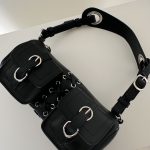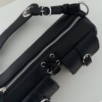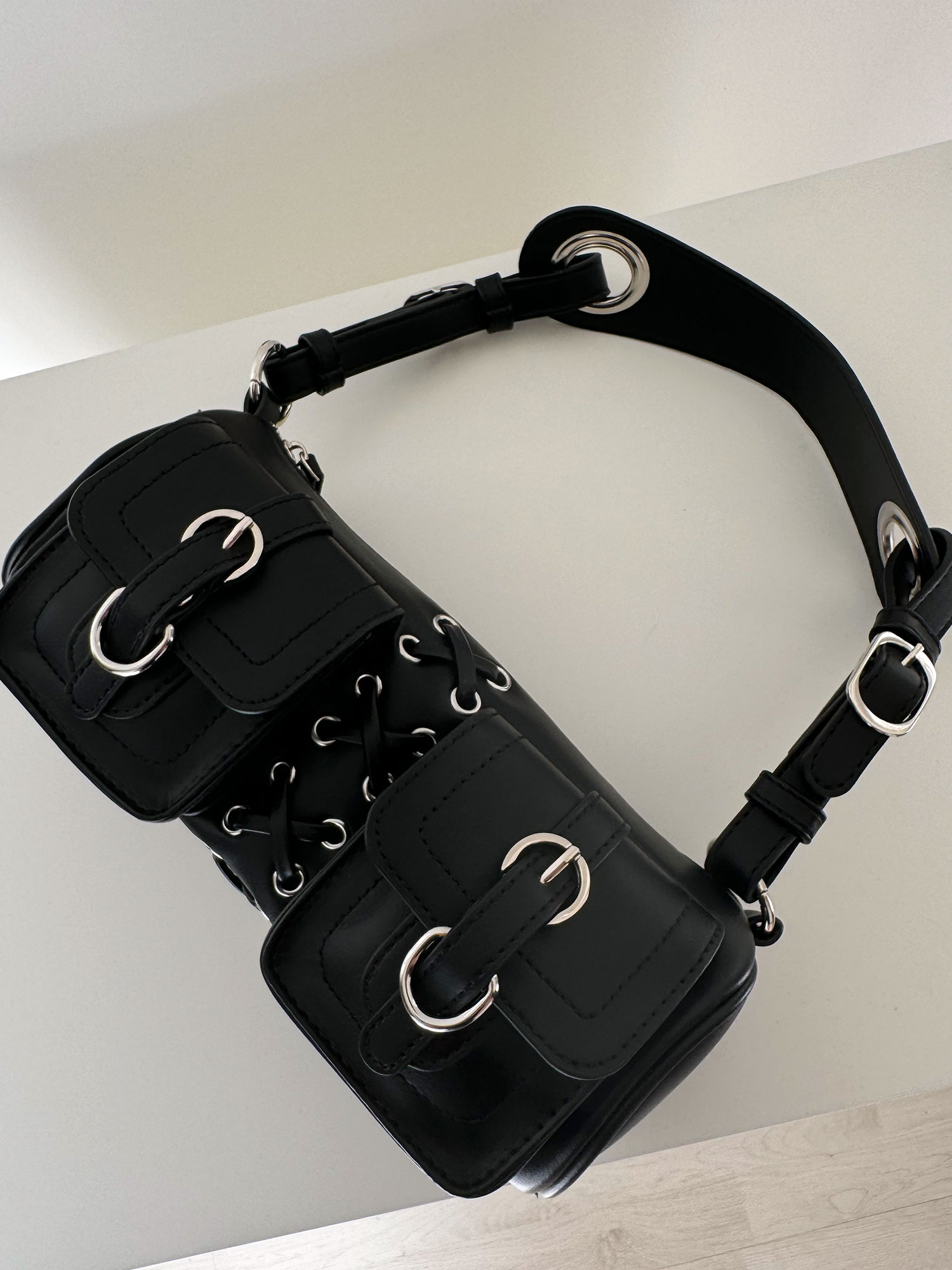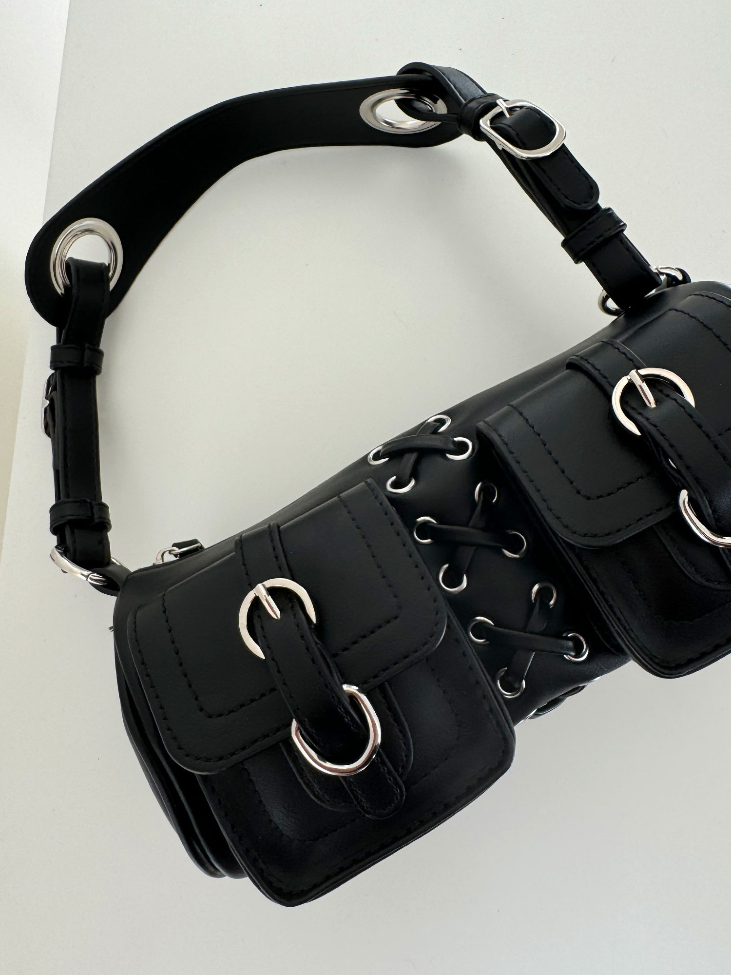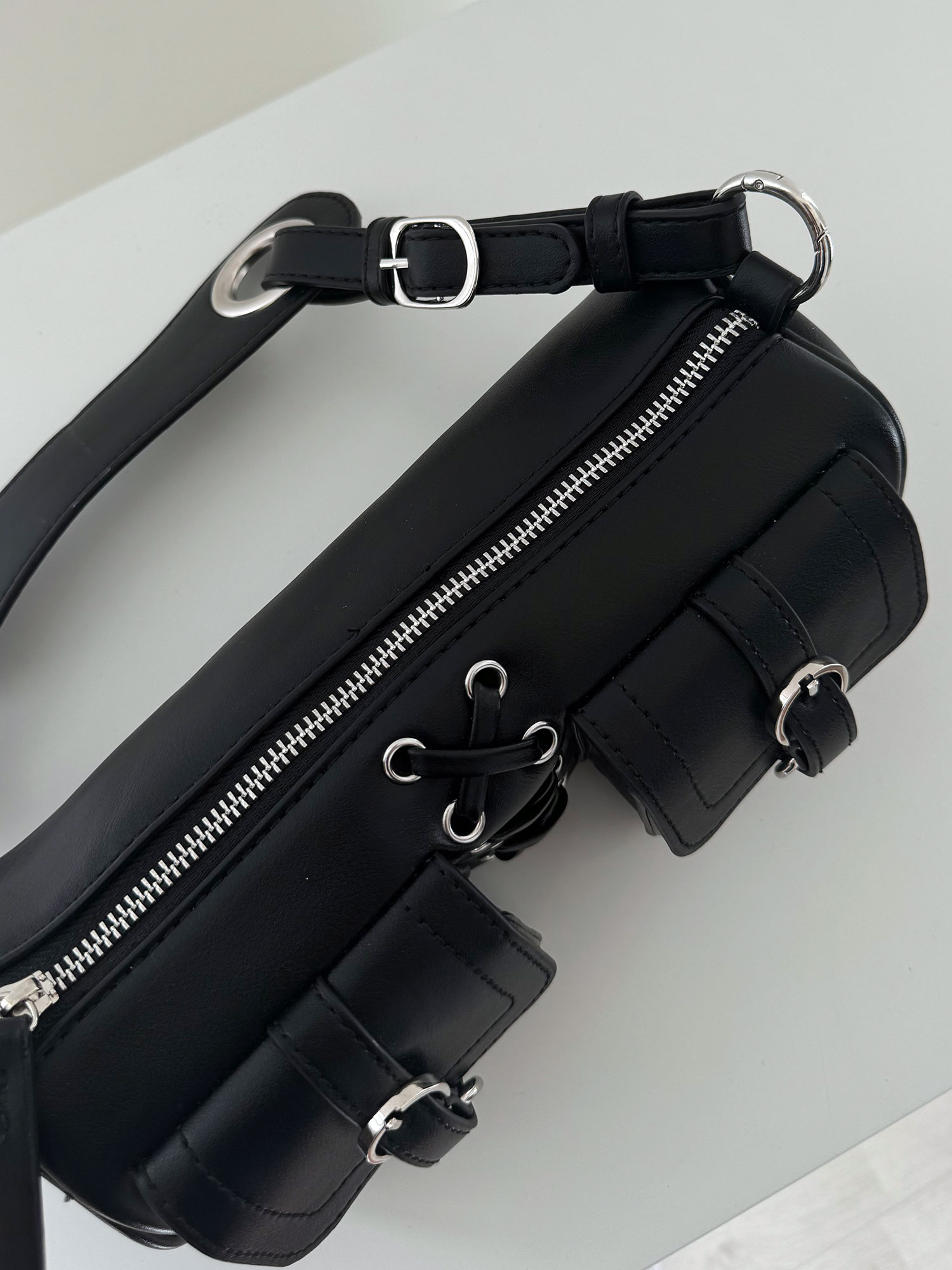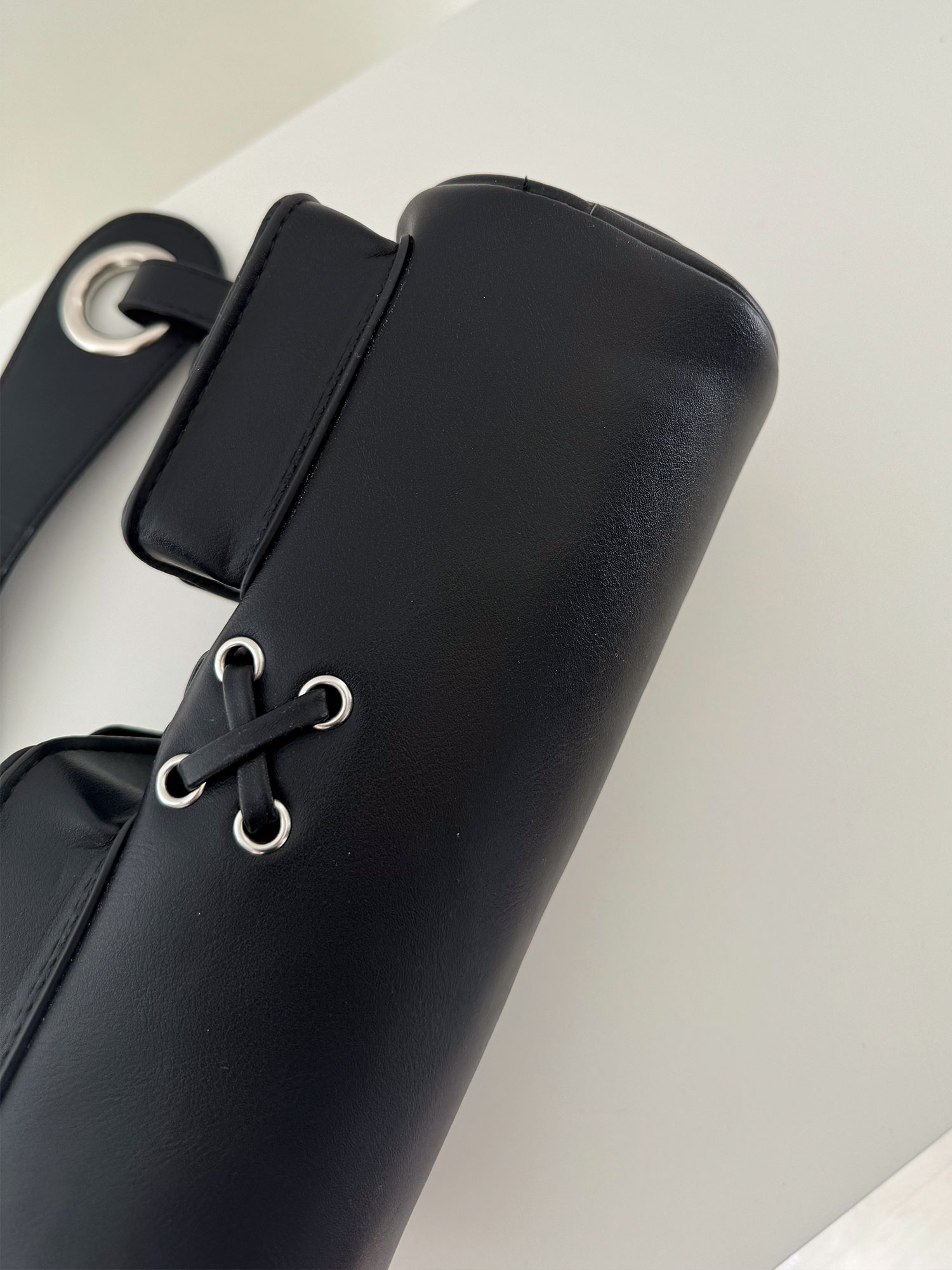 Borsa media tubolare con tasche in rilievo quadrate e particolarita nel mezzo di nasto intrecciato simil corsetto, con due tracolle: una per portarla a spalla o mano e un'altra lunga con cinturino regolabile. foderata, con tascha interna e made in italy. Tessuto in similpelle argentato.