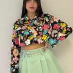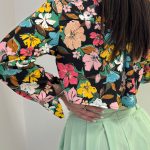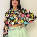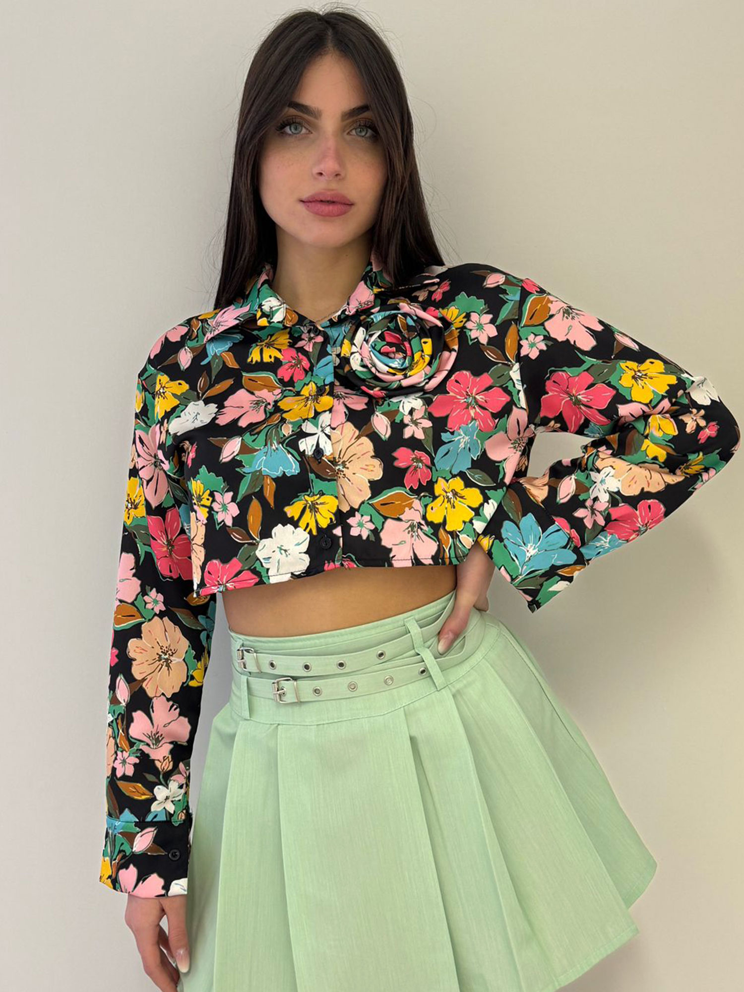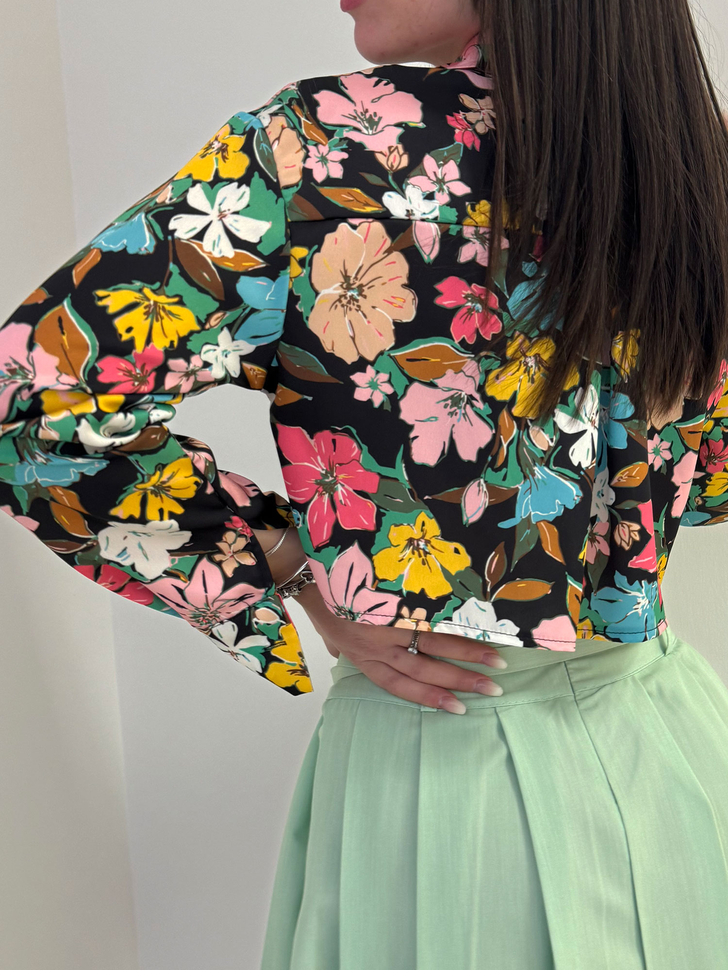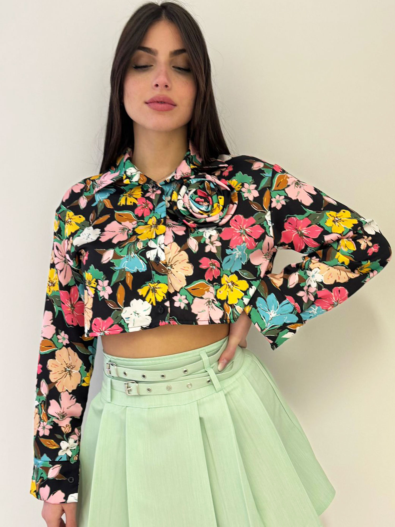 Camicia crop in raso con fondo nero e fantasia fiori, inserto rosa in tessuto su parte frontale destra, maniche lunghe con polsini.