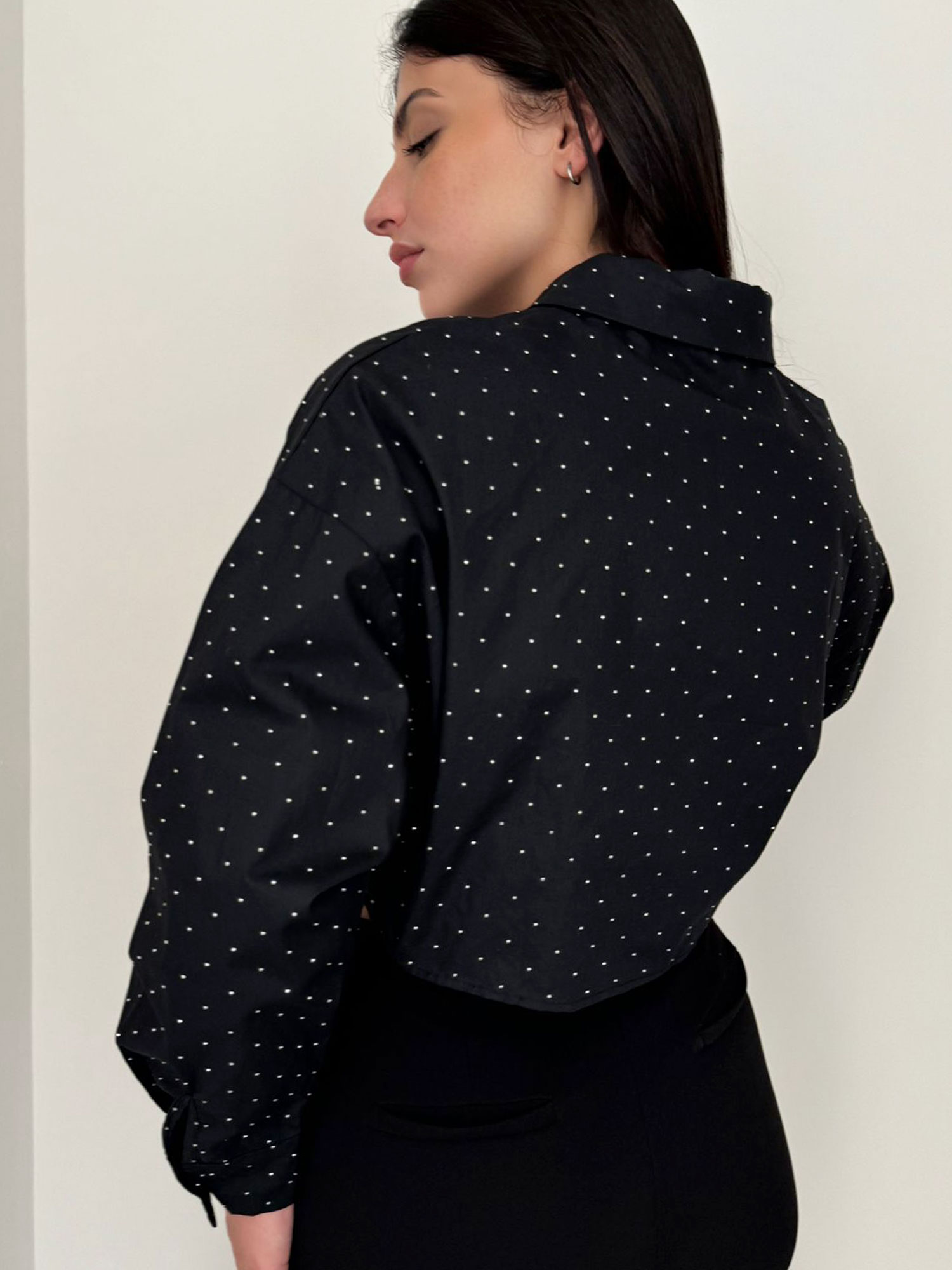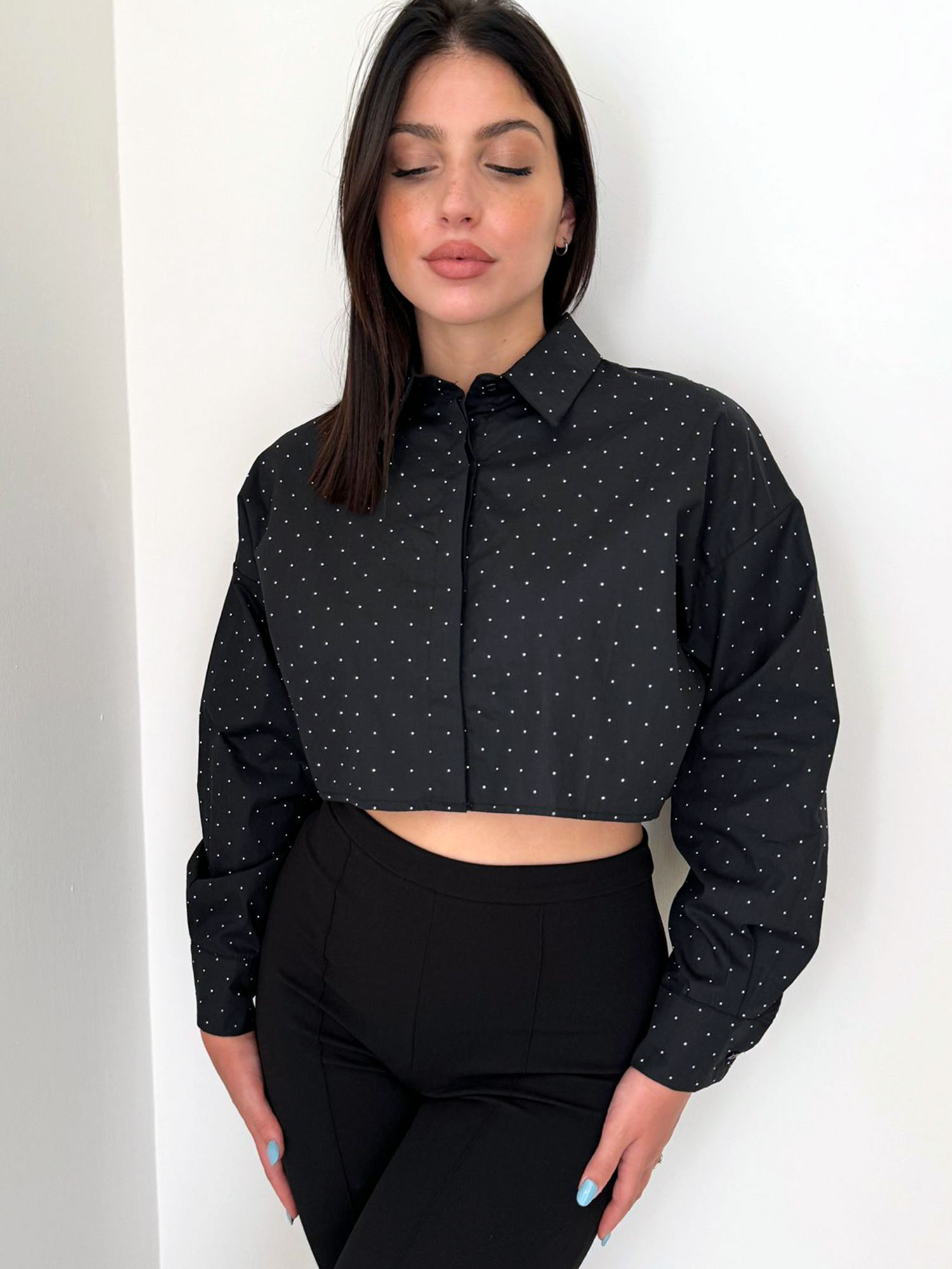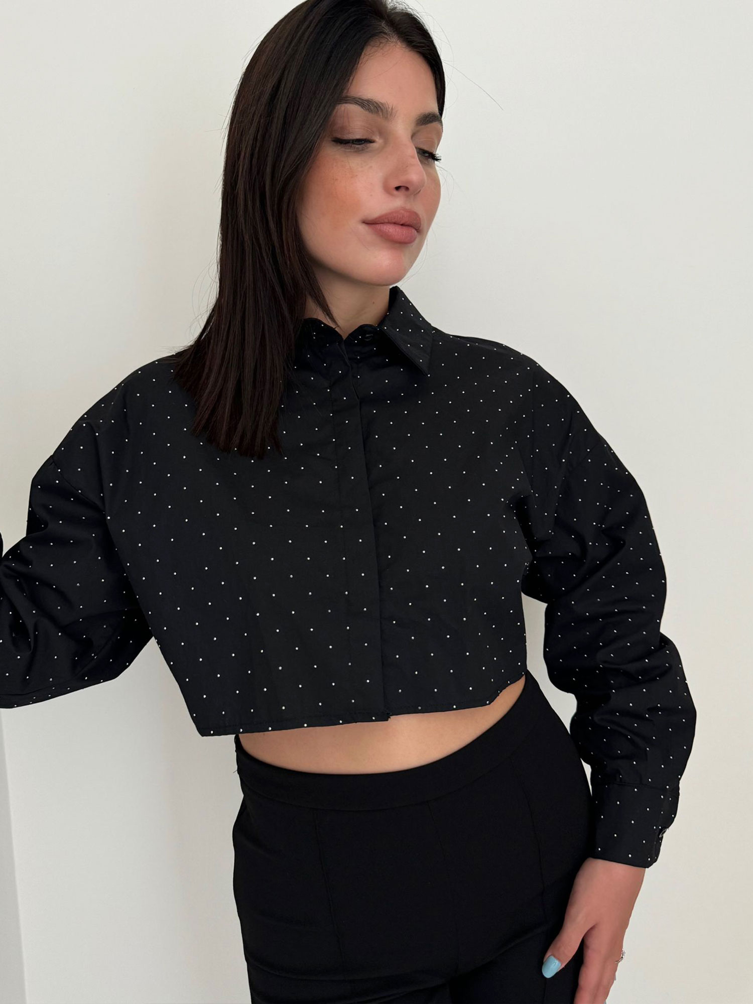 Camicia nera in tessuto leggero con piccoli brillantini applicati su tutto il capo, design leggermente oversize, colletto classico, maniche lunghe con polsini abbottonati, chiusura frontale con bottoni tono su tono e orlo dritto. Perfetta per un look casual o semi-formale.