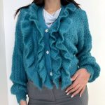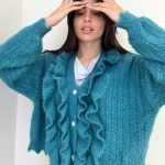 Cardigan morbido con trama a treccia e ondulatura su polsini e parte inferiore, manica ampia e lunga. Abbottonatura a tre con bottoni gioiello e quattro ruches che partolo dalla circonferenza scollo e si estendono per tutta la parte verticale frontale del capo.
