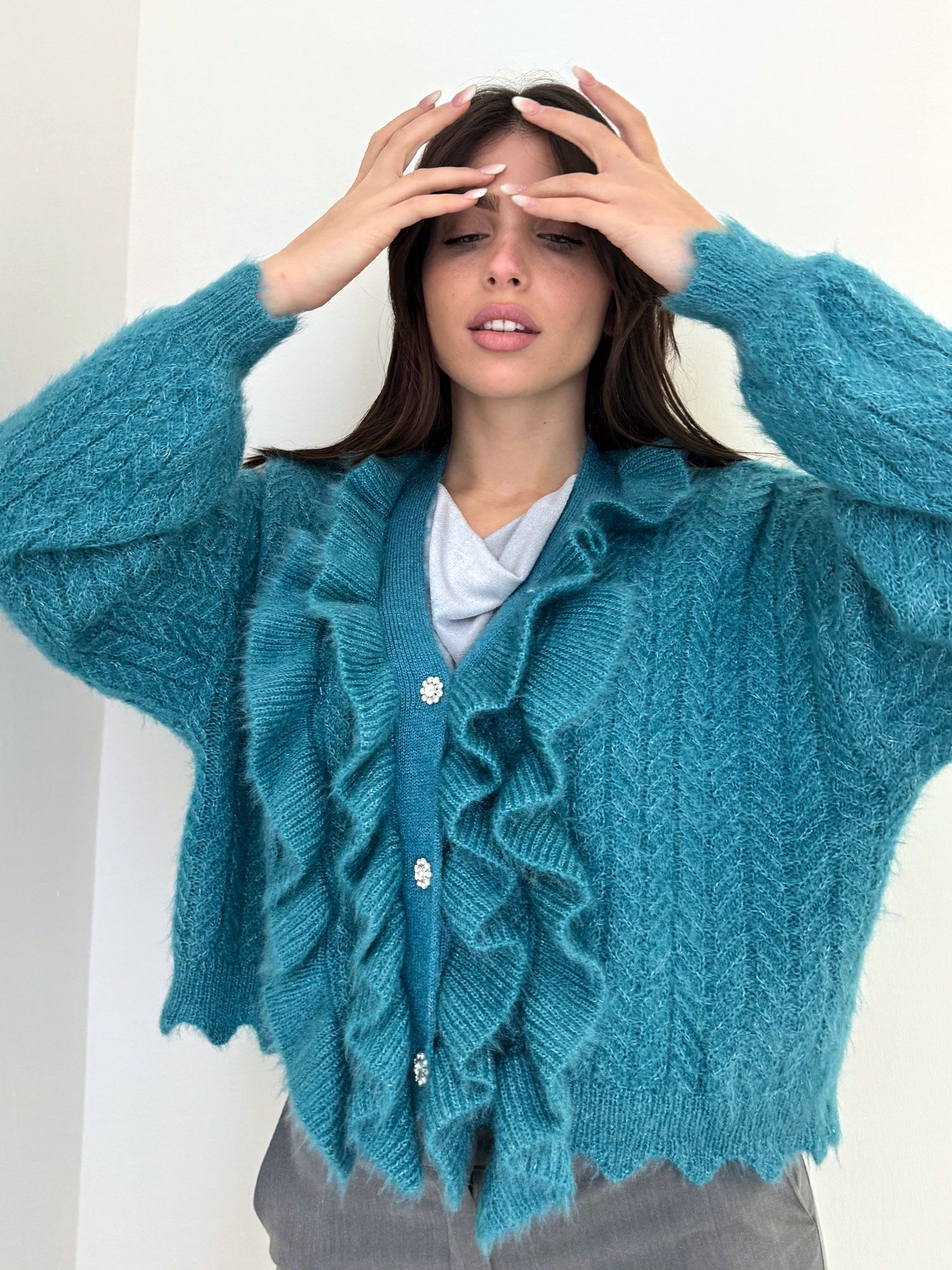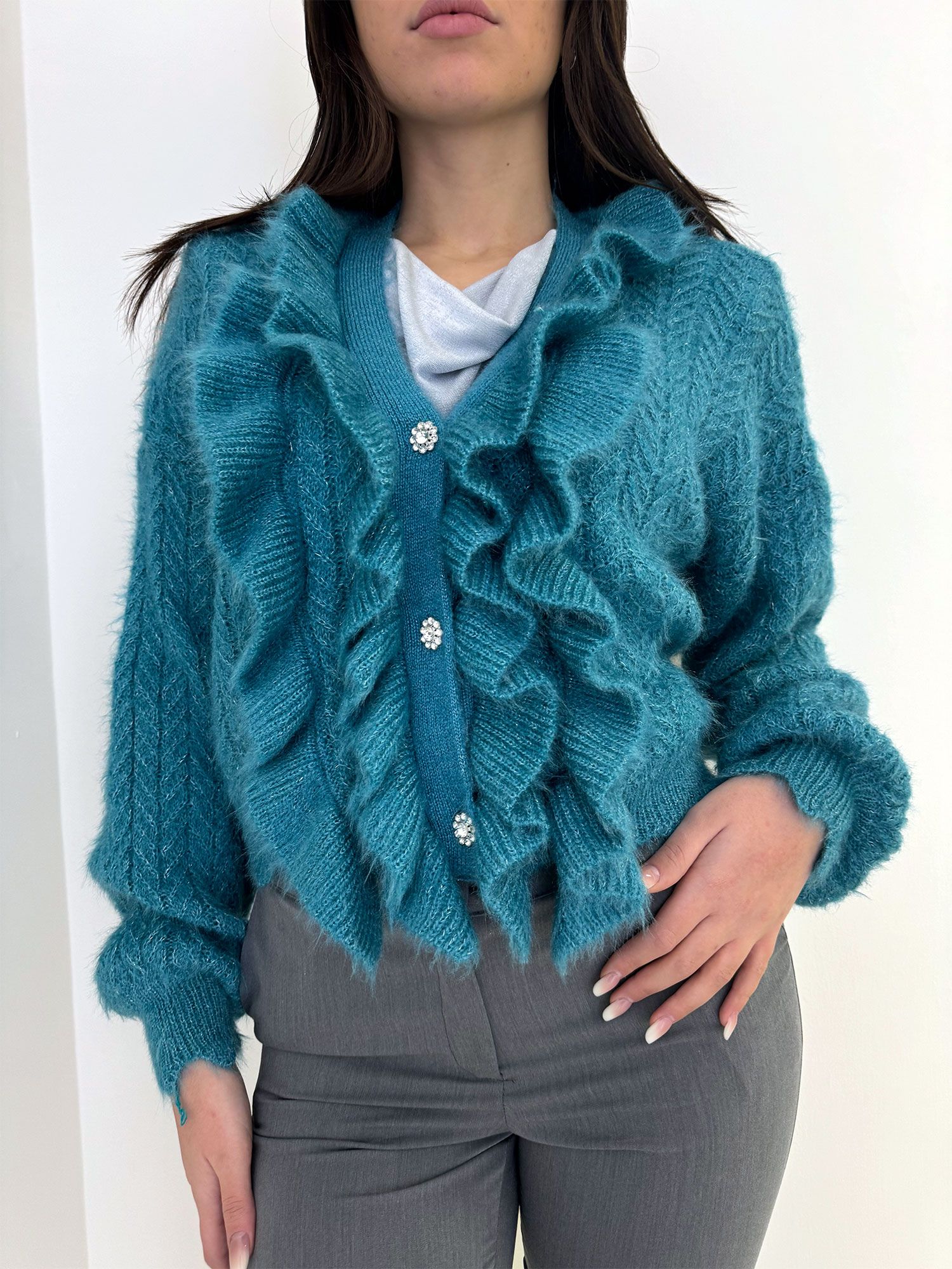 Home / Abbigliamento / Maglieria / CARDIGAN CON RUCHES PETROLIO