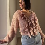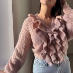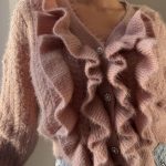 Cardigan morbido con trama a treccia e ondulatura su polsini e parte inferiore, manica ampia e lunga. Abbottonatura a tre con bottoni gioiello e quattro ruches che partolo dalla circonferenza scollo e si estendono per tutta la parte verticale frontale del capo.