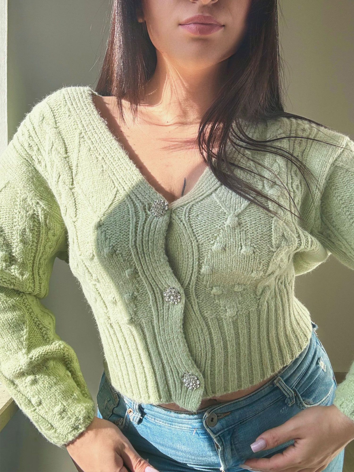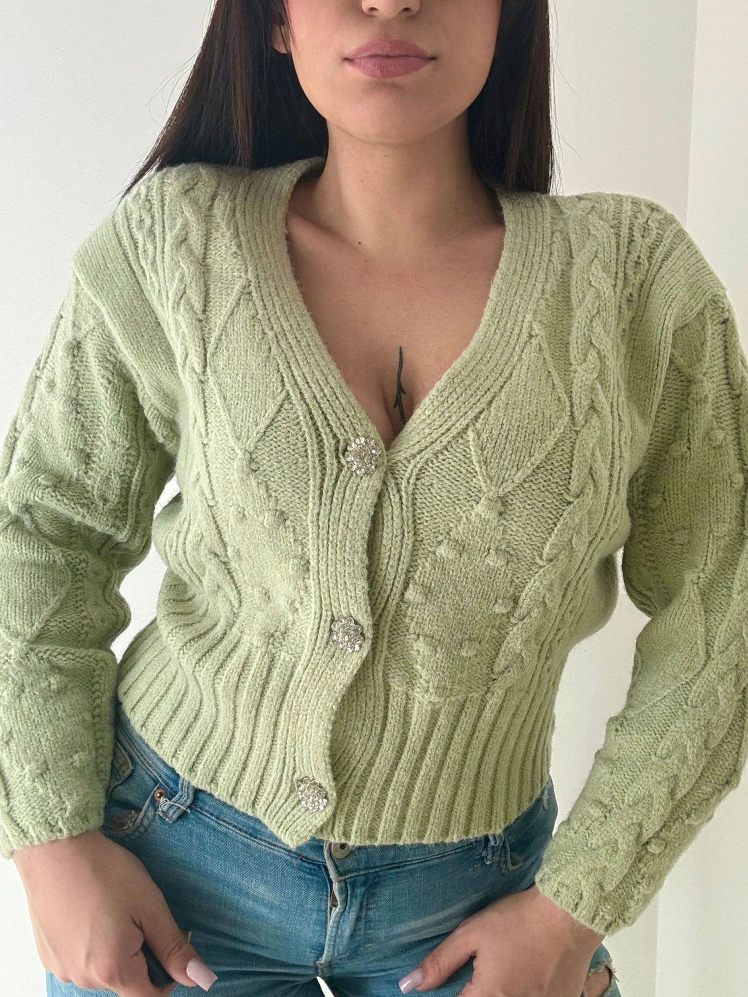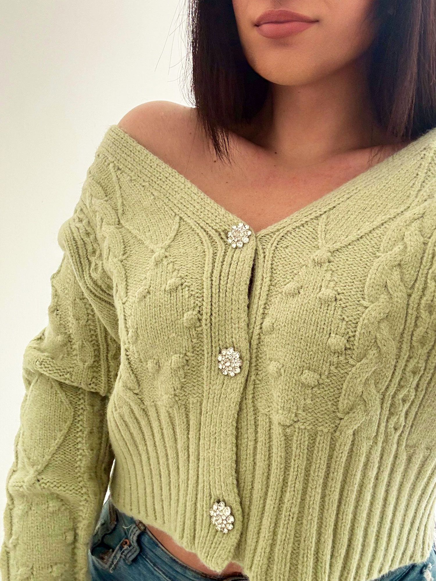 Cardigan morbido con trama a intrecci con scollo a V e tre bottoni gioiello a chiusura.