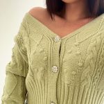 Cardigan morbido con trama ad intrecci e parte finale con polsini a costine, scollo a V e tre bottoni gioiello a chiusura.