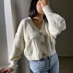 Cardigan morbido panna con maniche ampie, coste nei polsini, tasche prontali e estremità capo. abbottonatura a clip con tre spille mobili gioiello a forma di fiocco come decorazione verticale.