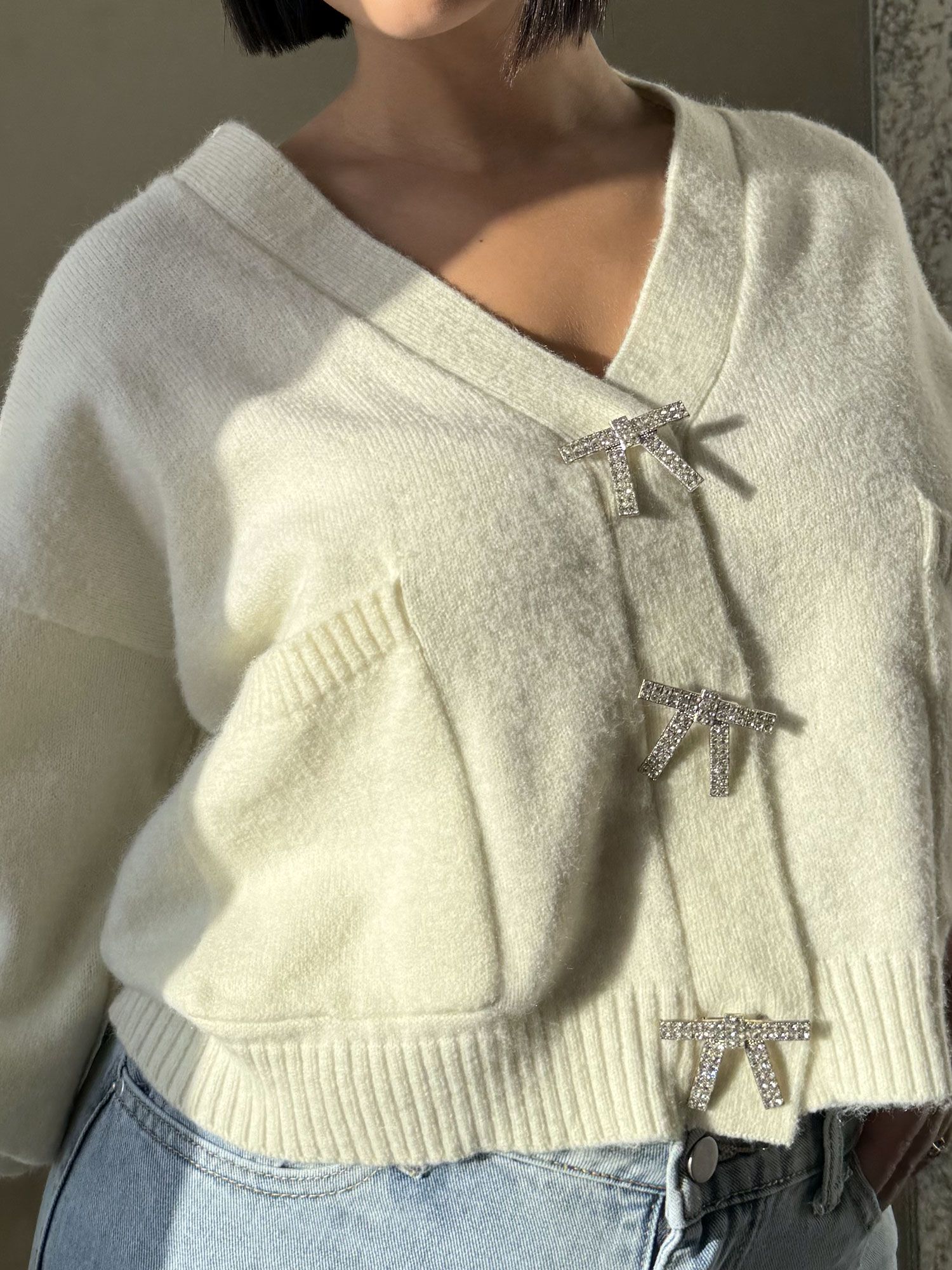 Cardigan morbido color panna con tasche frontali, chiusura a clip e tre spille mobili gioiello a fiocco come decorazione.