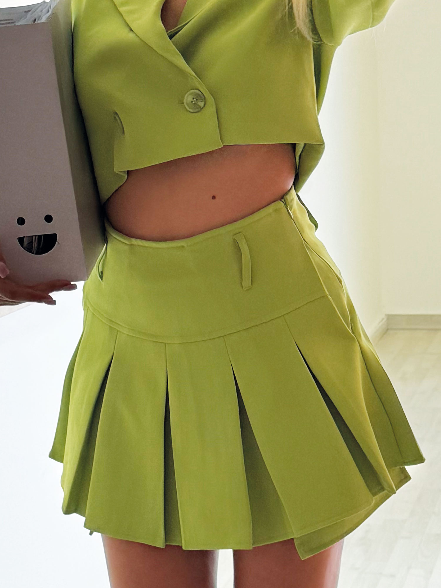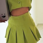 Completo in verde lime, un mix di eleganza e modernità, composto da blazer crop e gonna a pieghe, pensato per chi ama distinguersi. Il blazer corto presenta un doppio bottone e revers classico, con maniche lunghe e un taglio strutturato che valorizza il punto vita. La gonna a vita alta è arricchita da pieghe ampie e dinamiche, con una zip laterale invisibile che garantisce una vestibilità pratica e comoda. Realizzato in un tessuto leggero e resistente, il completo è disponibile nelle taglie S, M e L, perfetto per occasioni trendy, eventi di moda o uscite serali.
