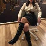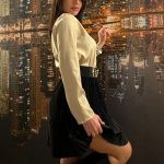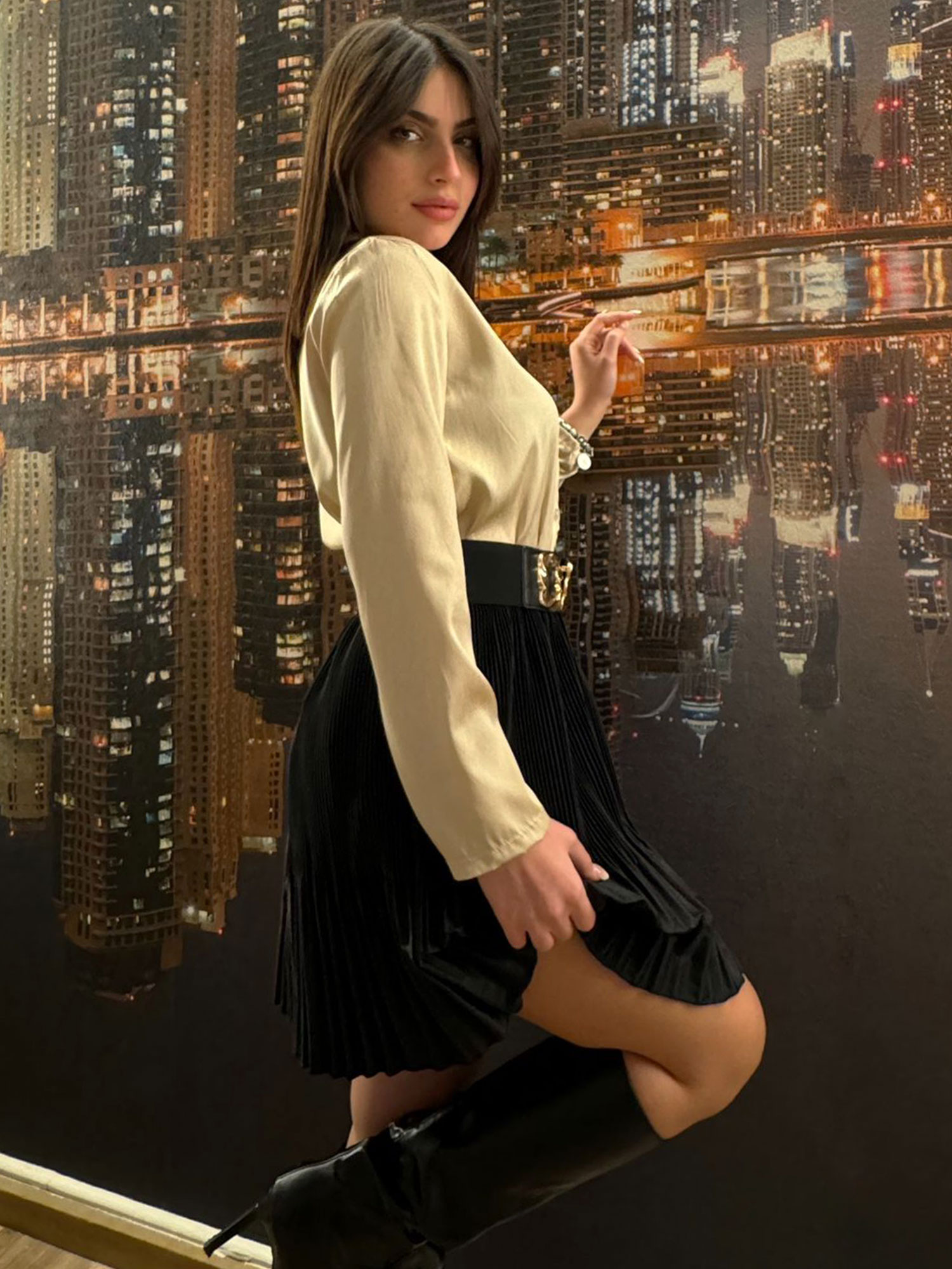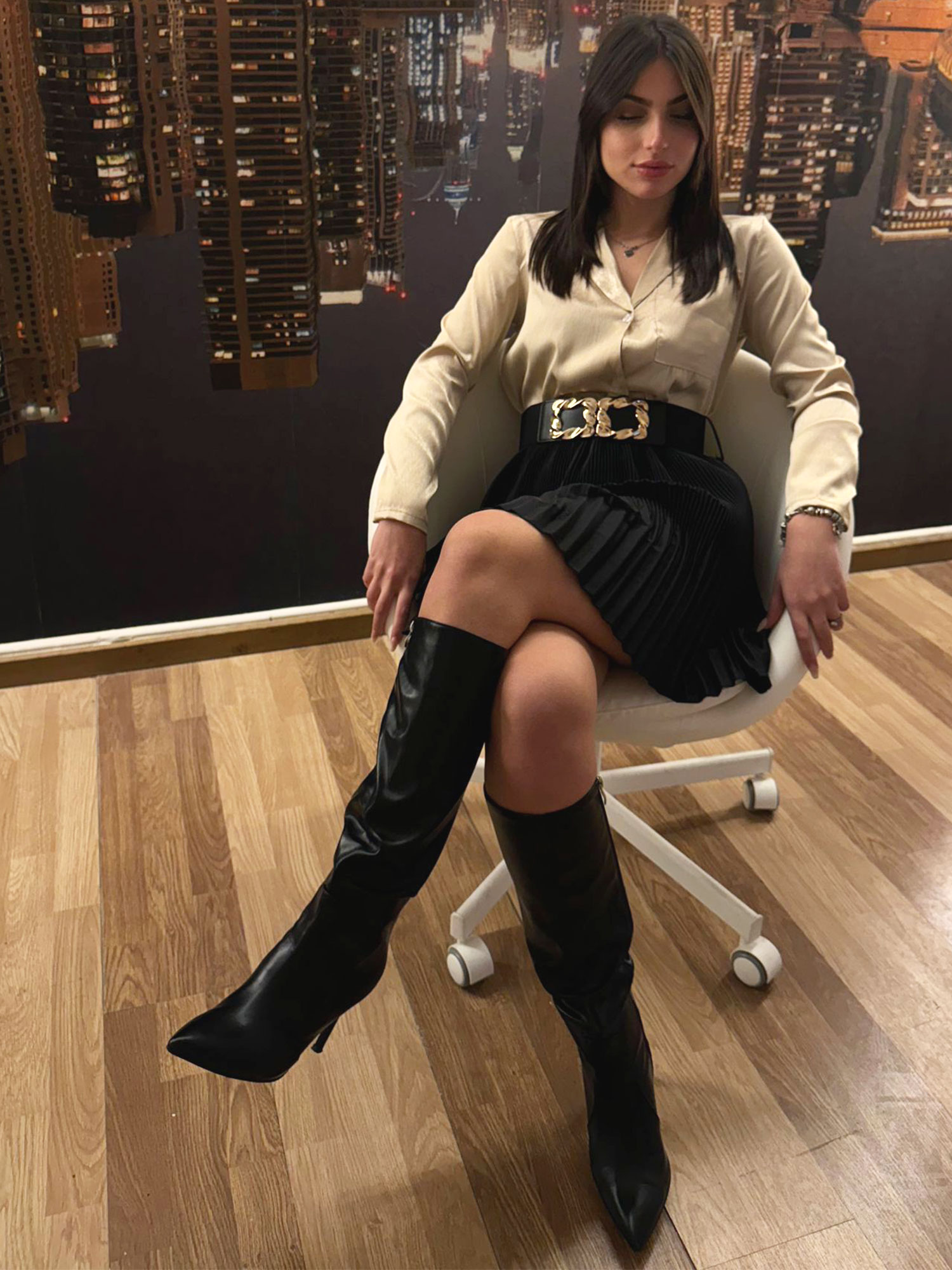 Completo con camicia color oro slim, gonna plissè con elastico e cintura con inserto dorato in vita.