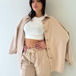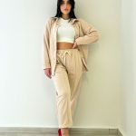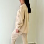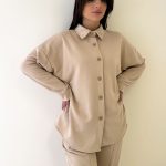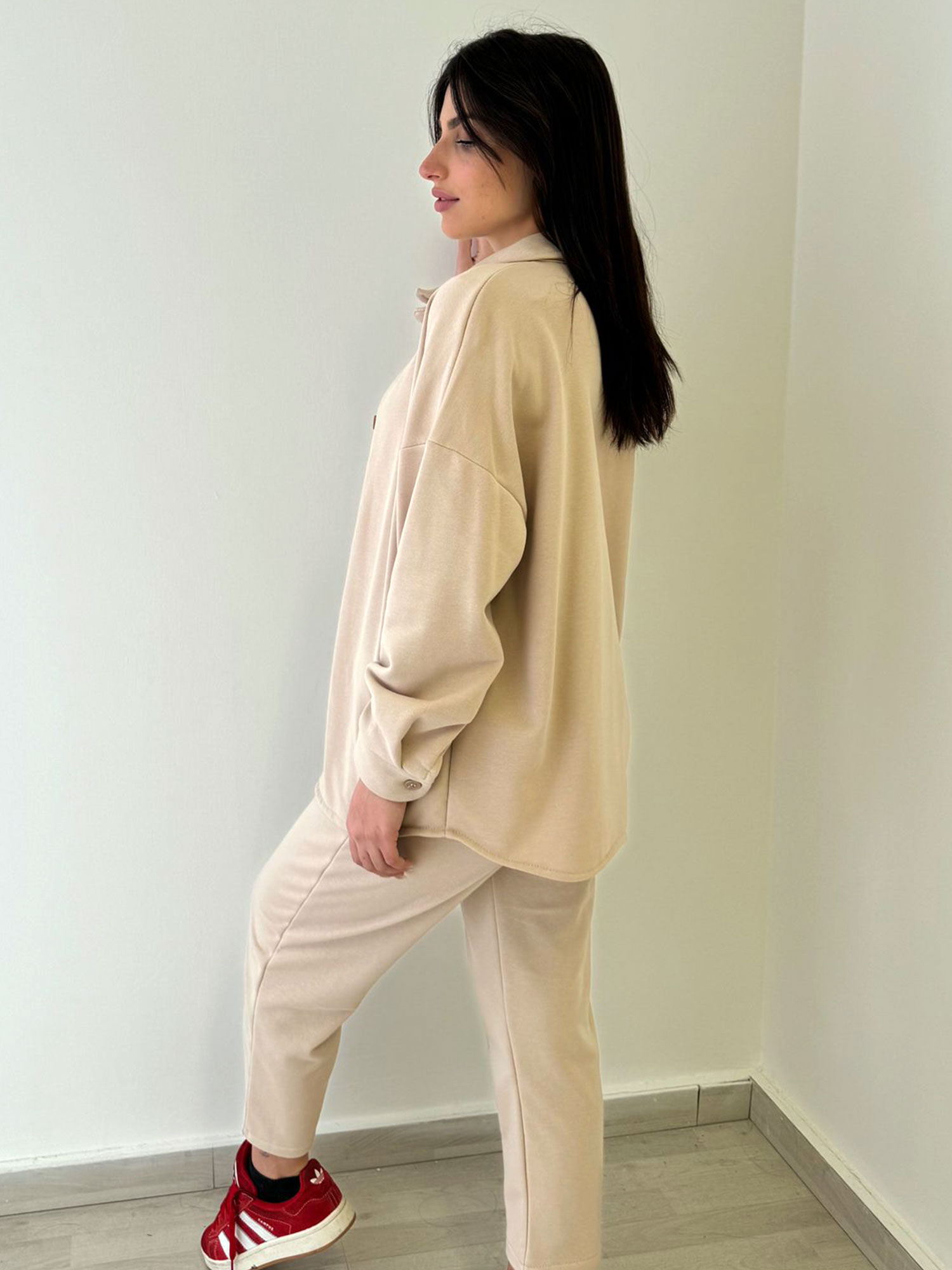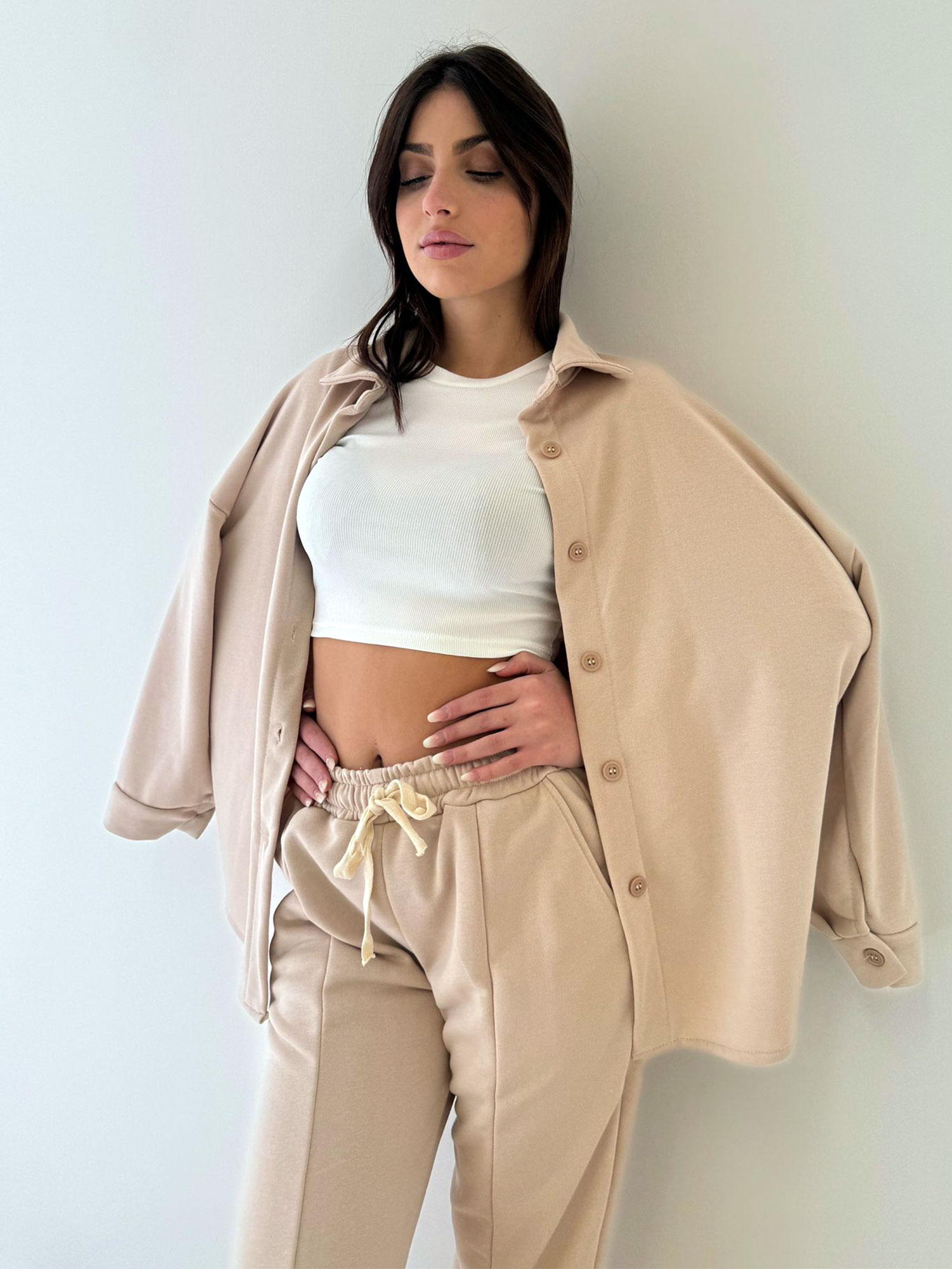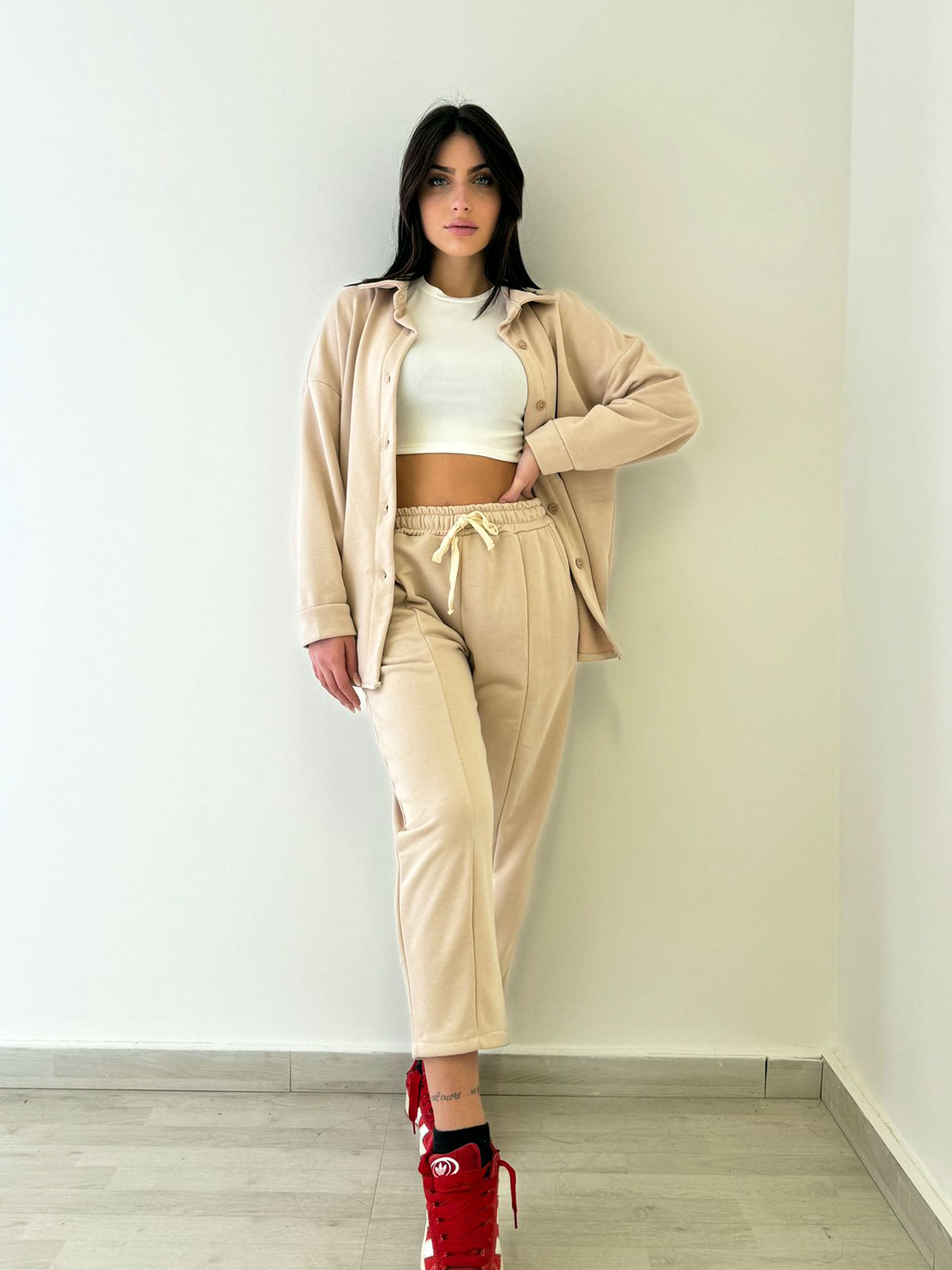 Completo morbido color beige composto da camicia modello over maniche lunghe con polsini e pantalone a vita con arriciatura e elastico e nastro in chiusura, cuciture in rilievo.