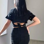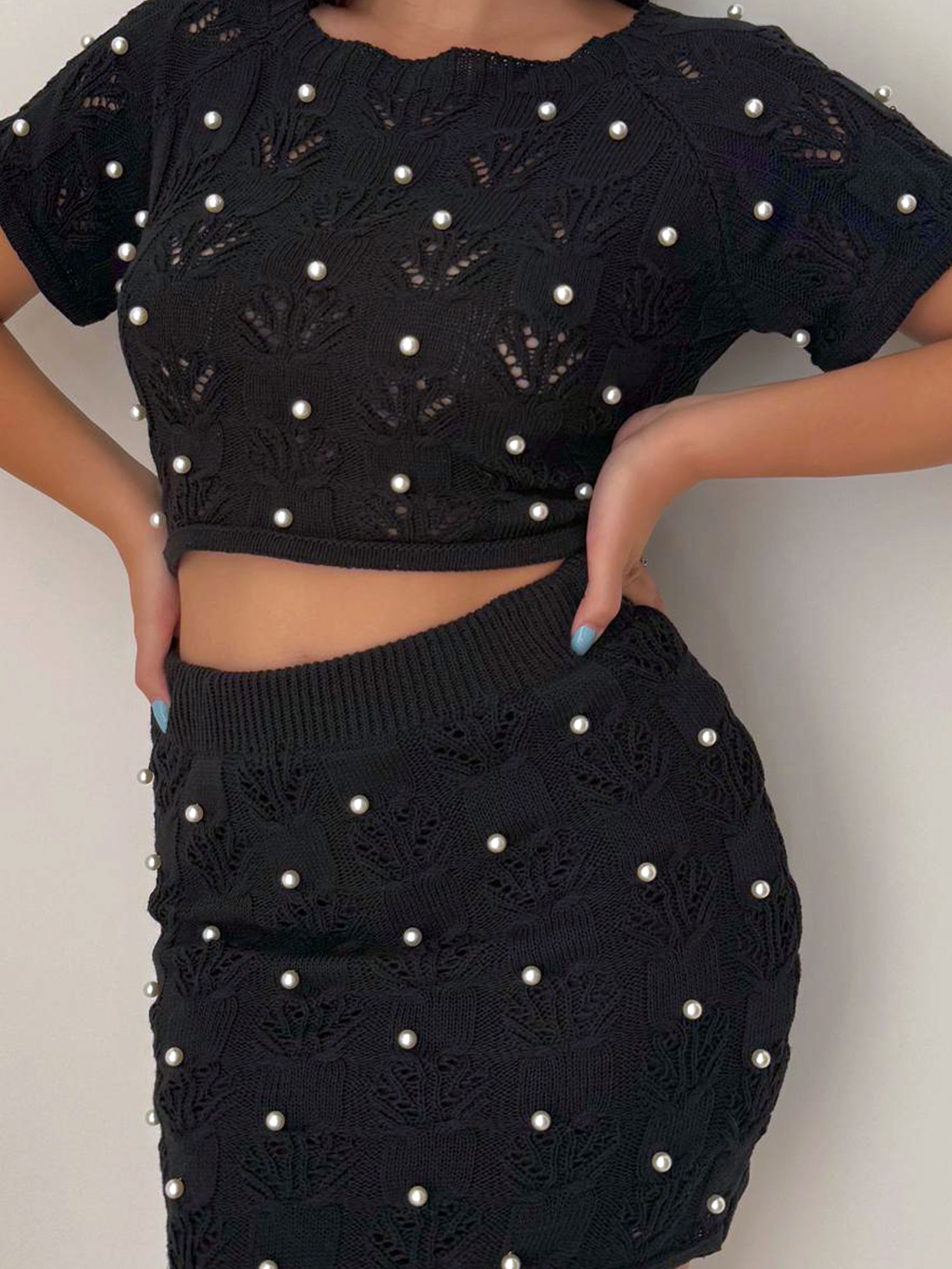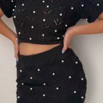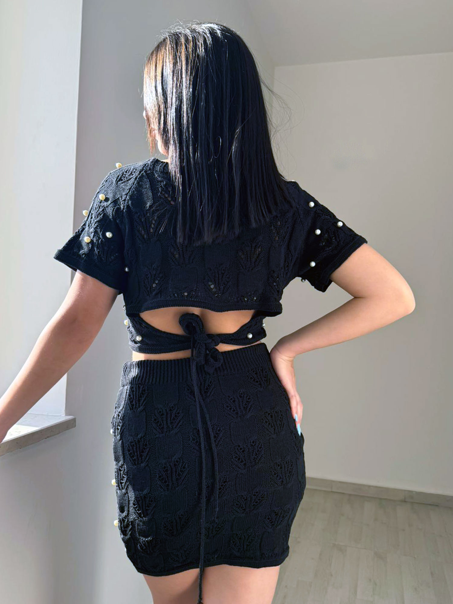 Completo nero formato da maglia a mezze maniche con scollo a cerchio, scollo posteriore a metà schiena e lacci inferiori laterali da poter permettere una vestibilità soggettiva, gonna a matita che arriva alle ginocchia con elastico alto in vita e sottogonna più corto che arriva alla coscia. Entrambi i pezzi seguono una linea di disegno ad uncinetto con rifiniture su qualsiasi bordo e applicazione a filo di perline in rilievo.