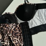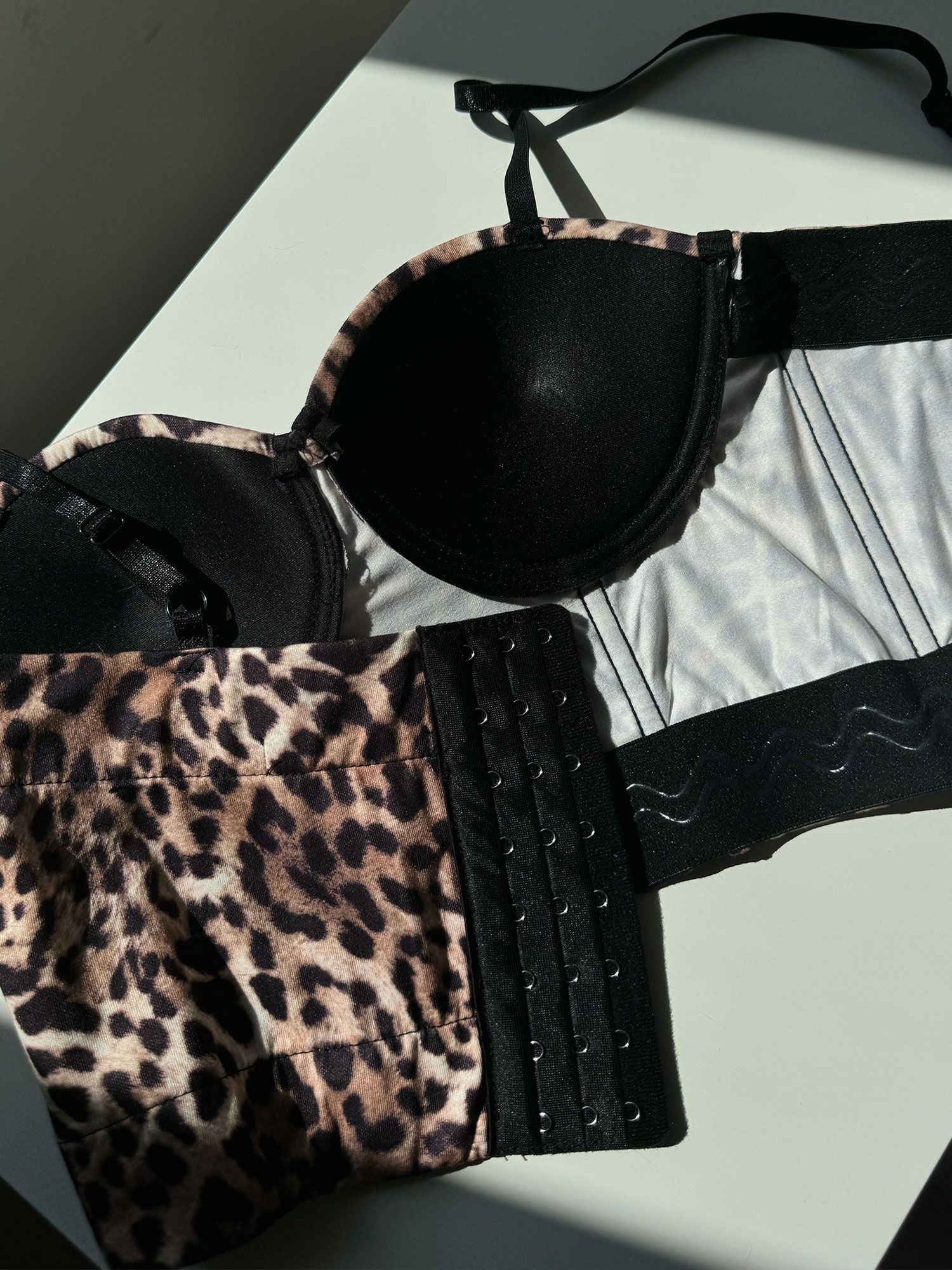 Corsetto leopardato con stecche, coppe interne e bretelle regolabili. Parte interna alle estremità rivestita in silicone, rifinitura capo e particolari in nero, abbottonatura a quattro ciappe su tre fasce verticali di misura. tessuto elastico e definito, modellante.