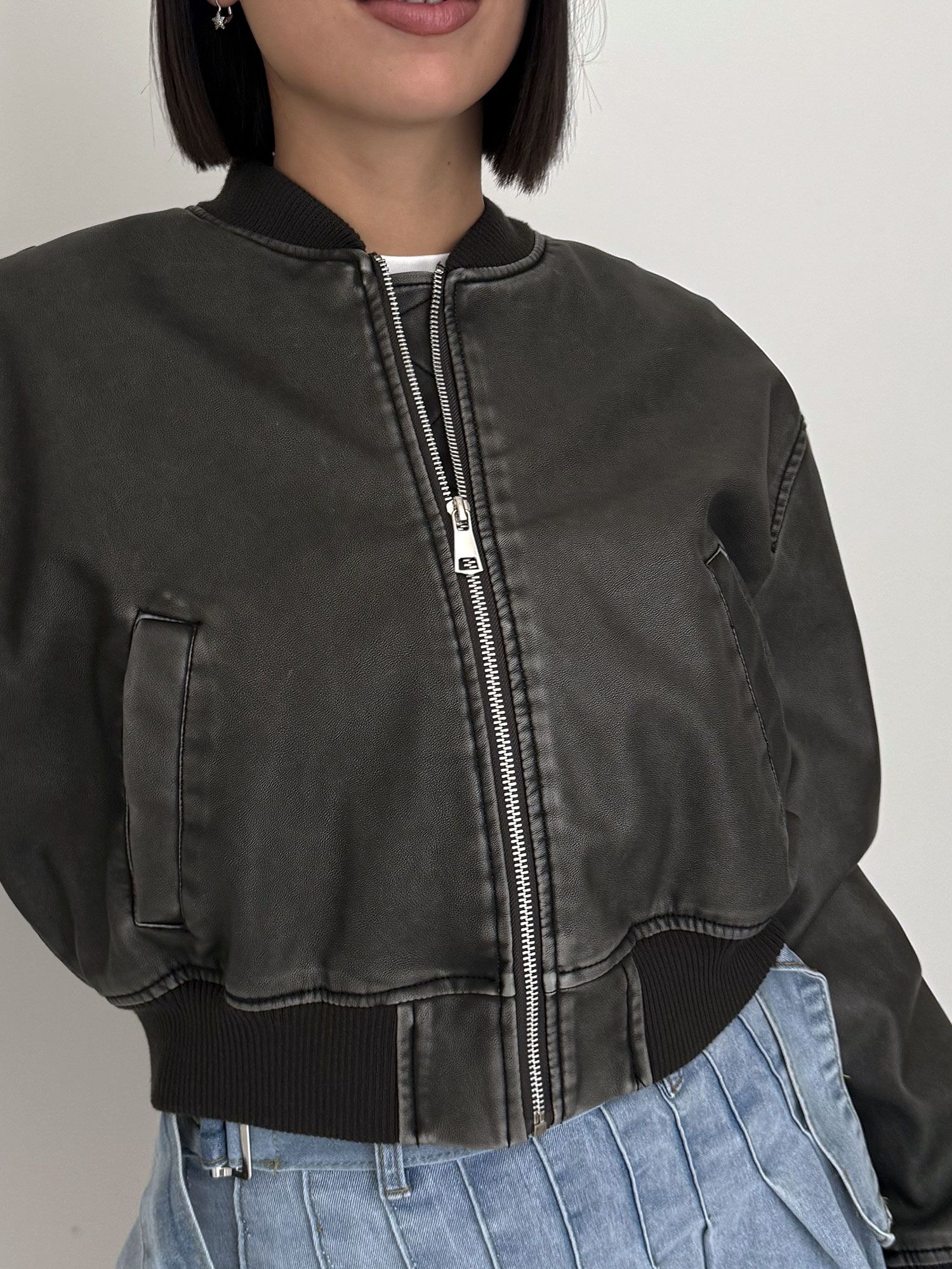 Giubbotto similpelle con zip in acciaio e fascia elastica a costine sia in vita e sia sui polsini, tasche anteriori, foderato.