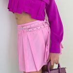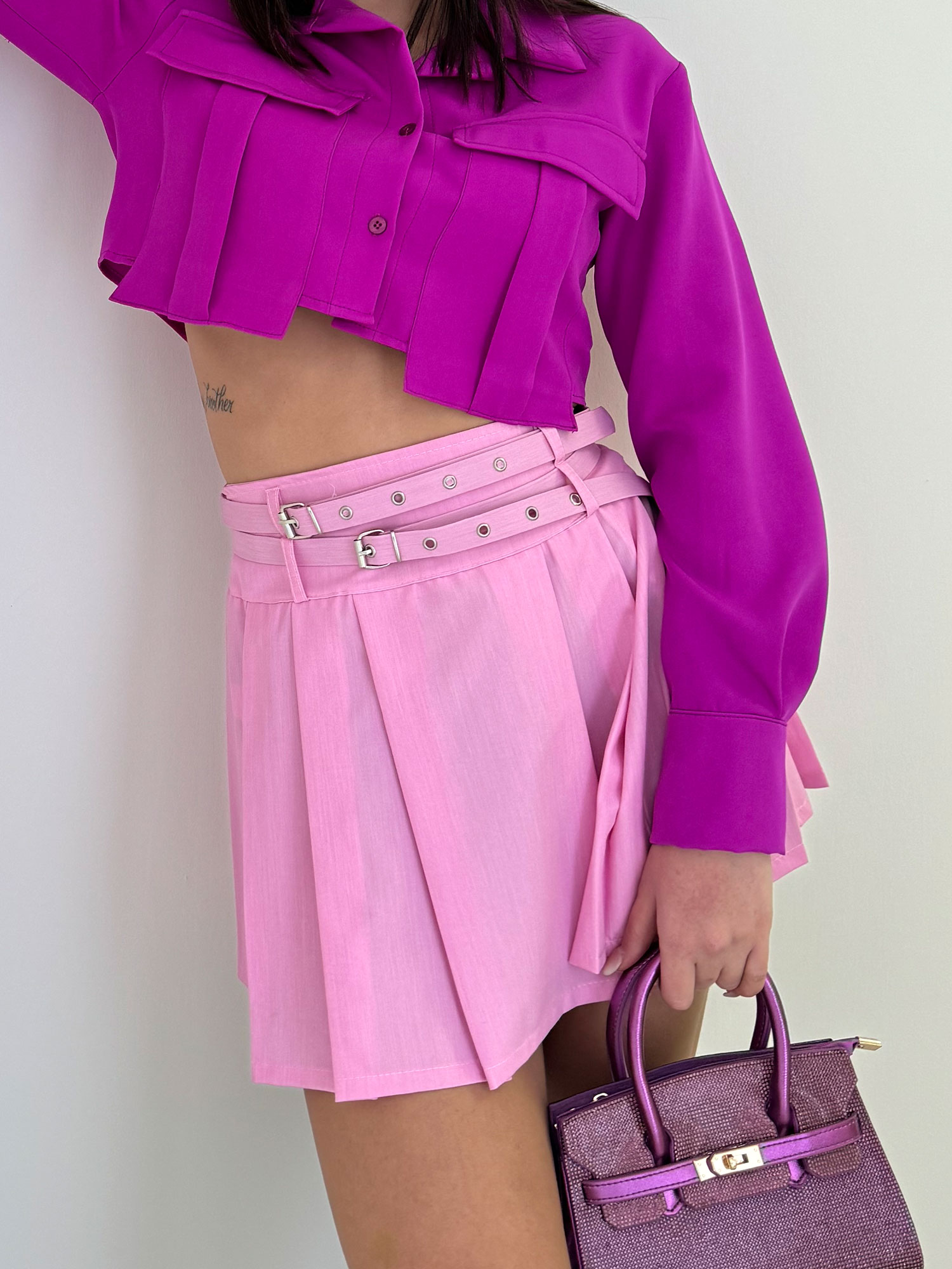 Gonna mini vita alta con bustino e due passanti con due cinturini regolabili in tinta tessuto e fibbie in acciaio, pieghe e mezzaruota, zip invisipile posteriore.