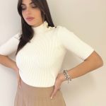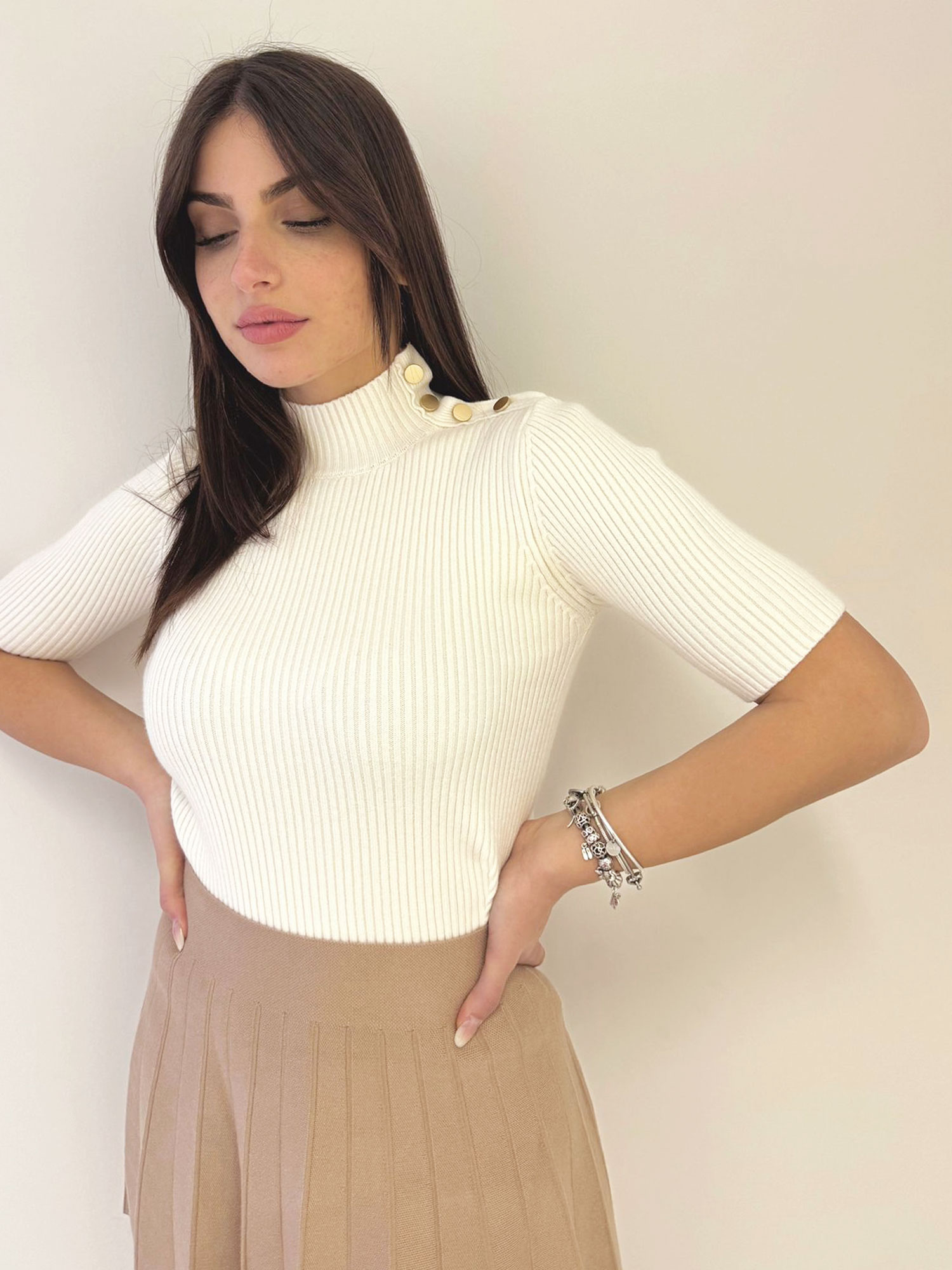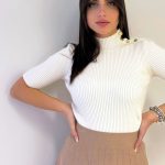 Maglia a costine con manica al gomito e scollo a mezzocollo, particolarità di inserti in ottone dorato orizzontali sulla parte destra che parte dallo scollo alla spalla con cuciture in rilievo.