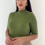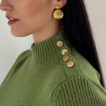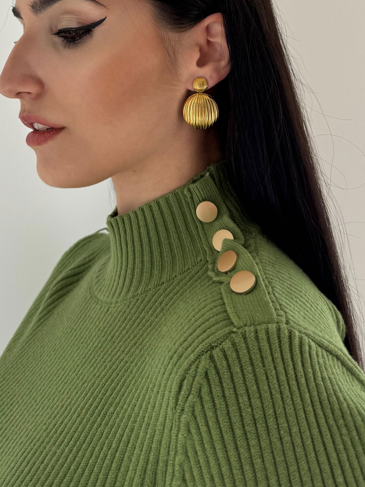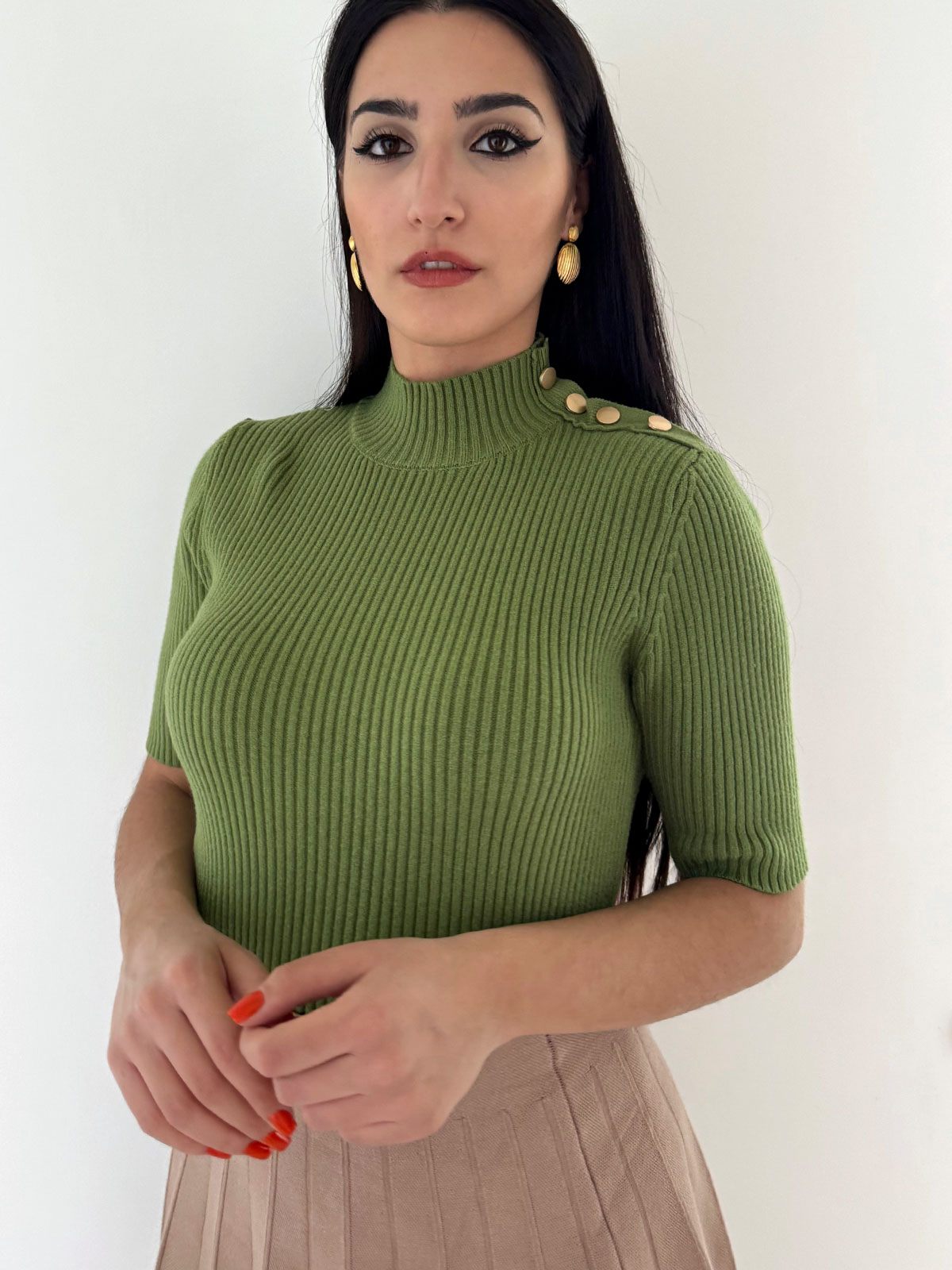 Maglia a costine con manica al gomito e scollo a mezzocollo, particolarità di inserti in ottone dorato orizzontali sulla parte destra che parte dallo scollo alla spalla con cuciture in rilievo.
