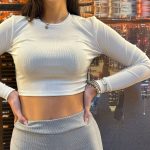 Maglia leggera a costine crop nera, maniche lunghe e scollo a cerchio, vestibilità aderente.