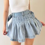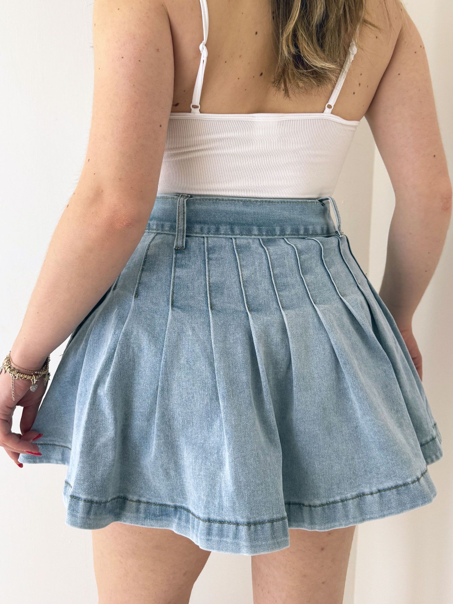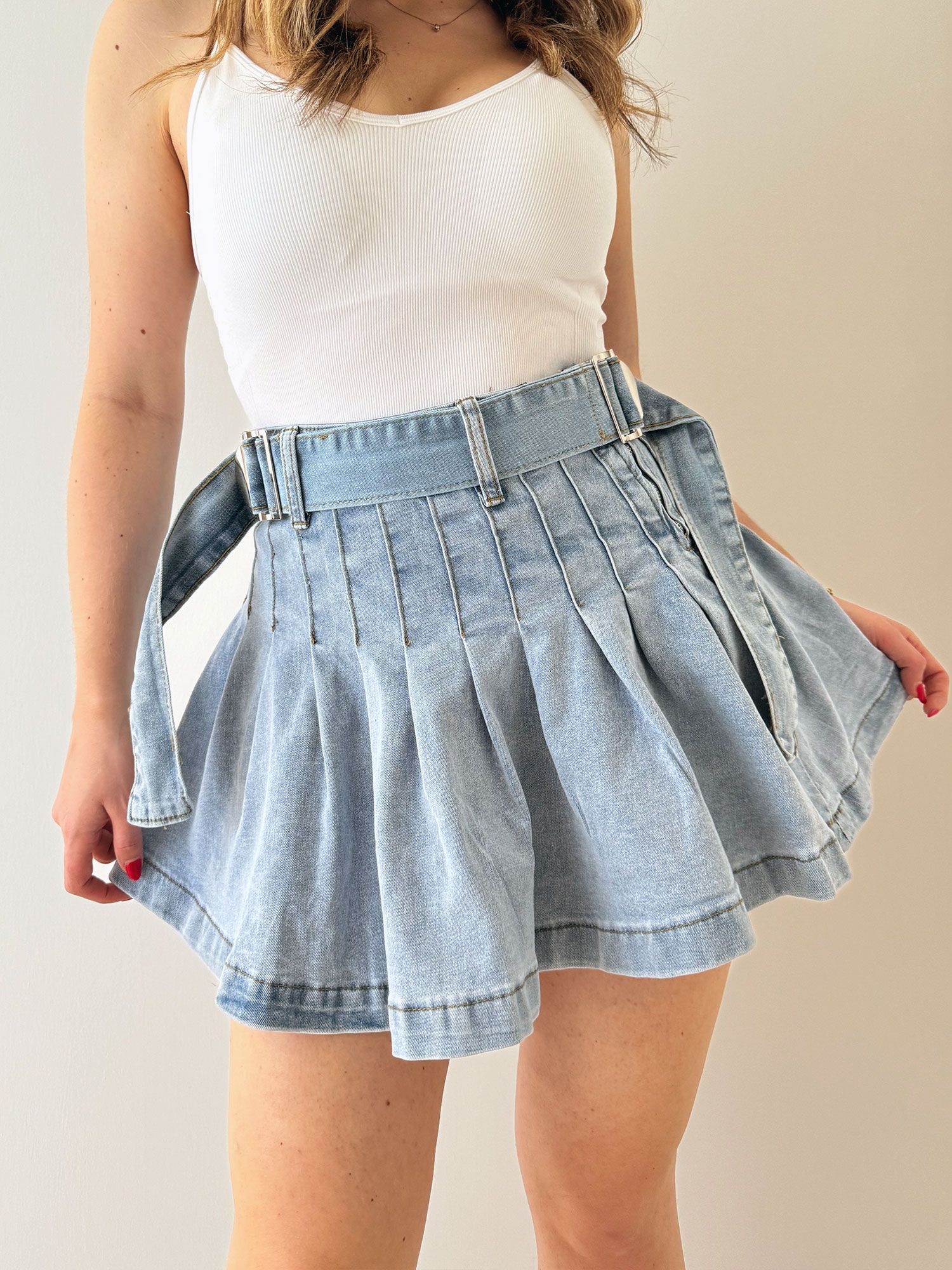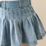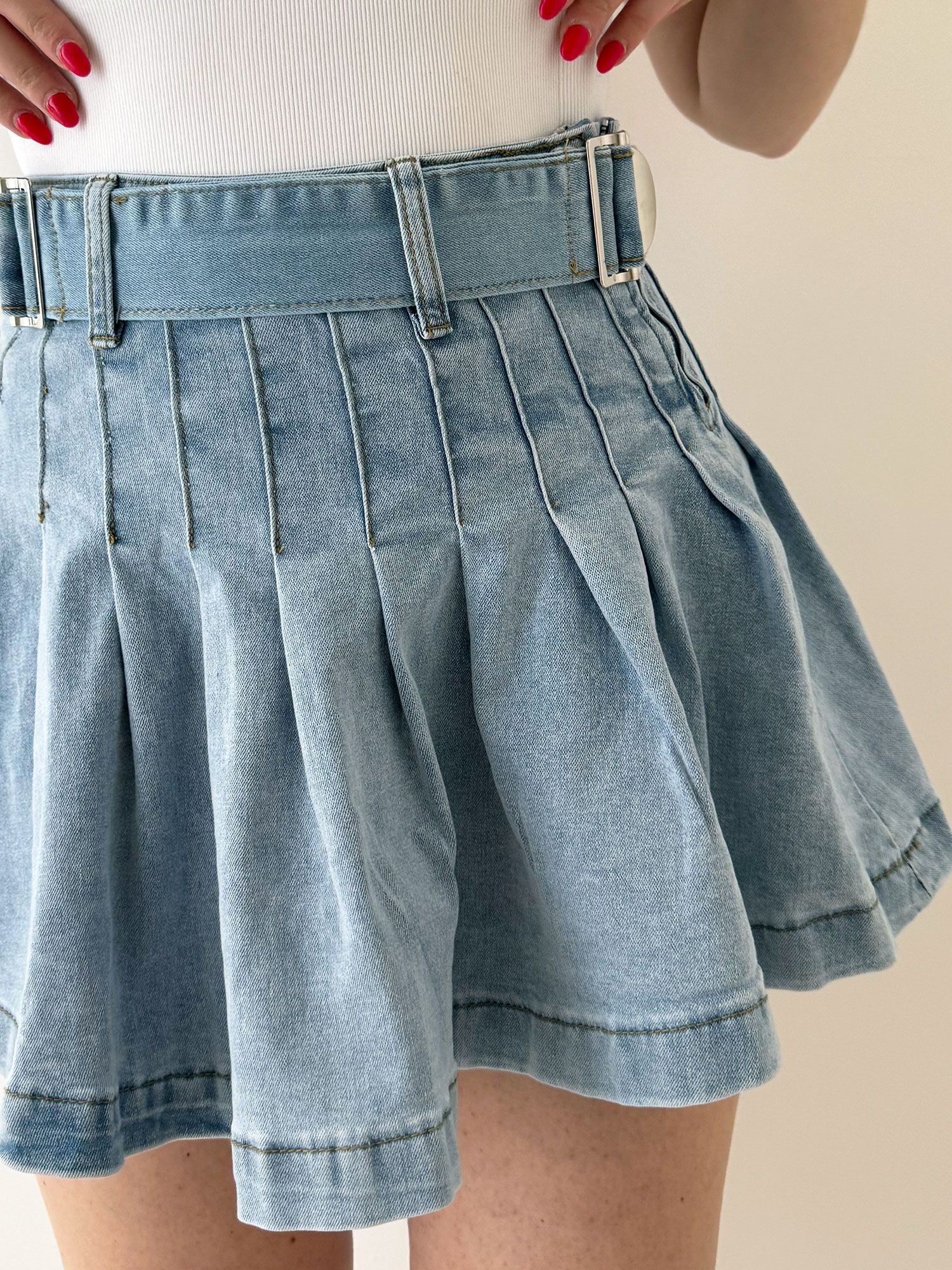 Minigonna in denim lavaggio mediochiaro vita alta ed elastica, cintura in tinta con fibbie laterali in acciaio con passanti, pieghe che si estendono per tutto il capo con annesse riprese verticali, il retro è leggermente più lungo del davanti per permettere una vestibilità ottimale. Zip di chiusura in acciaio laterale.