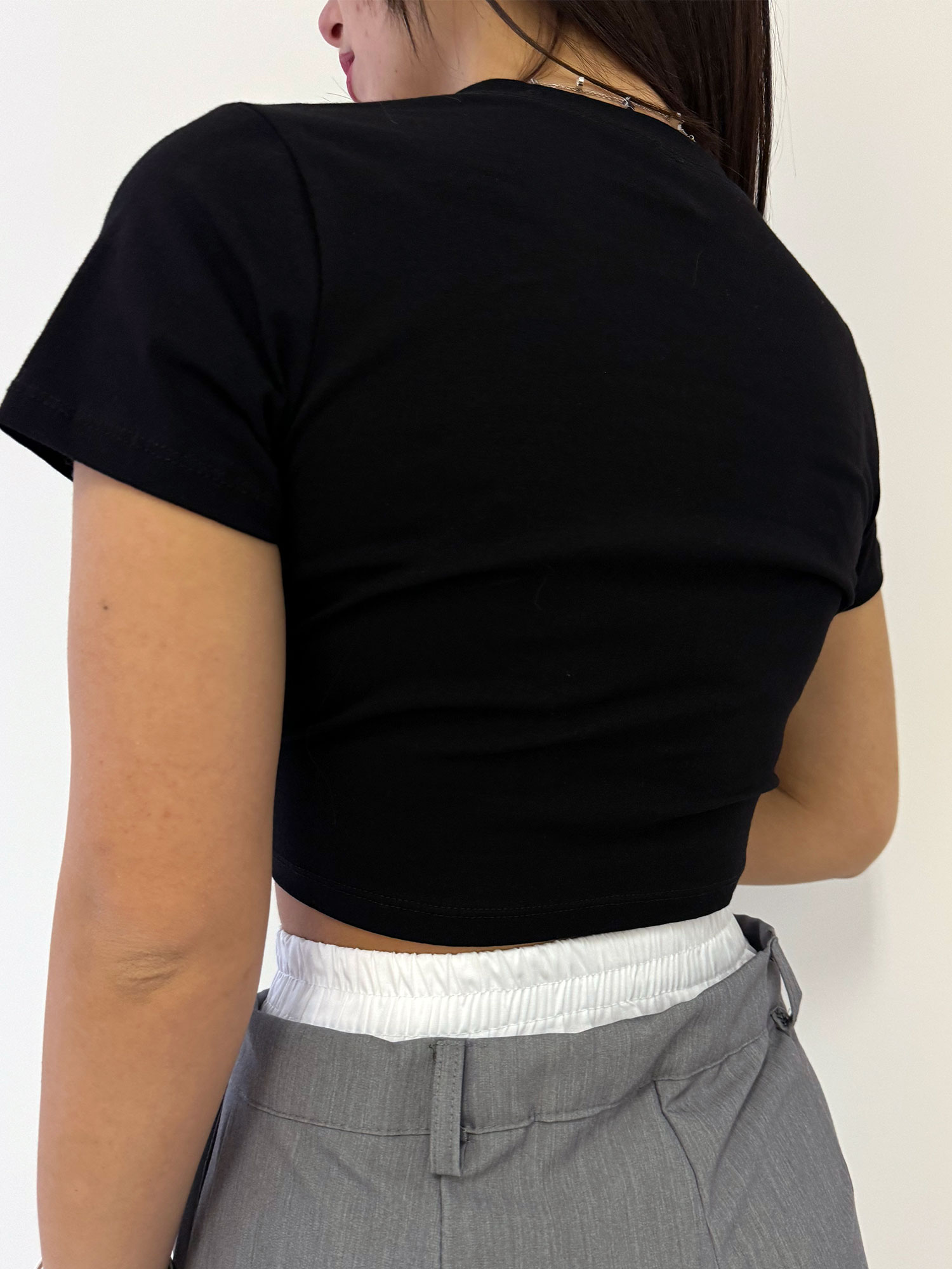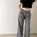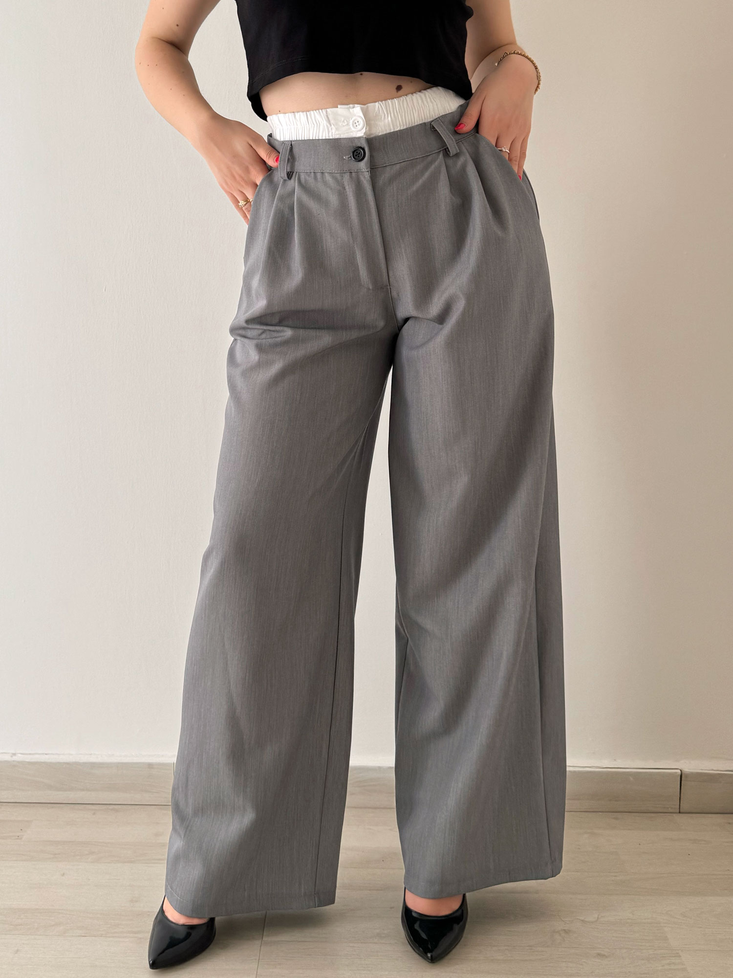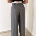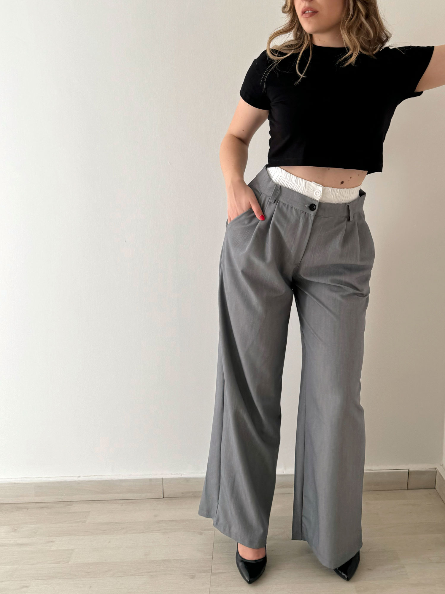 Pantalone grigio a vita alta con particolarità elastico arricciato bianco contenente un bottone in tinta, passacintura, tasche frontali e pence.