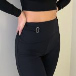 Pantalone nero elastico fasciante a vita regolabile con rivolto e cinghia in acciaio come decorazione, aderente per tutta la coscia per poi scendere più scampanato dal ginocchio.