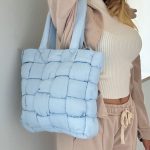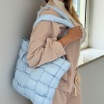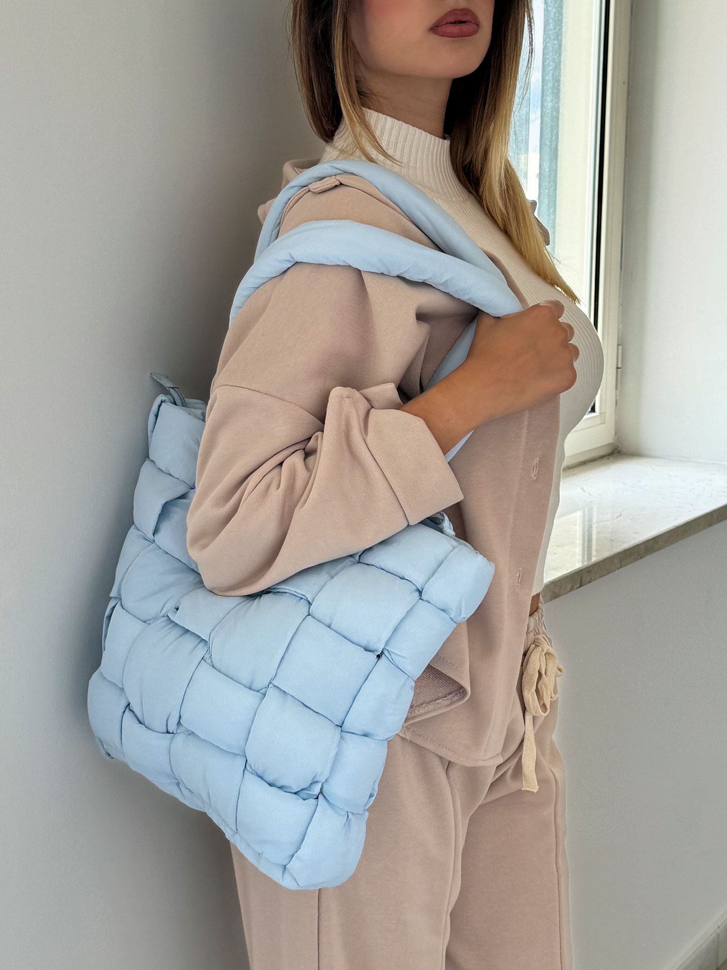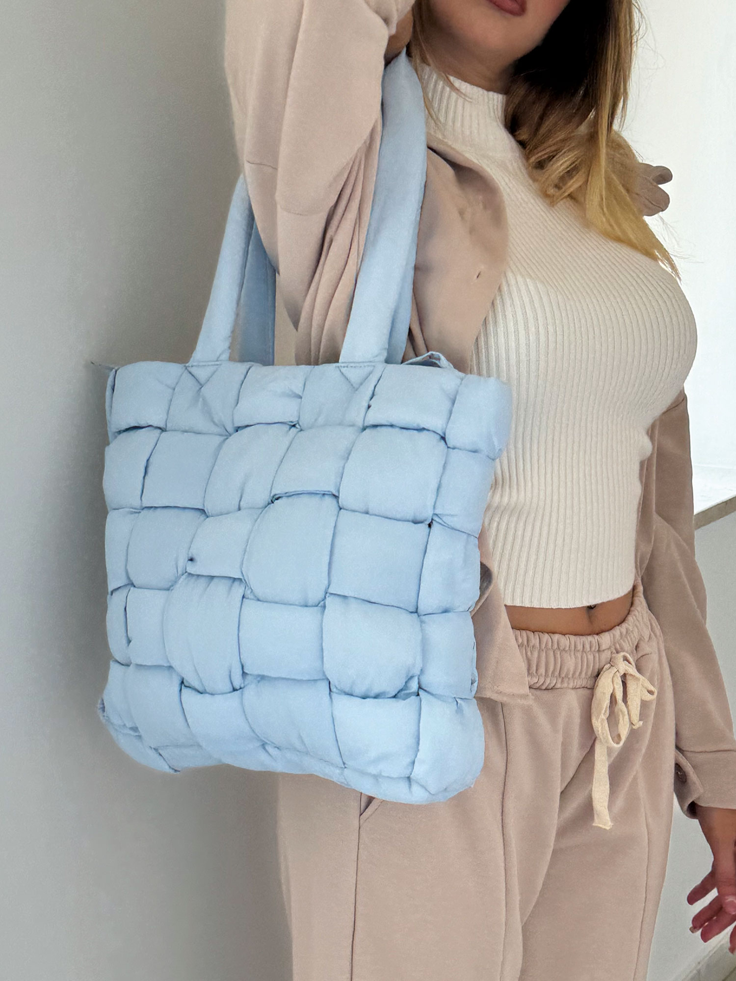 Borsa imbottita azzurro pastello dal design trapuntato e moderno, con chiusura a zip e interno foderato dotato di tasche multiuso. Le maniglie imbottite garantiscono comfort, mentre le dimensioni capienti la rendono perfetta per l'uso quotidiano. Un accessorio ideale per chi cerca eleganza e funzionalità in un solo prodotto.
