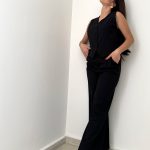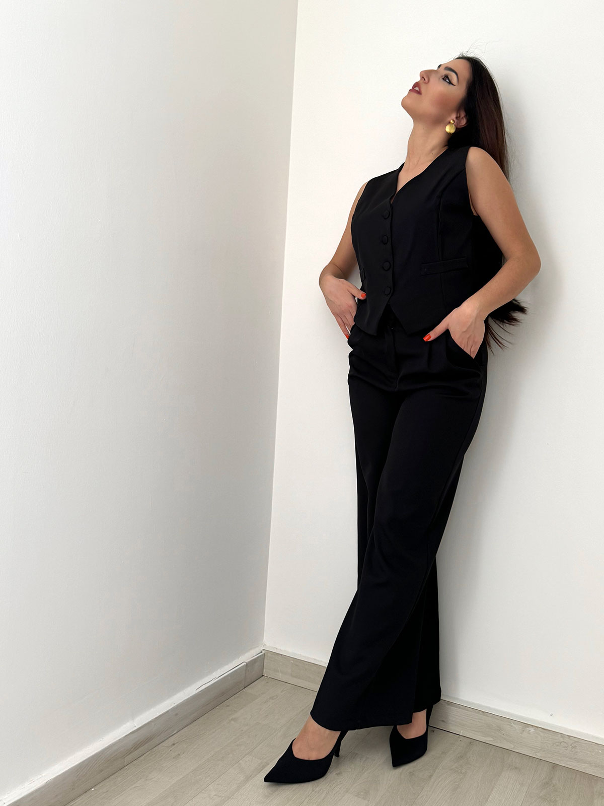 Panciotto smanicato con pantalone palazzo nero.