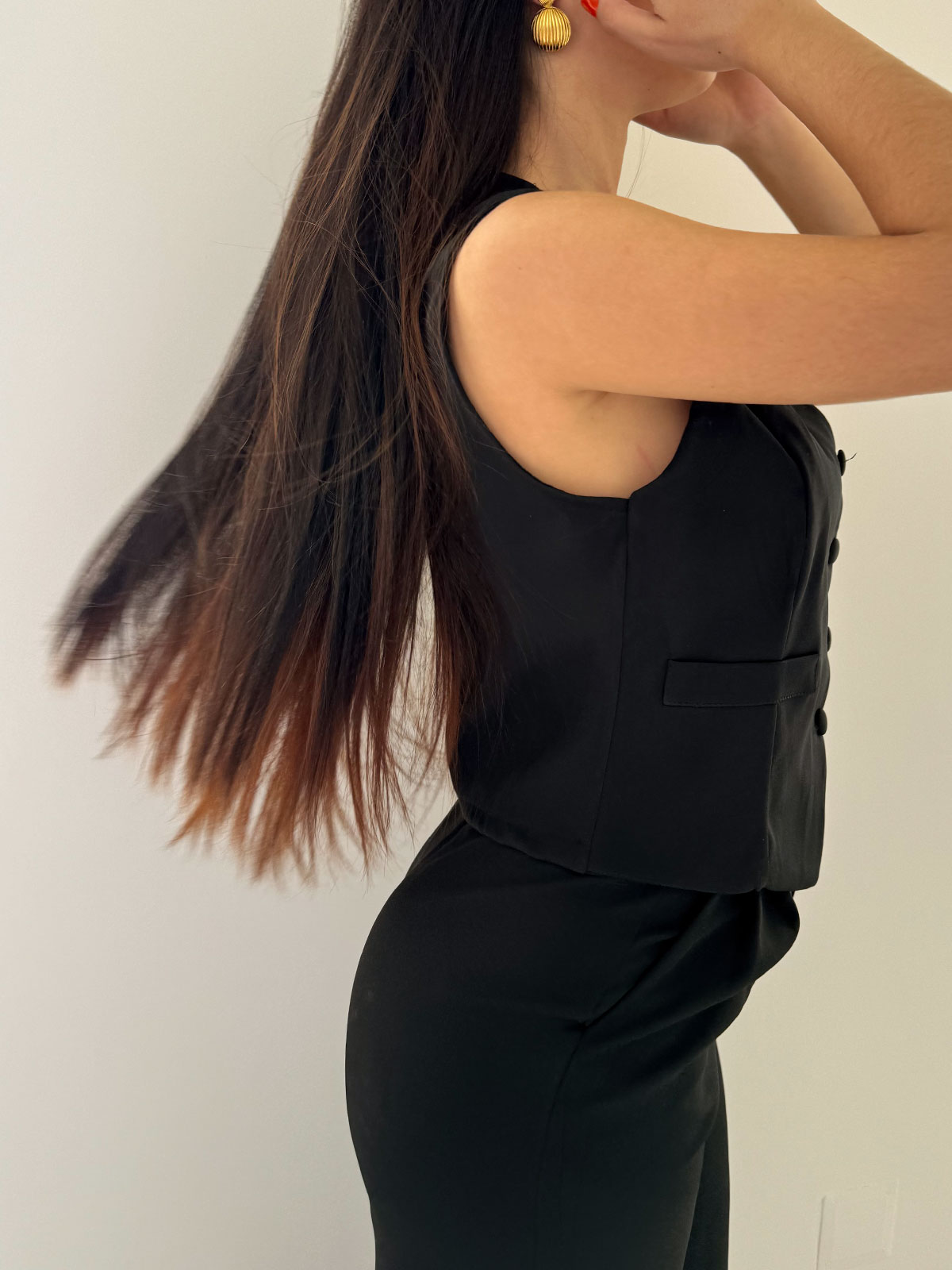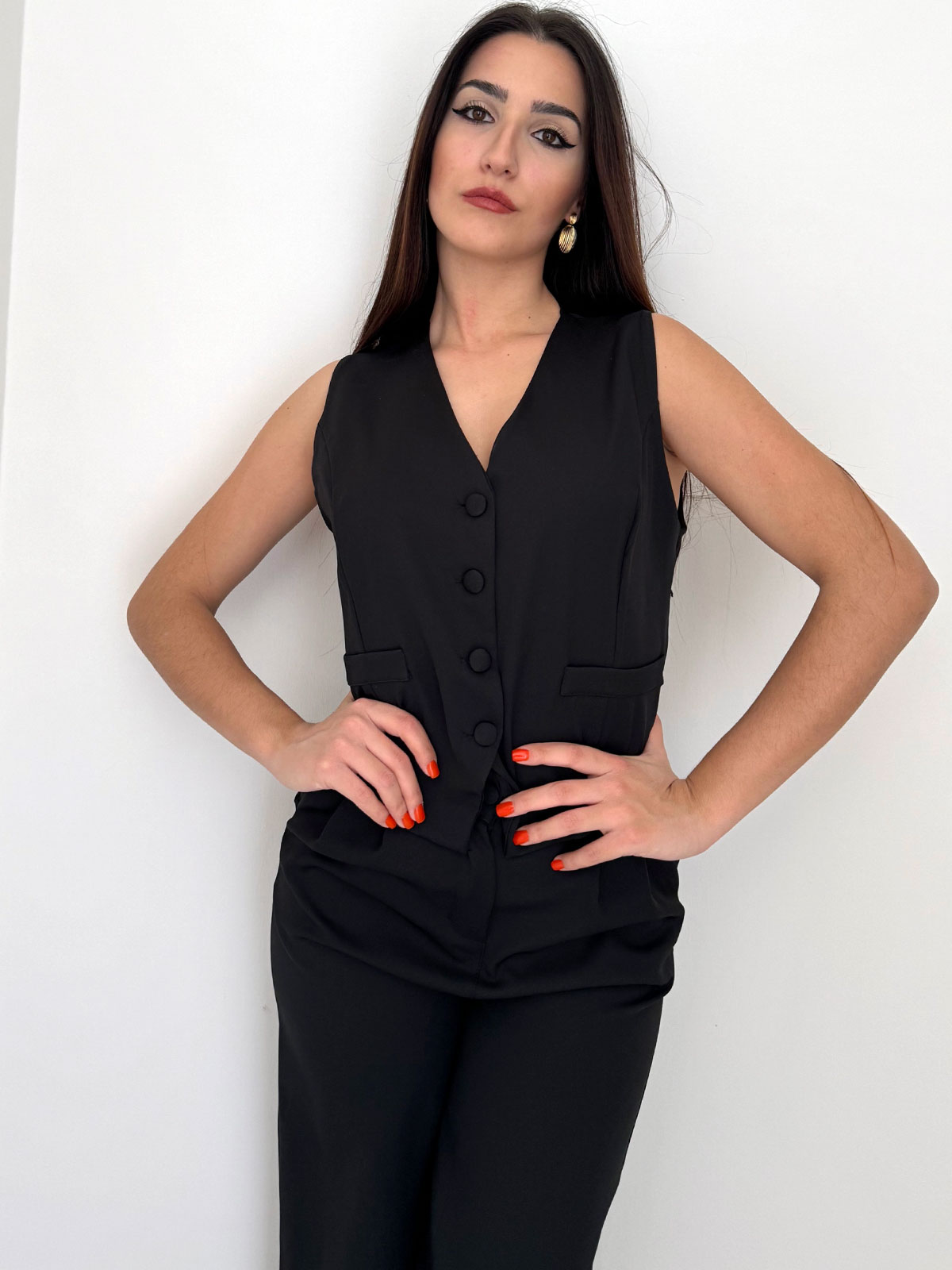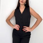Panciotto smanicato nero con abbottonatura a bottoni, pantalone vita alta a palazzo nero.