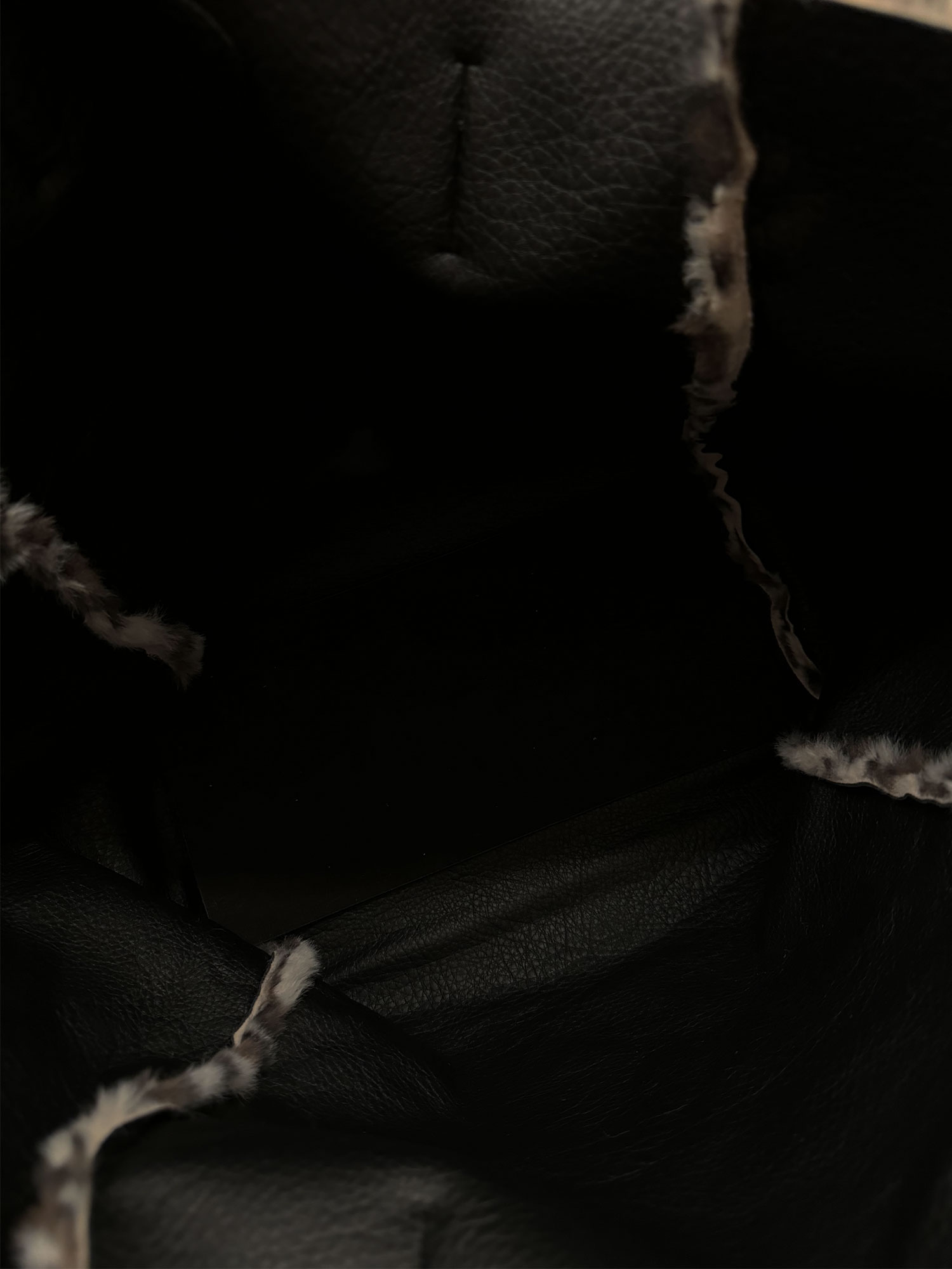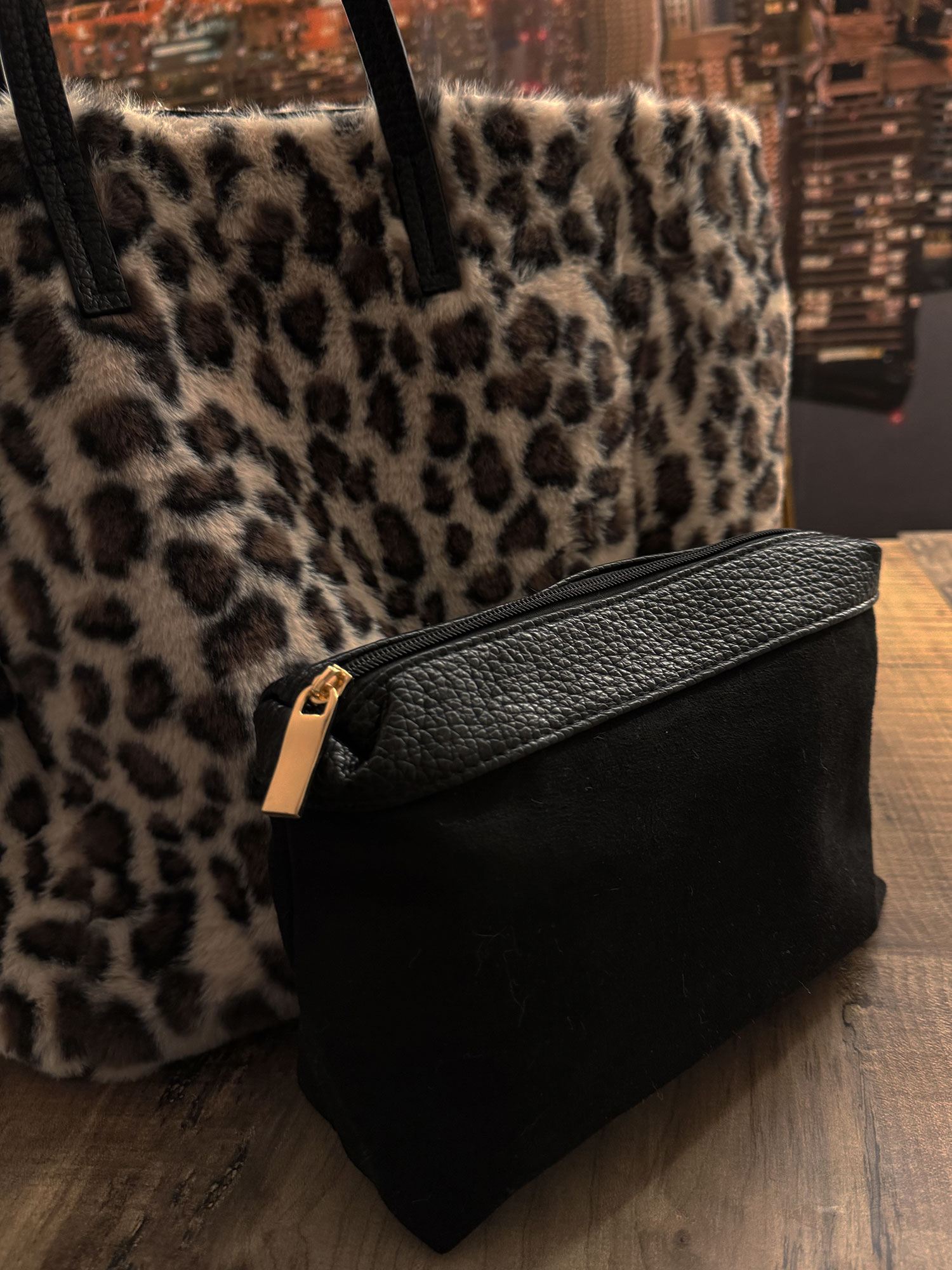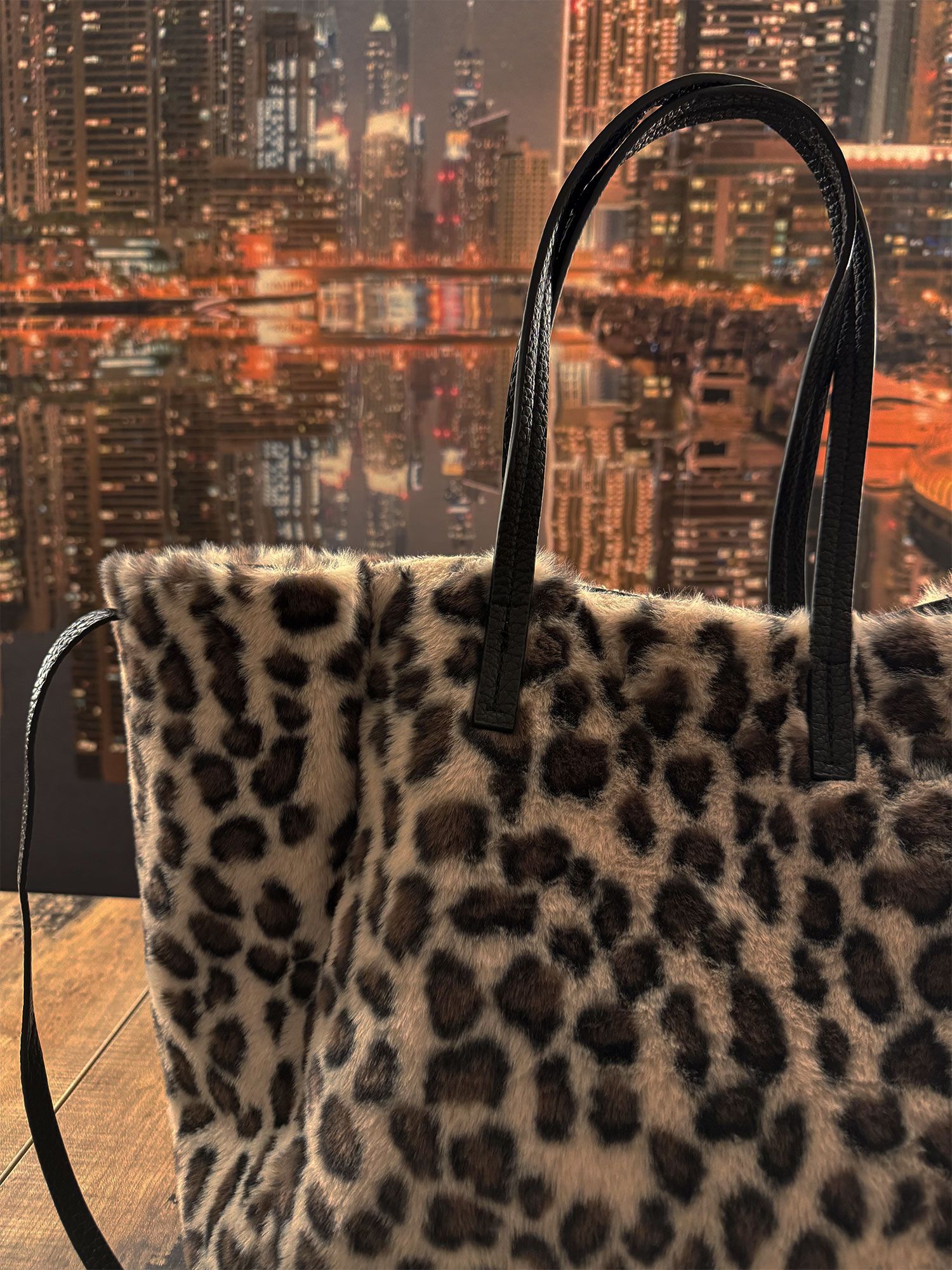 Borsa a spalla in pelliccia sintetica leopardata, con manici in similpelle nera e dettagli versatili. Grazie ai lacci laterali può essere regolata in una forma compatta e chic, mentre la chiusura a clip nascosta garantisce sicurezza. Completa di una pochette interna nera con zip, ideale per riporre piccoli oggetti personali. Perfetta per un look glamour e pratico.