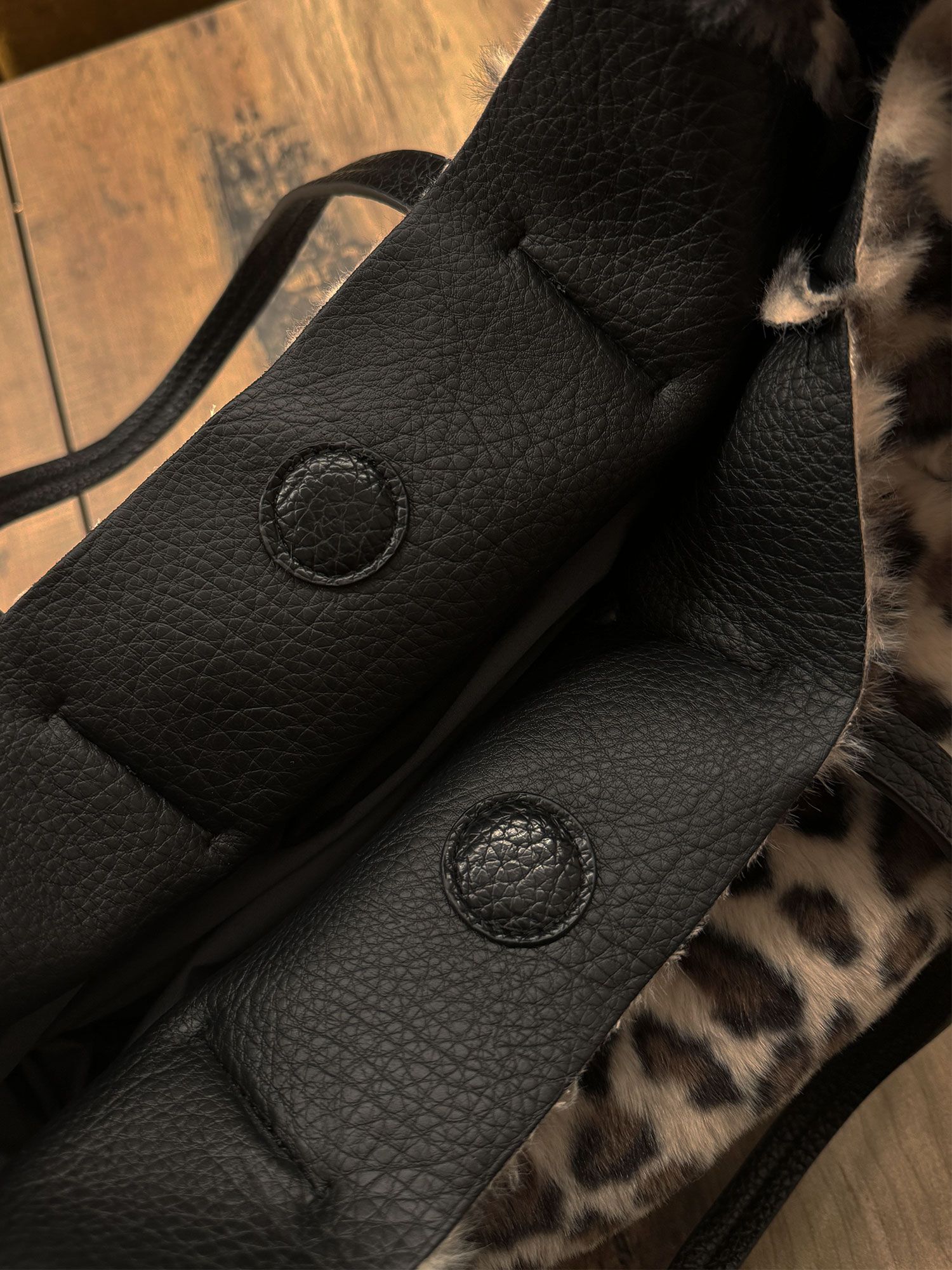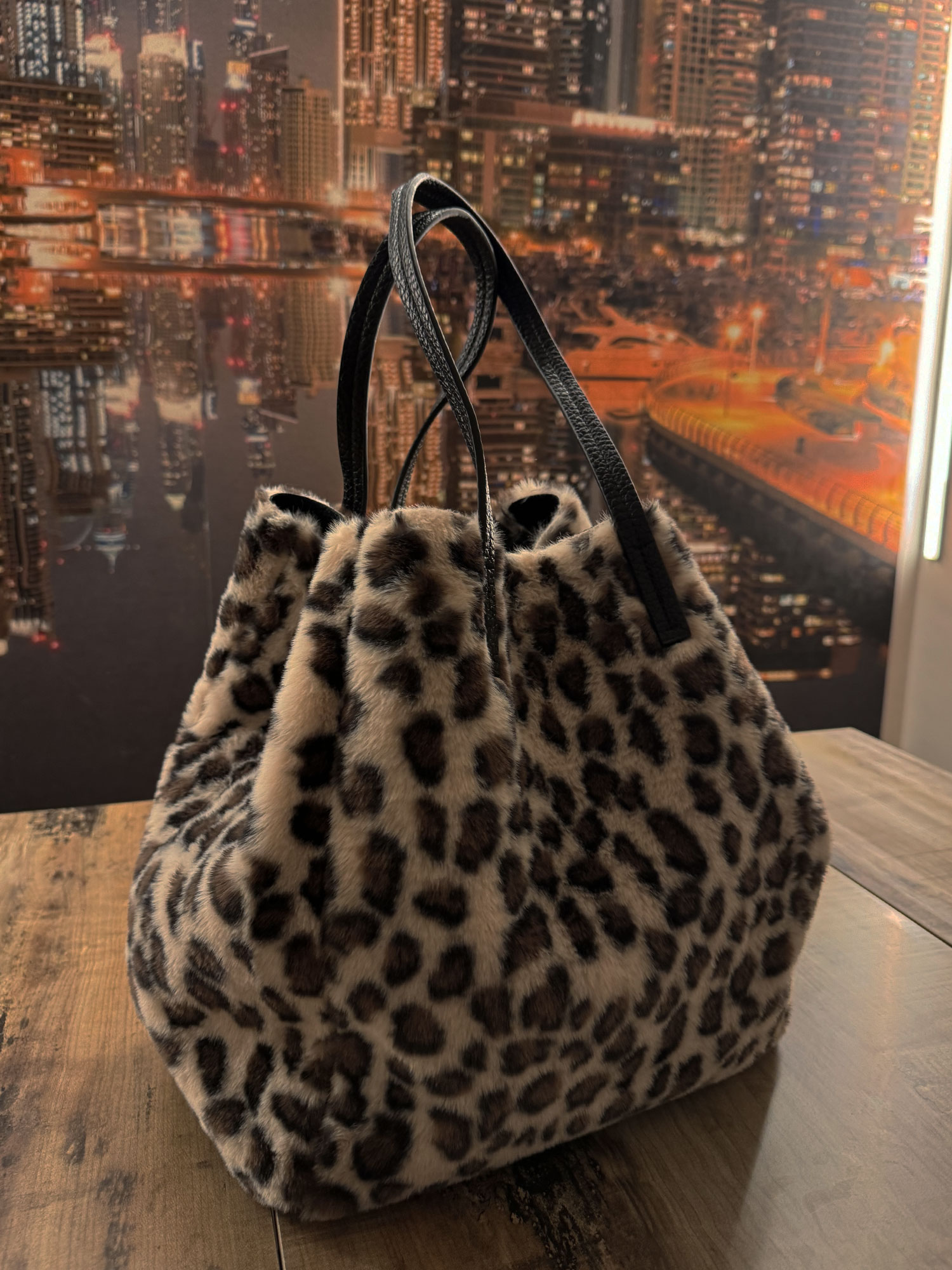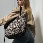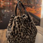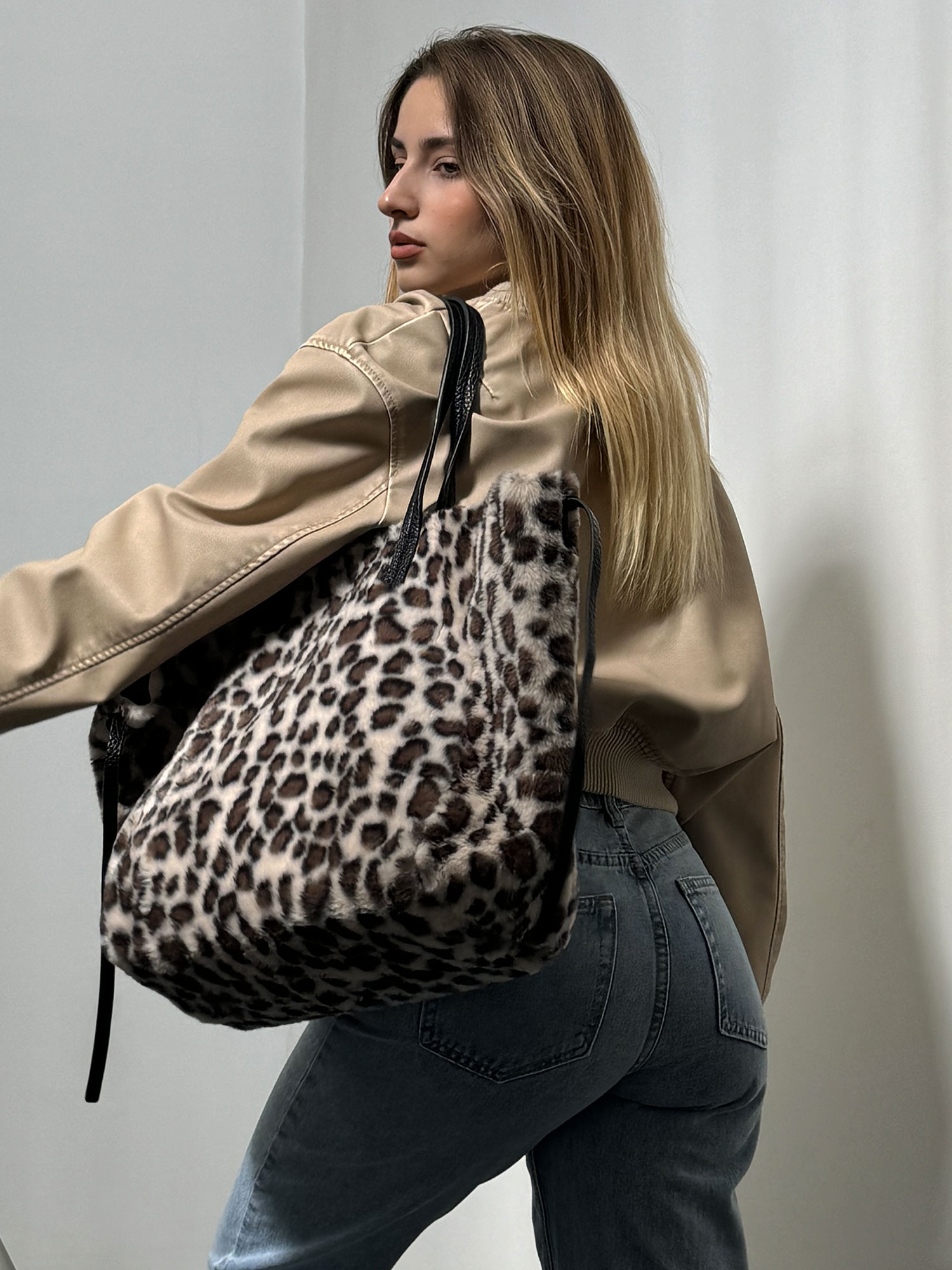 Questa borsa a spalla dal design accattivante con stampa animalier, caratterizzata da una texture soffice effetto pelliccia sintetica leopardata, è un accessorio che unisce eleganza e praticità. Dotata di manici in similpelle nera, si distingue per la sua versatilità grazie a una particolare struttura regolabile: due lacci laterali consentono di stringere la borsa, donandole una forma più compatta e stilosa come mostrato nella seconda foto.