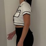 Top a costine bianco a mezze maniche con collo risvoltato, taglio mediocrop con contrasto di linee nere che contornano il capo, tasche anteriori frontali su petto chiusura verticale, abbottonatura a taglio a ovale con inserti argentati, brillantini e pietra di color madreperla.