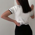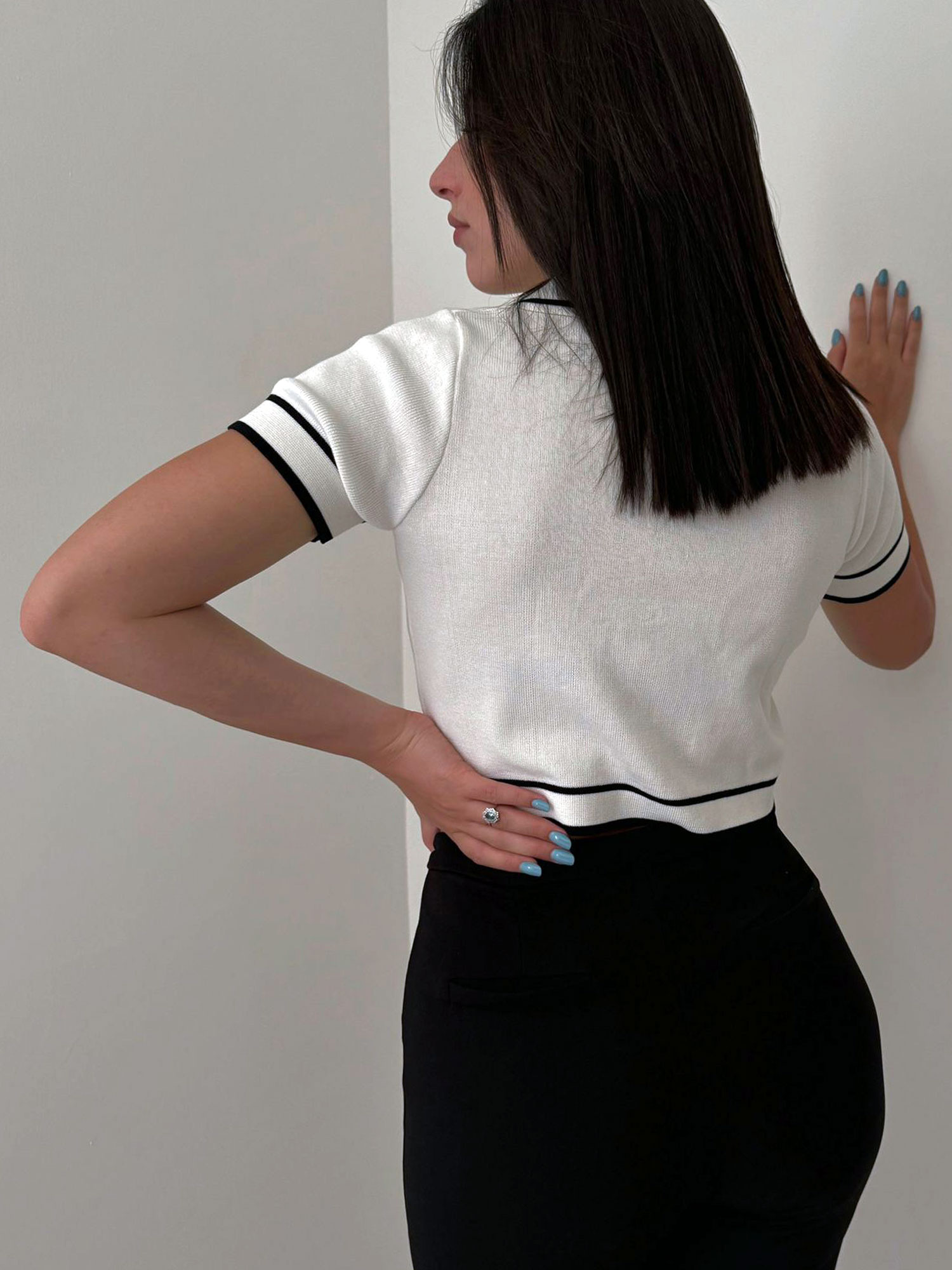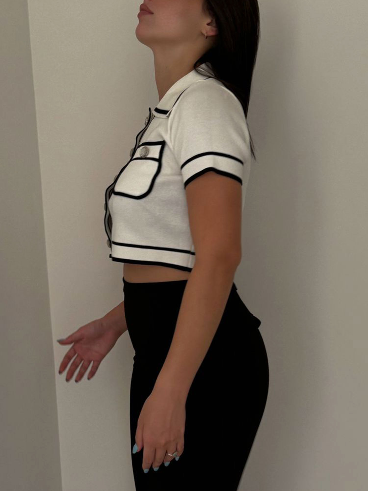 Eleva il tuo stile con il nostro top a maniche corte, dal design elegante e moderno. Questo top bianco è caratterizzato da un raffinato contrasto di bordi neri che delineano il colletto, i polsini e le tasche, creando un effetto visivo chic e sofisticato. I bottoni decorativi sul davanti e sulle tasche aggiungono un tocco di lusso e dettagli ricercati. Il taglio corto è perfetto per abbinamenti con pantaloni a vita alta o gonne, ideale per look casual eleganti o per occasioni speciali. Realizzato in tessuto di alta qualità, offre comfort e stile in ogni occasione.