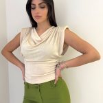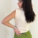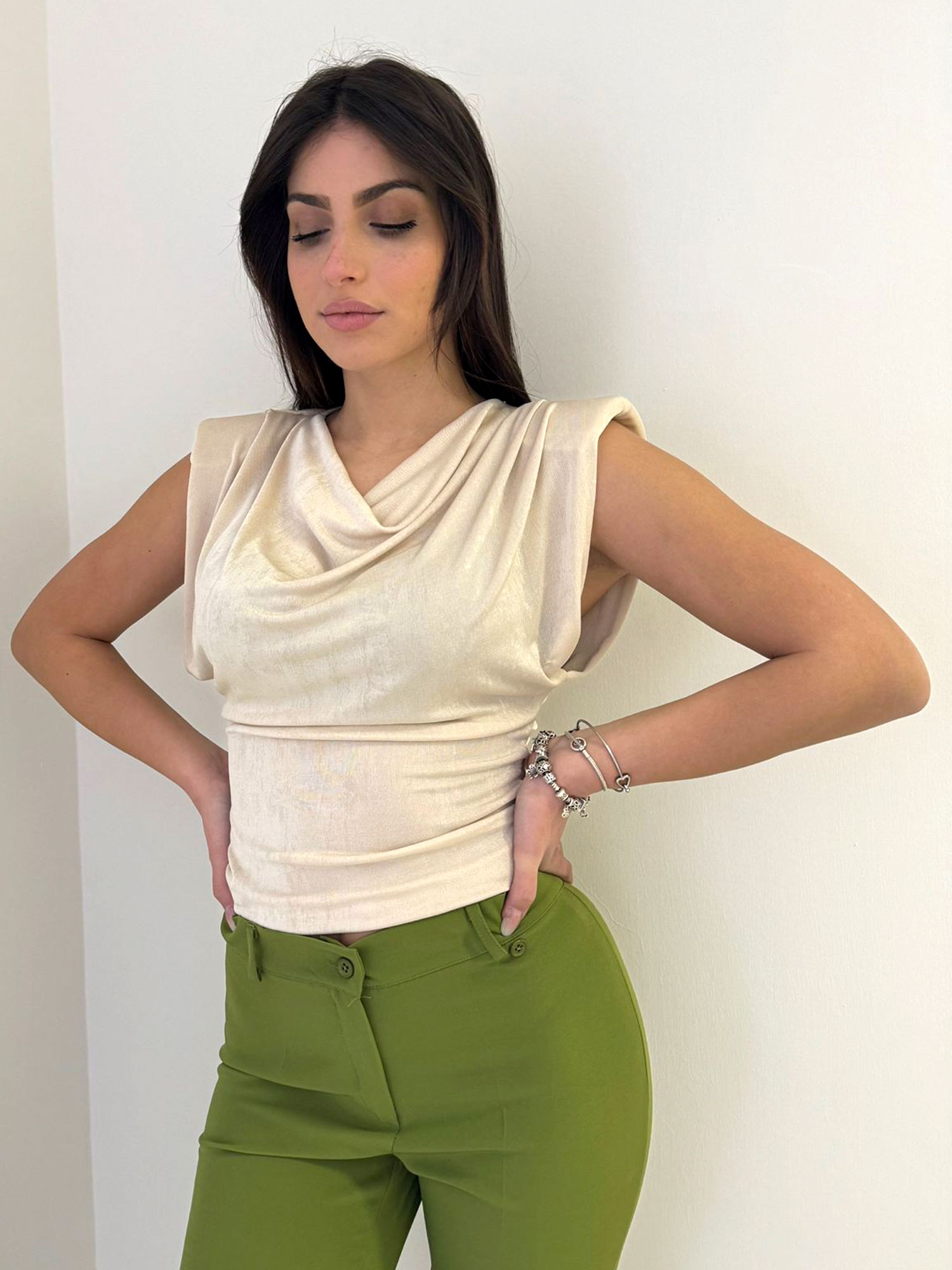 Top con spalline ampie rigide e scollo morbido, vestibilità aderente, taglio regular, leggere arricciature sui laterali.