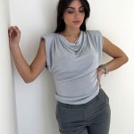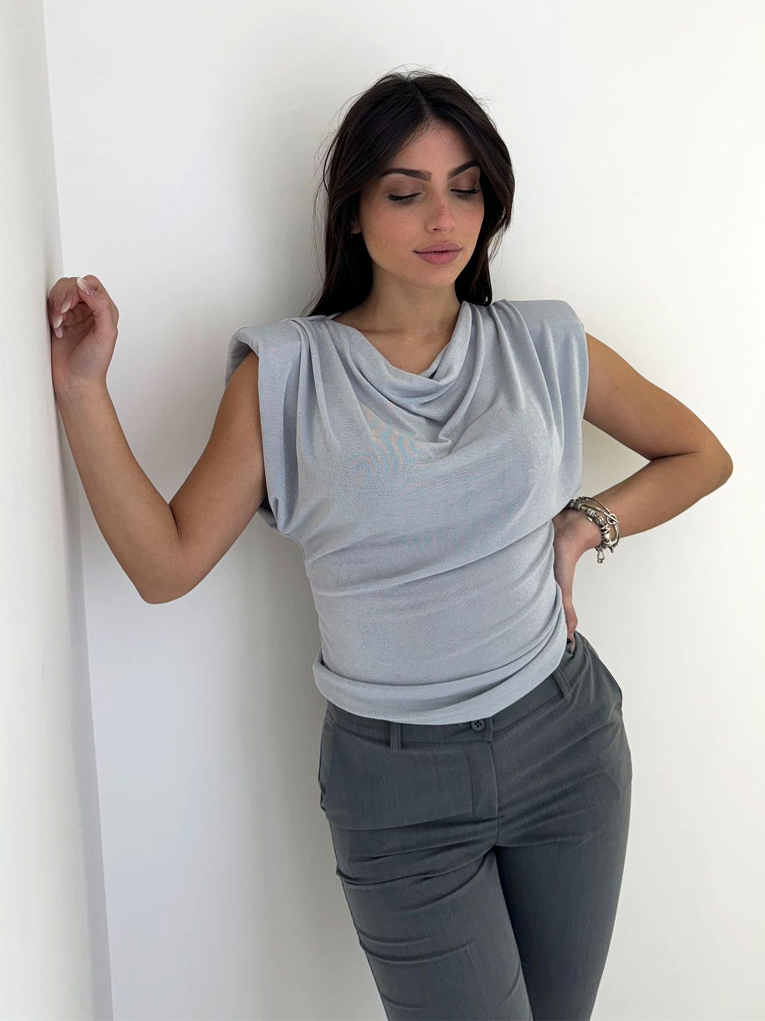 Top con spalline ampie rigide e scollo morbido, vestibilità aderente, taglio regular, leggere arricciature sui laterali.