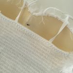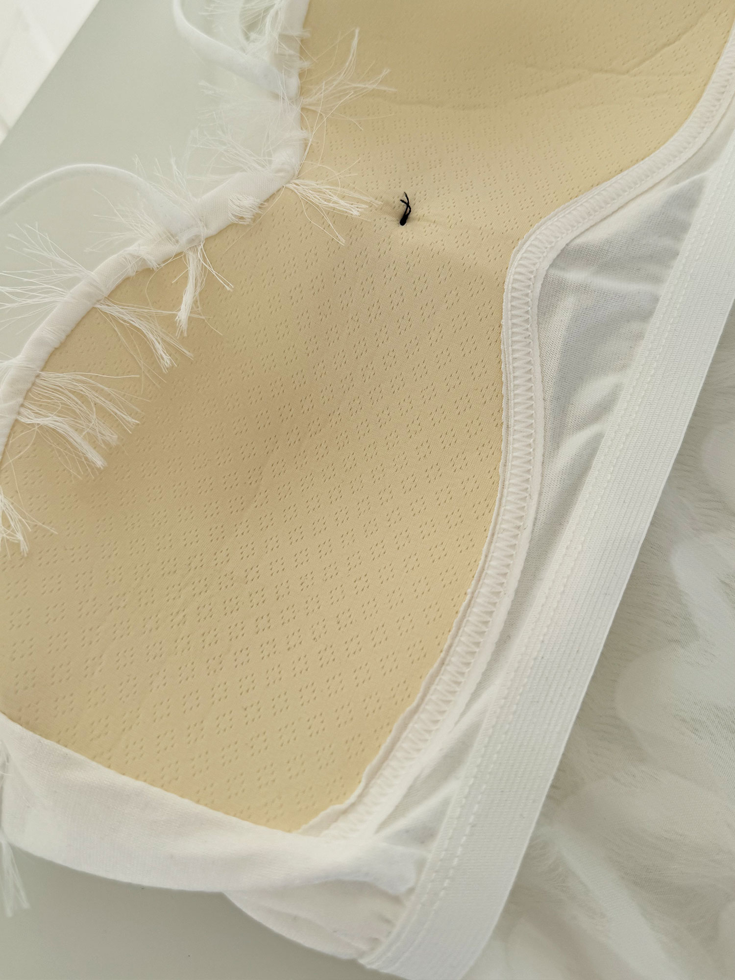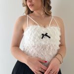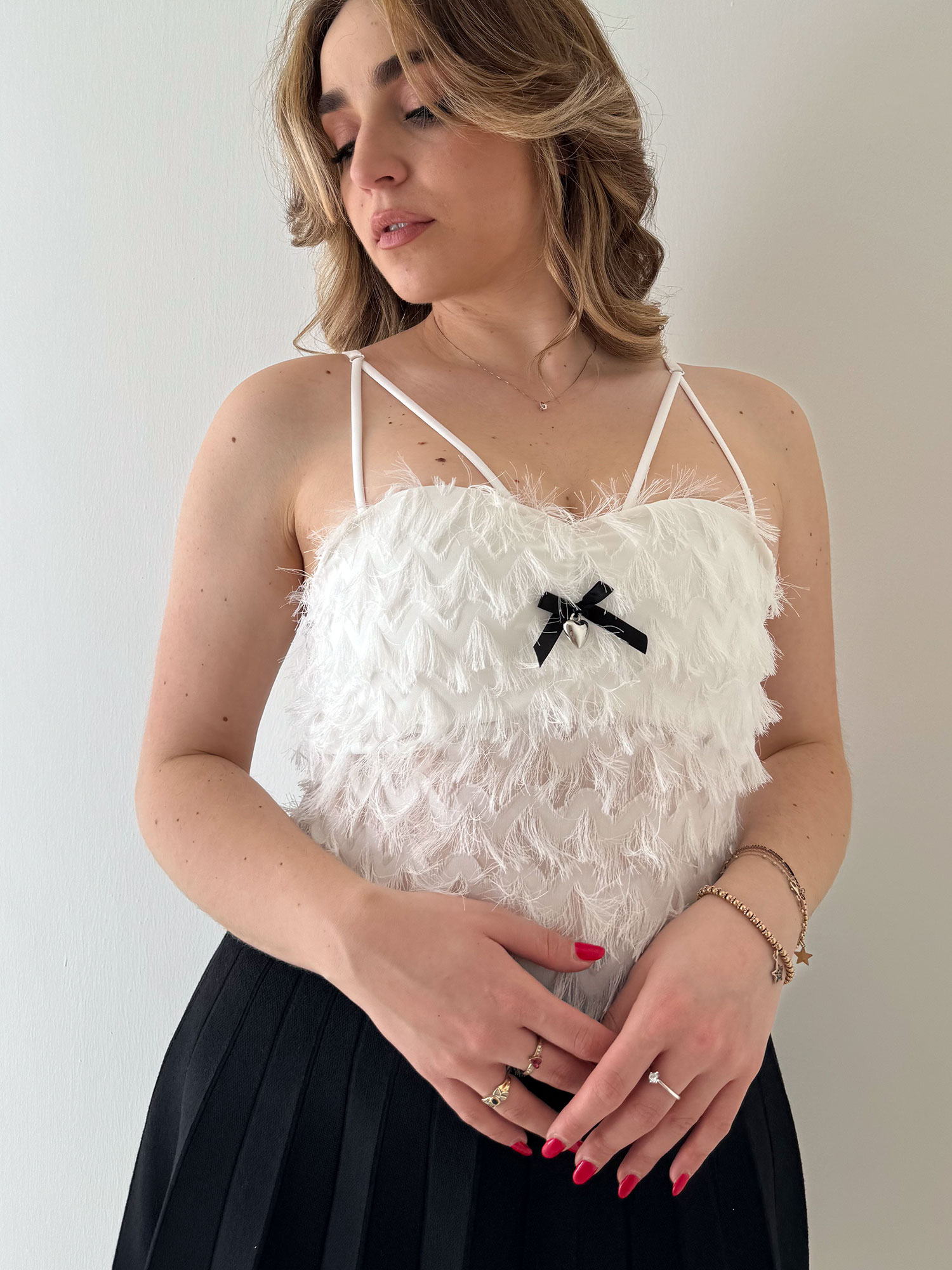 Top bianco con tessuto a composizione geometrica con fragiature a filo,arricciuatura posteriore, applicazione su scollo anteriore di un fiocco color nero con cuore in acciaio come pendente. Spalline regolabili con coppe interne e elastico di resistenza.