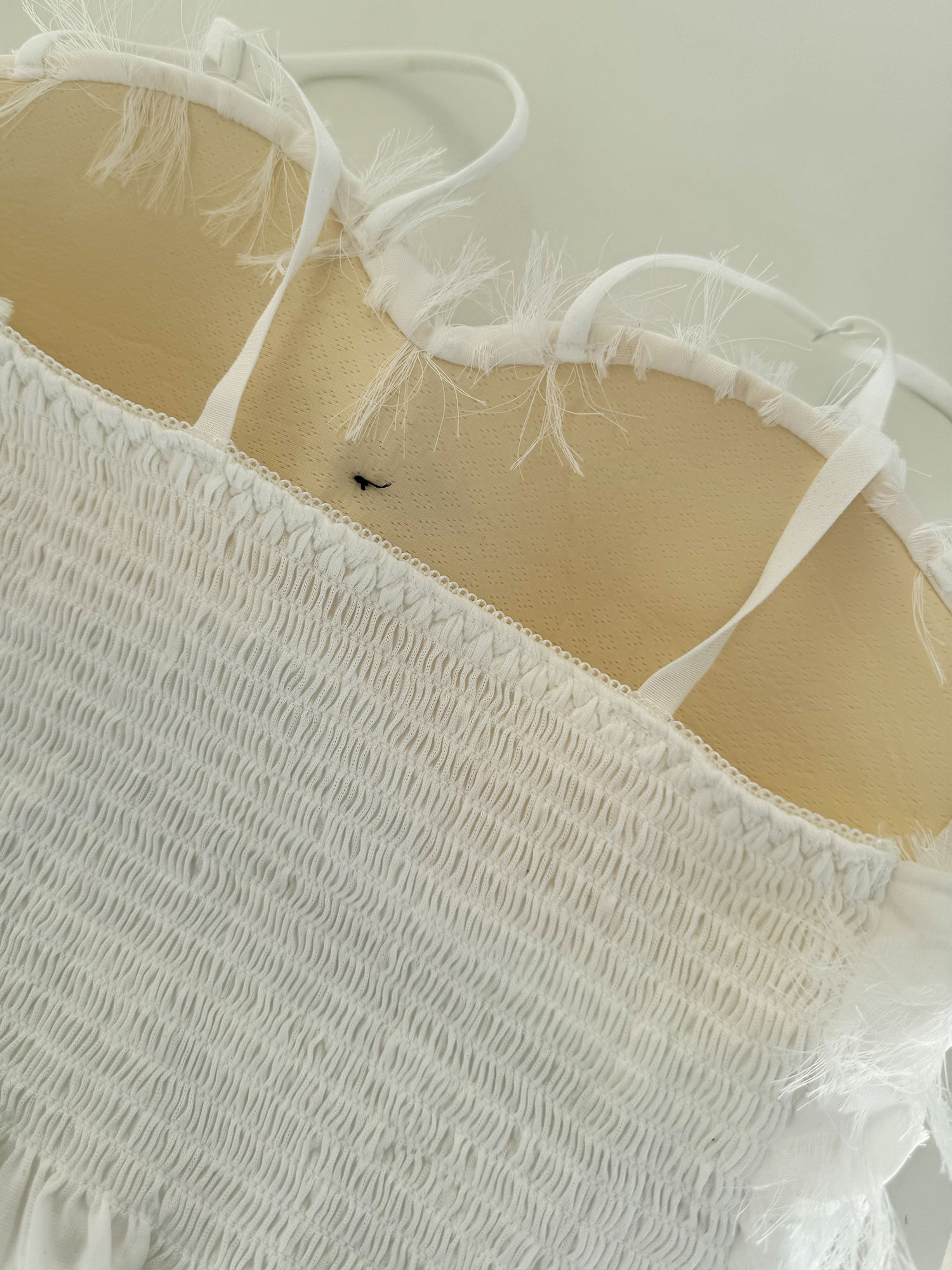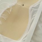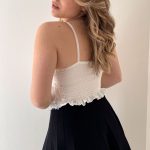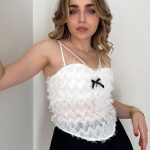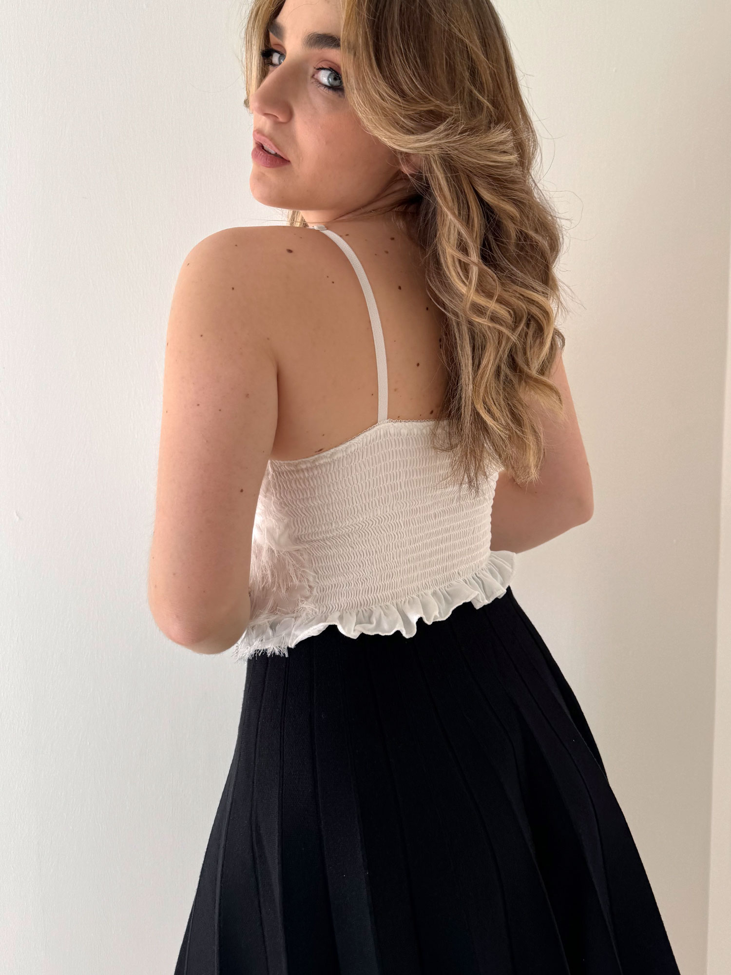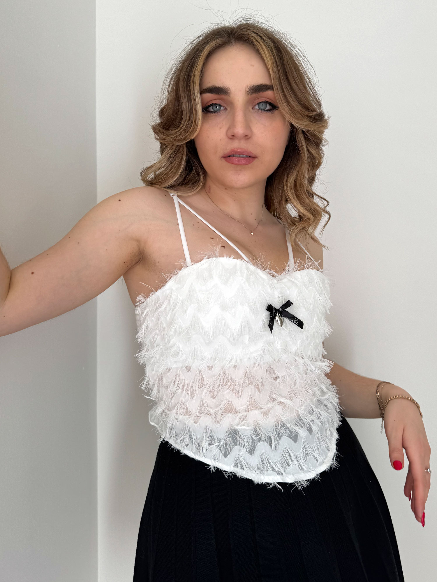 Top bianco con tessuto a composizione geometrica con fragiature a filo in tinta che ricopre la parte trasparente del disegno, arricciuatura posteriore per permettere una vestibilità perfertta per il busto con ruches arricciata finale, applicazione su scollo anteriore di un fiocco color nero con cuore in acciaio come pendente. Spalline regolabili con cordino a triangolo sulla parte anteriore. con coppe interne e elastico di resistenza. Veste da una XS ad una L.