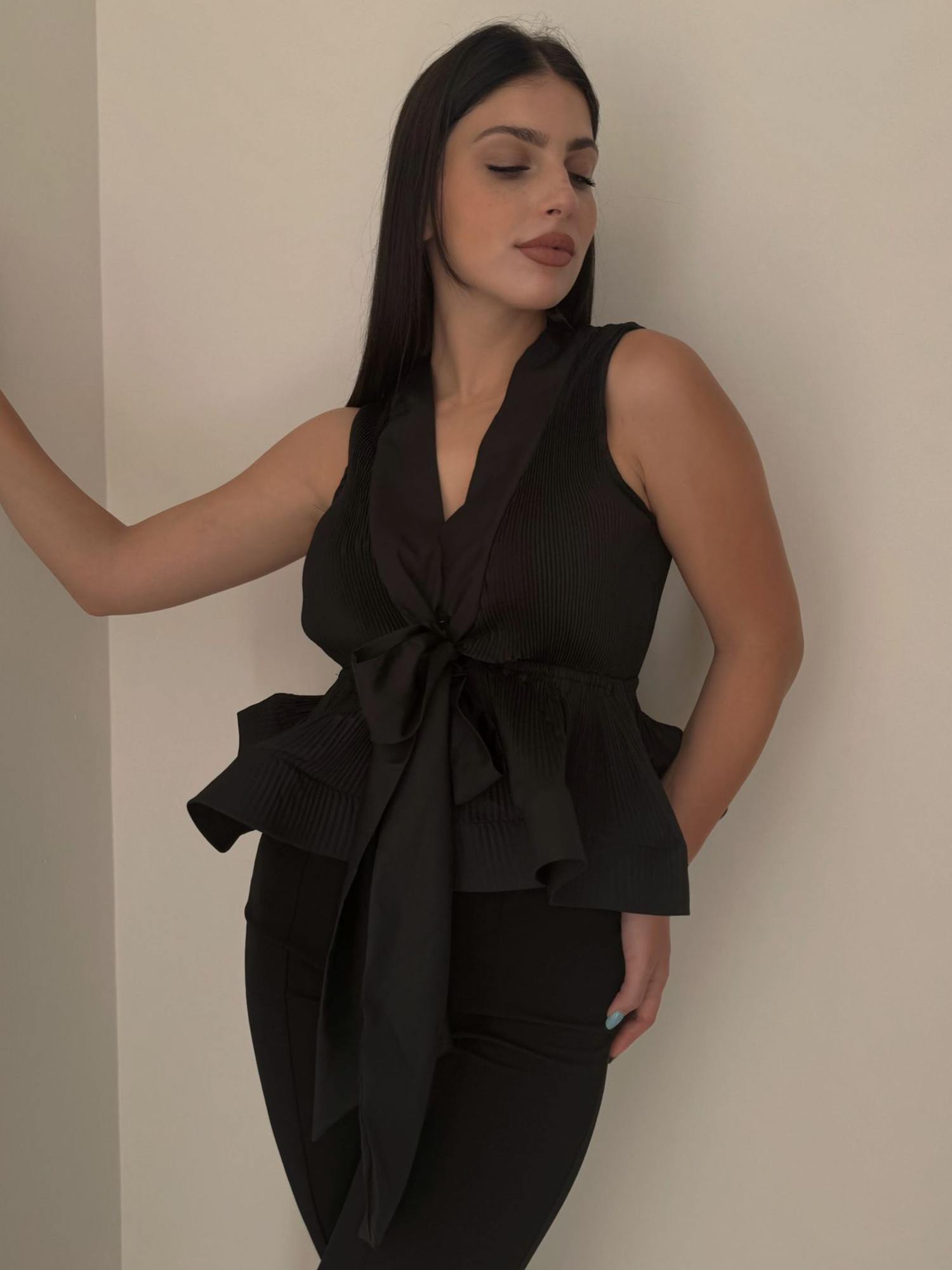 Top nero a giromanica con scollo a V profondo e fiocco decorativo in vita. Caratterizzato da un design plissettato e una balza ampia che parte dalla vita con elastico per un look elegante e femminile.