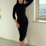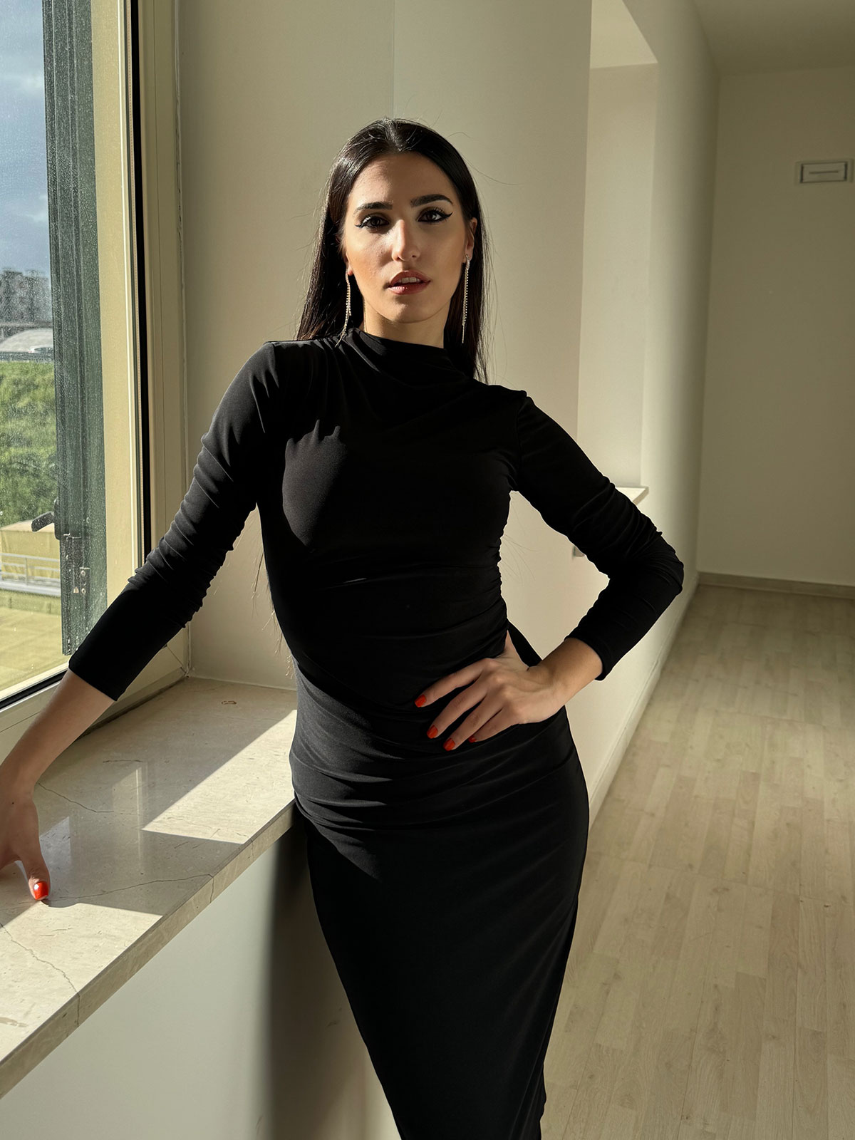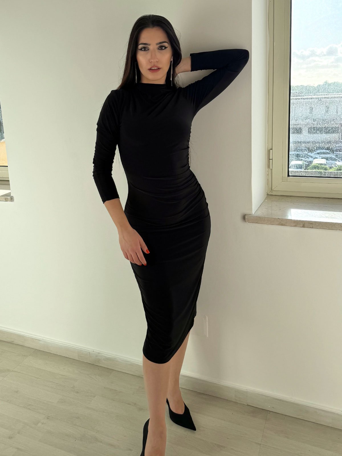 Tubino midi a manica lunga,mezzocollo con arriciature dal busto ai fianchi laterali da creare morbidezza e spacco posteriore verticale.