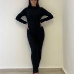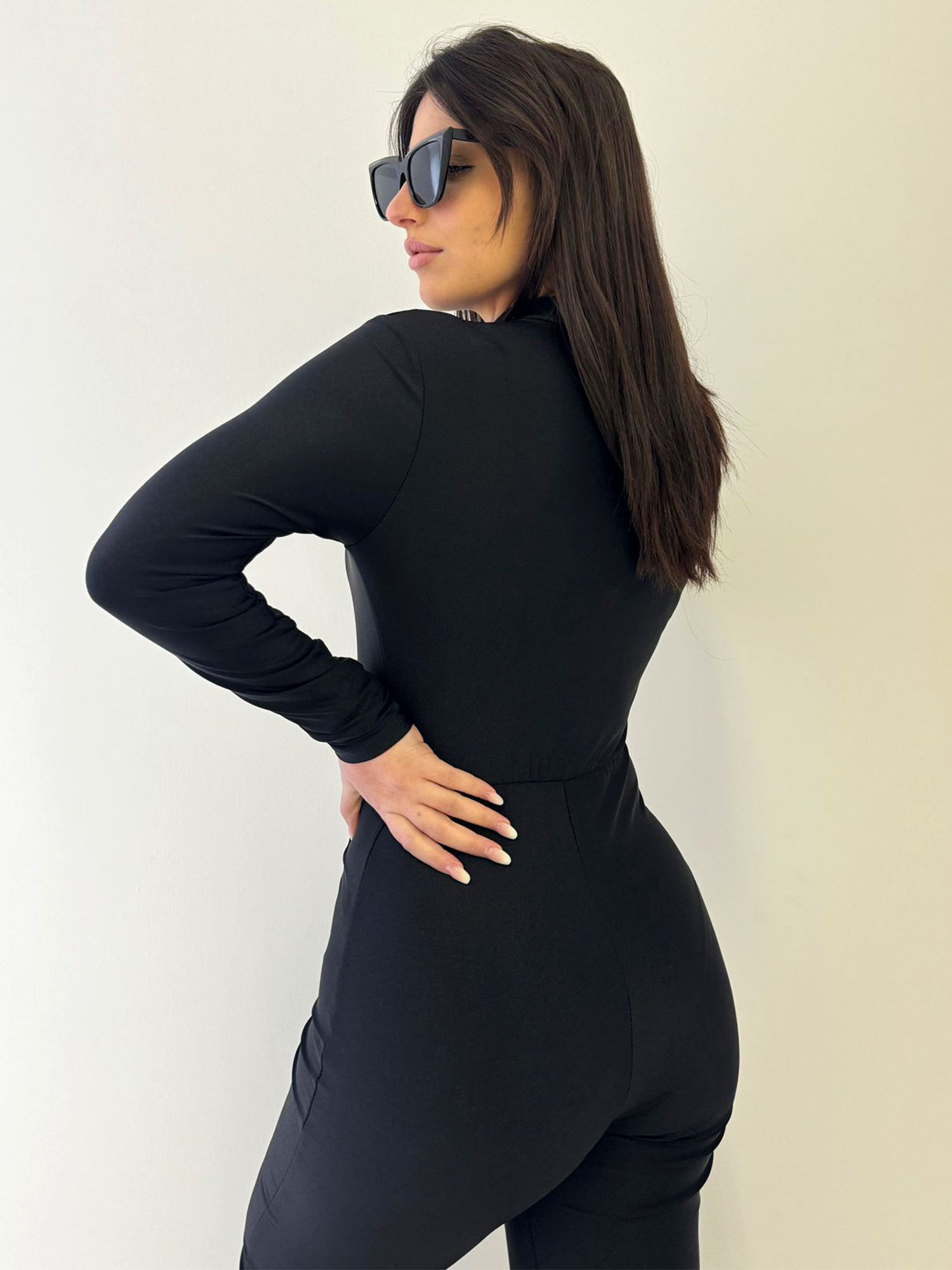 Tuta jumpsuit casual aderente nera a maniche lunghe con zip in tinta su parte frontale, elastico sul fondo della chiena per avidenziare il punto vita. Elastica e modellante.