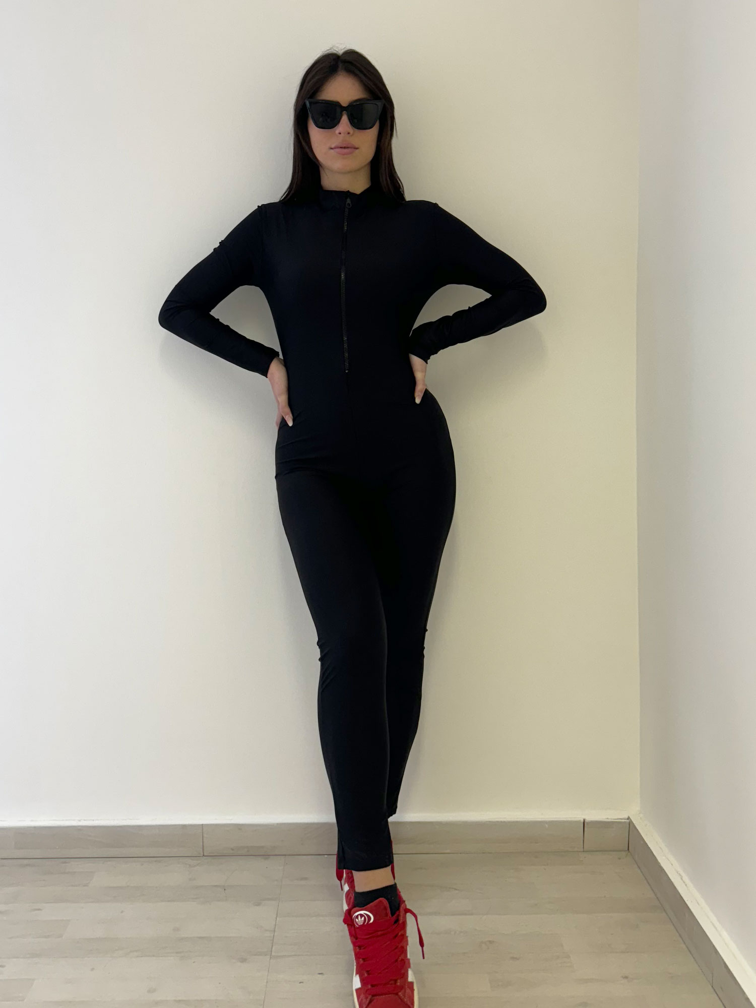 Tuta jumpsuit elastica ed aderente nera maniche lunghe con zip in tinta su parte frontale.